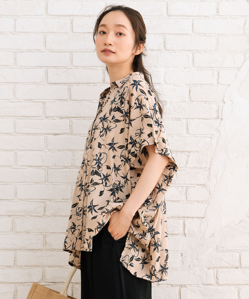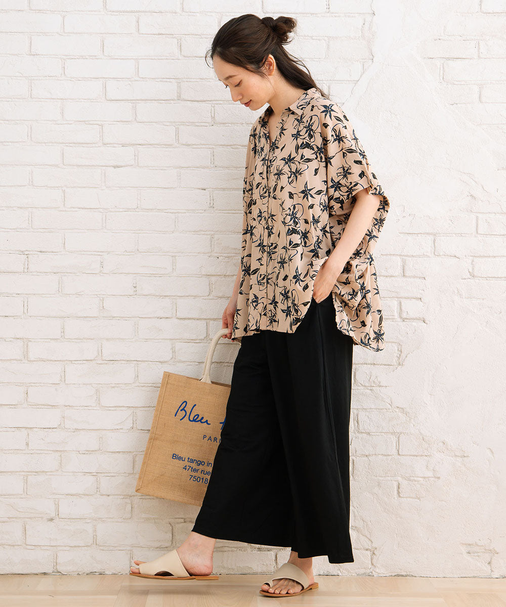 華やかさと抜け感を両立したリーフプリントワイドシャツ。