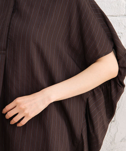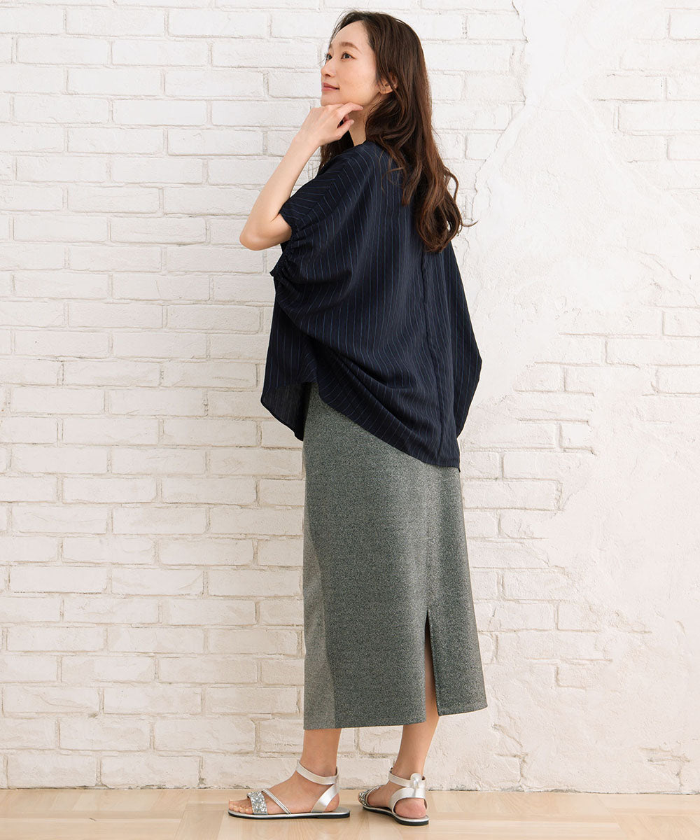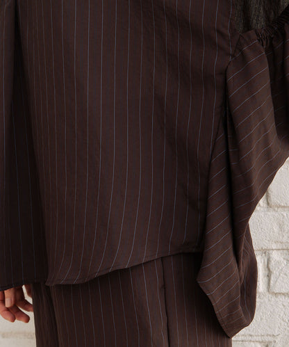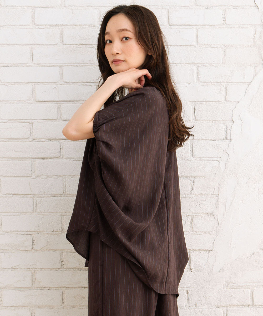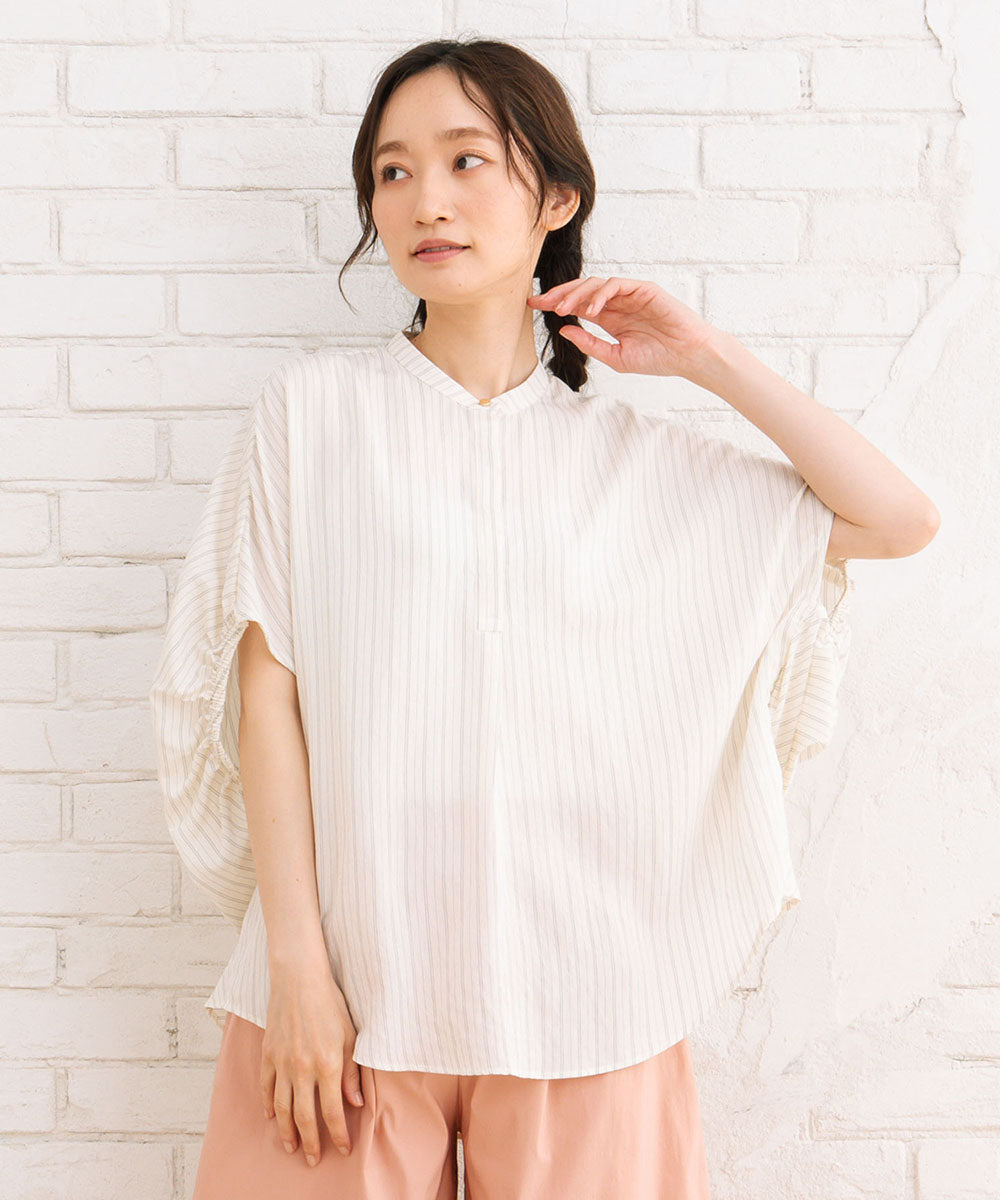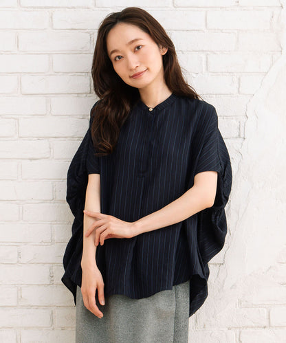 上品なストライプ柄とふんわりとした袖のボリューム感が目を引くダブスストライプギャザーブラウス。