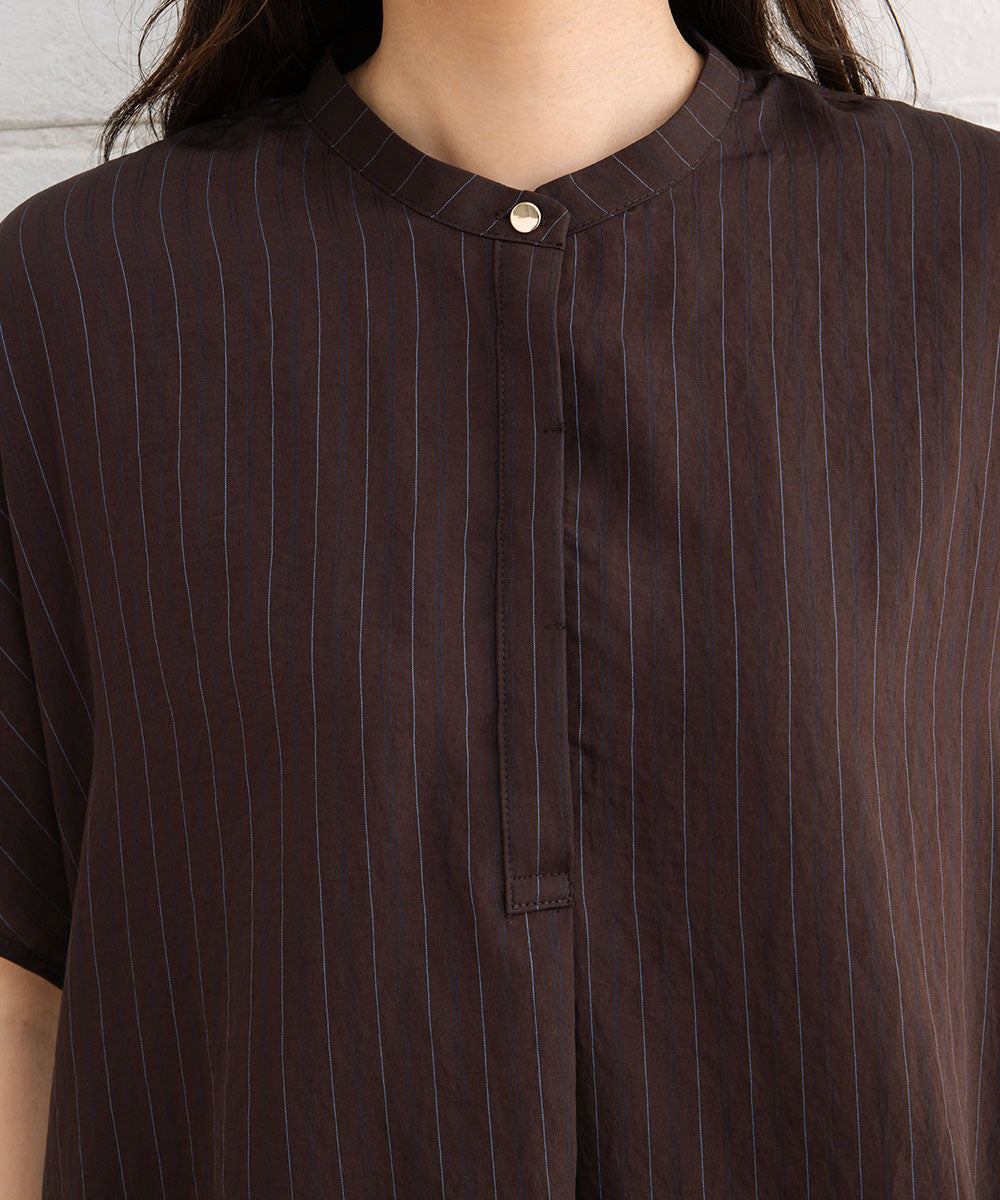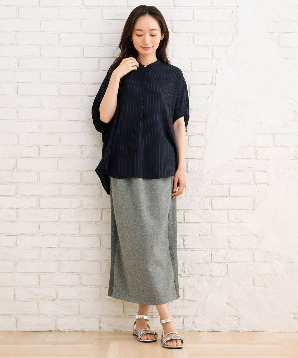 首元はすっきりとしたバンドカラーで顔まわりをシャープに見せつつ、程よい抜け感をプラスしてくれます。