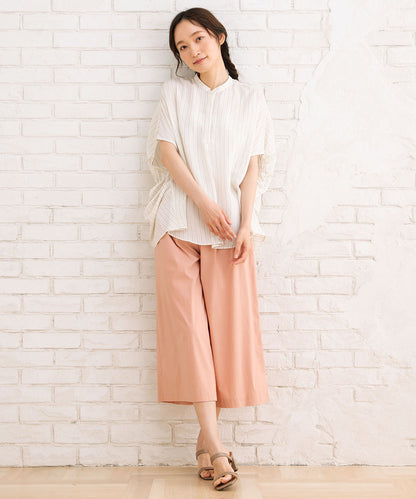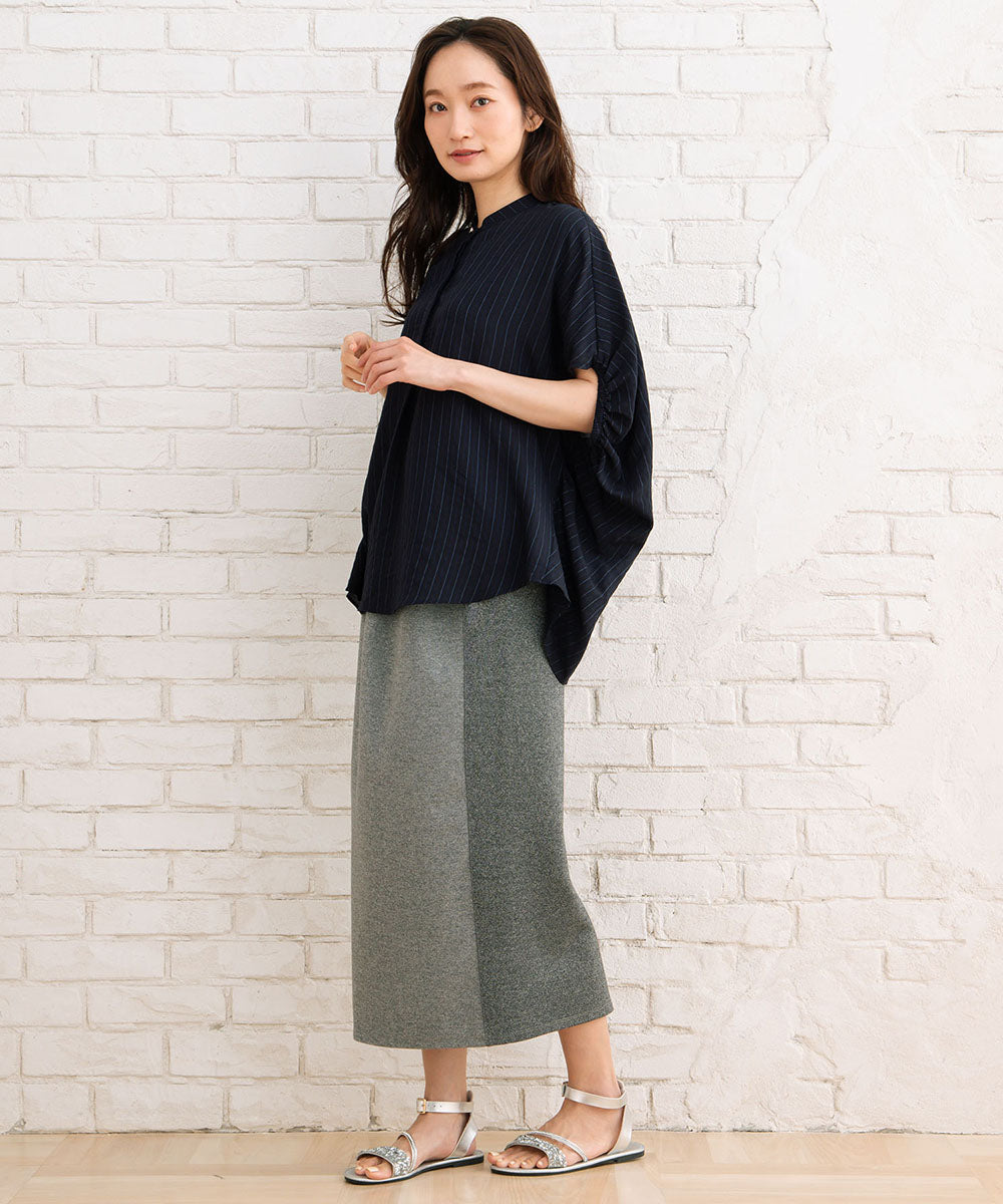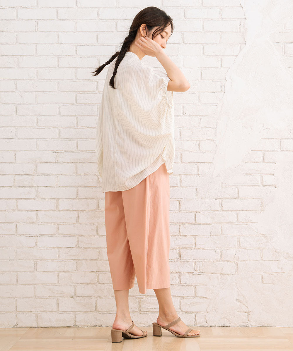 落ち感のある生地に施された繊細なピンタックと、立体的なギャザースリーブが女性らしいニュアンスを演出します。