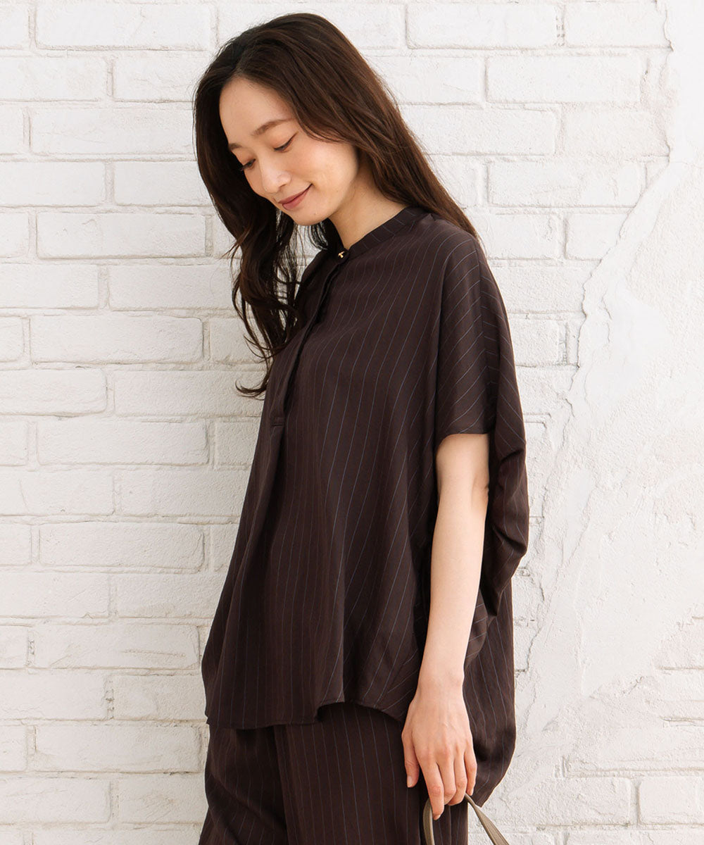落ち感のある生地に施された繊細なピンタックと、立体的なギャザースリーブが女性らしいニュアンスを演出します。