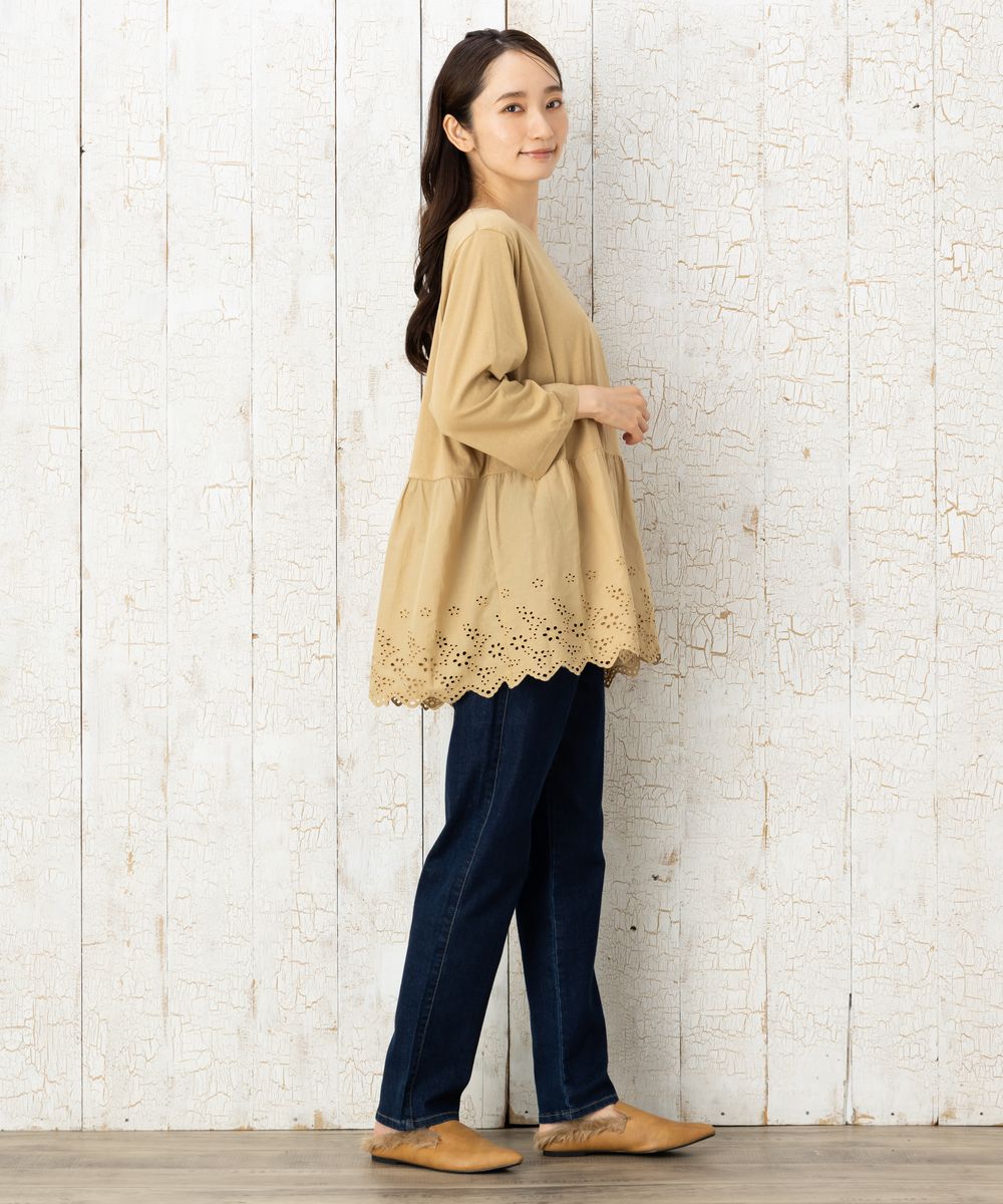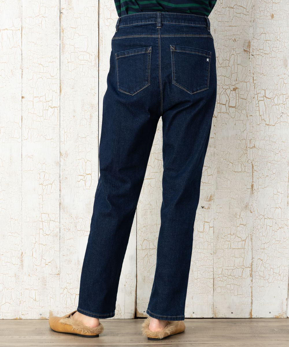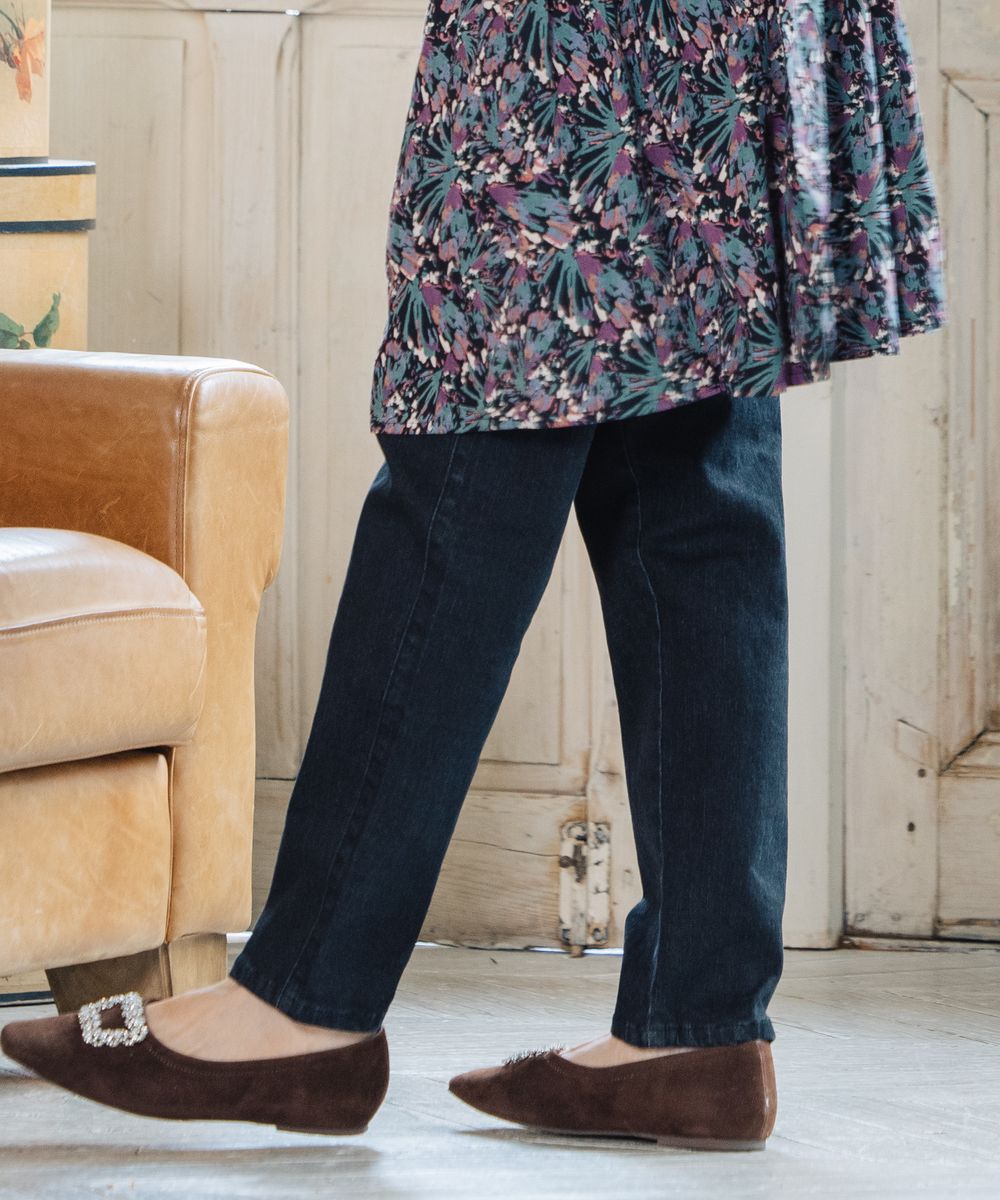 ベーシックアイテムなので、ゆったりシルエットのトップスも、フィット感のあるものも、丈の長めのチュニックにも着映えする万能デニムです。