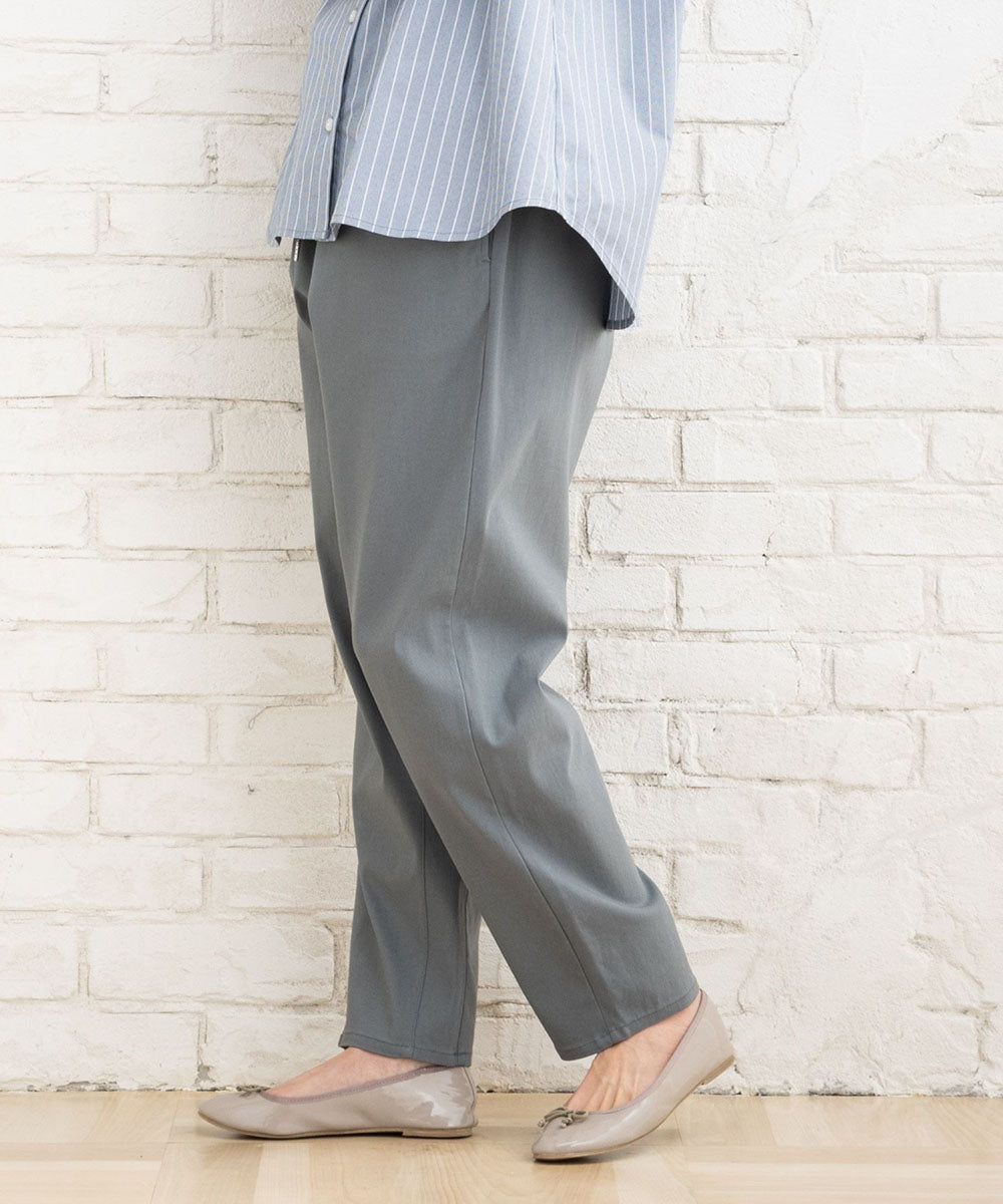 裾にかけて細くなるテーパードデザインで、脚がすっきり見えるシルエットが魅力。