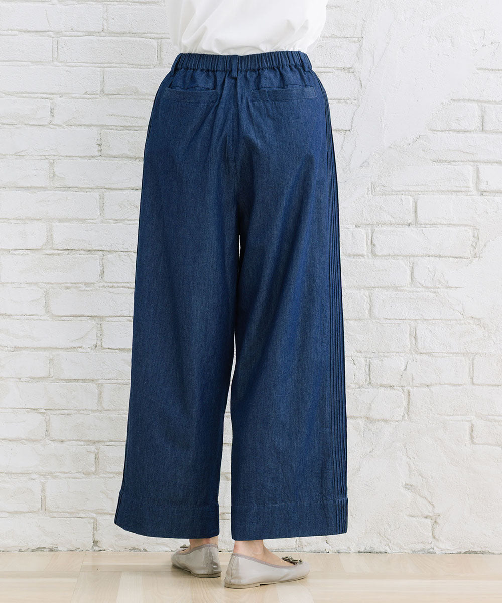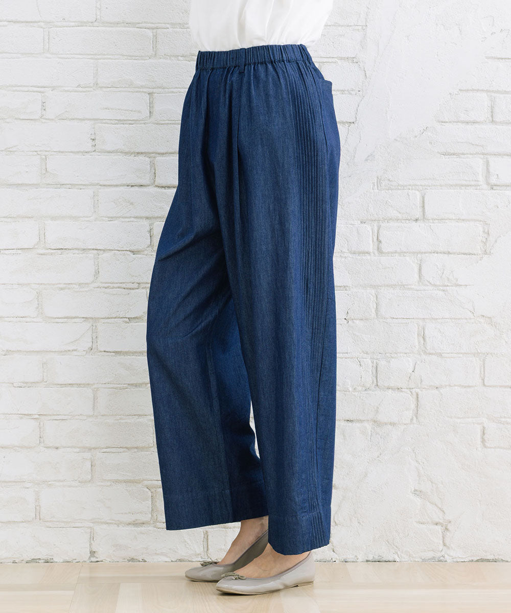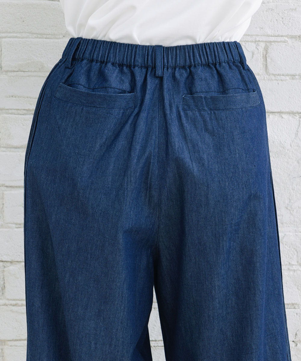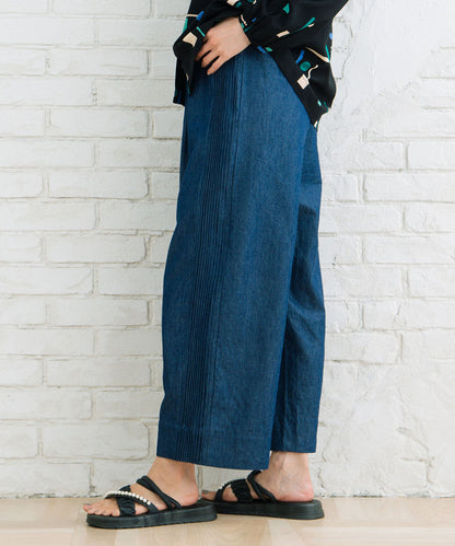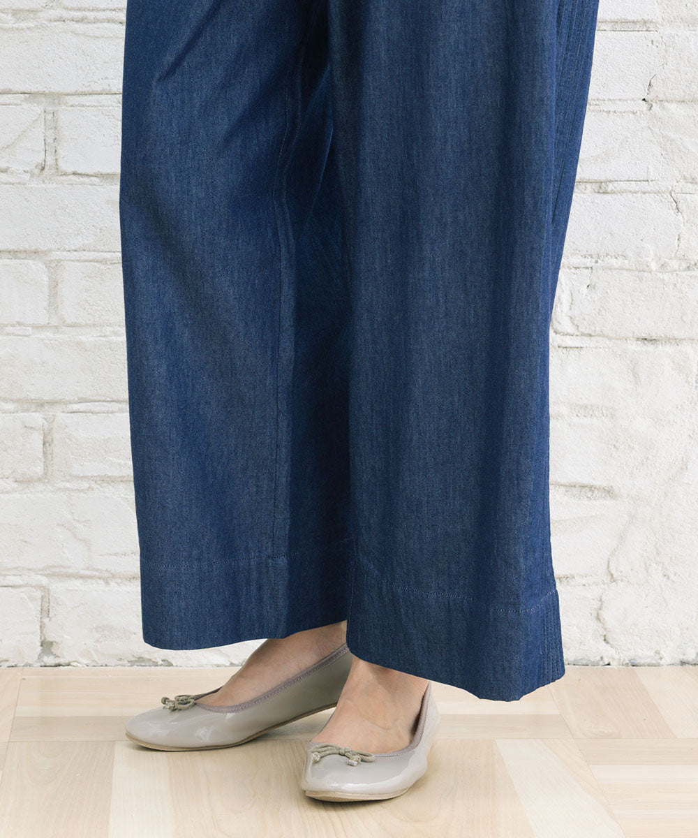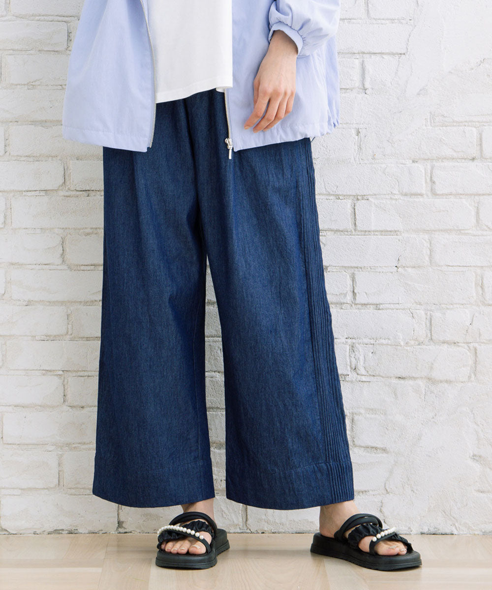 サイドのピンタックがさりげないアクセントのライトデニムピンタックワイドパンツ。