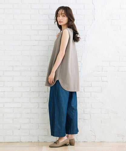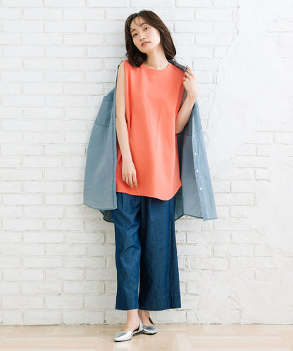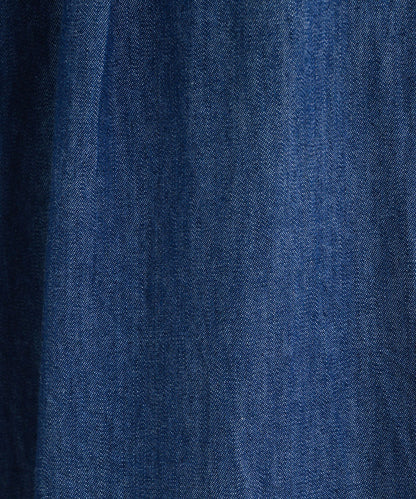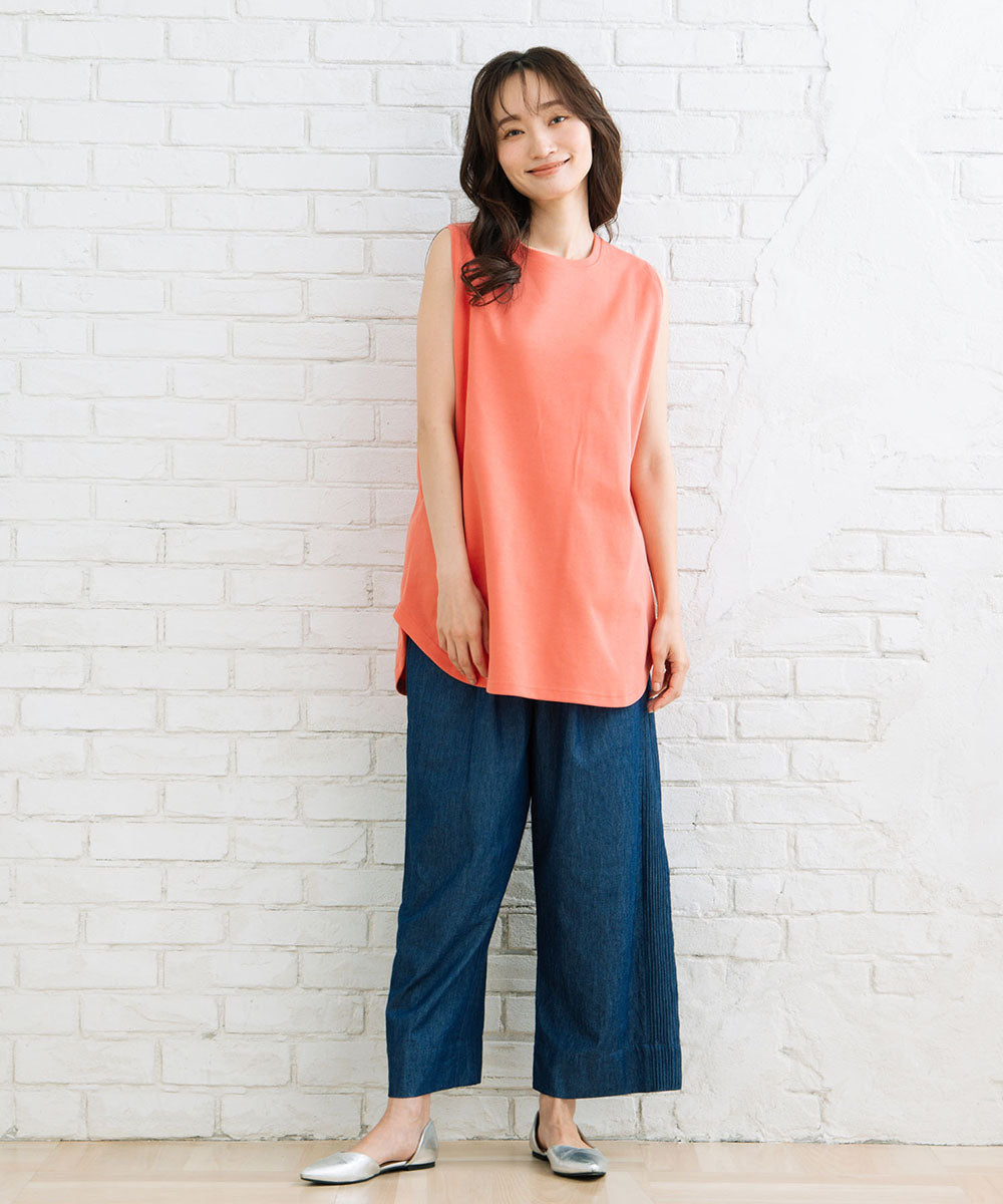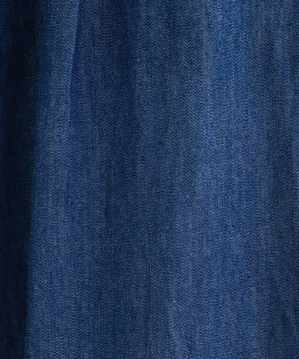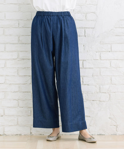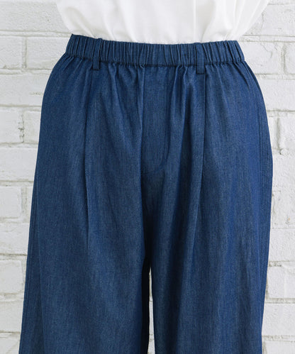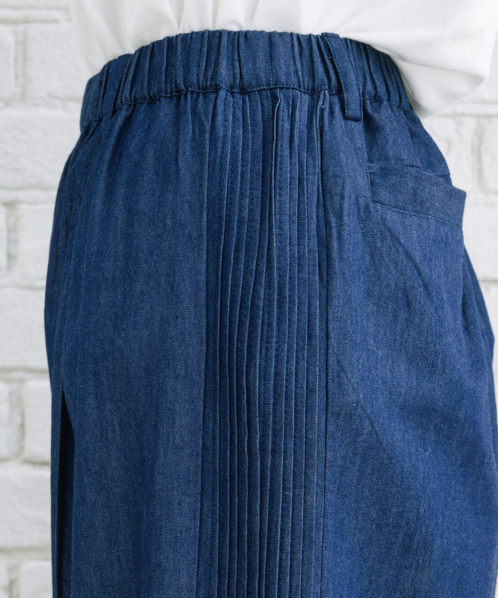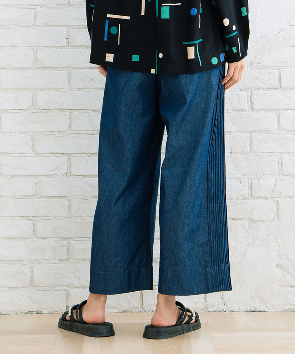 サイドのピンタックがさりげないアクセントのライトデニムピンタックワイドパンツ。