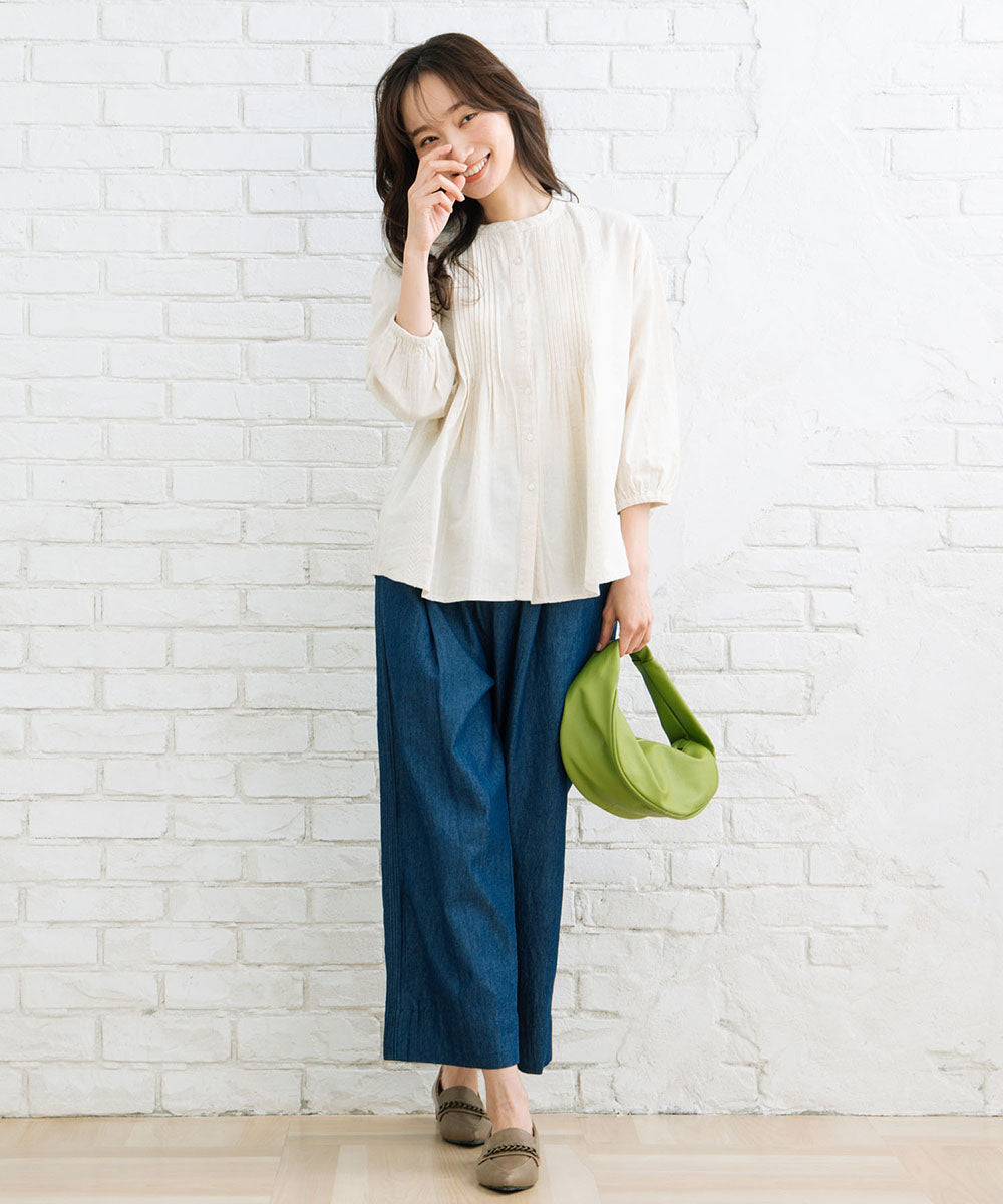シンプルでありながら、両サイドにあるピンタックが周りと差がつく、おしゃれ見えアイテムです。