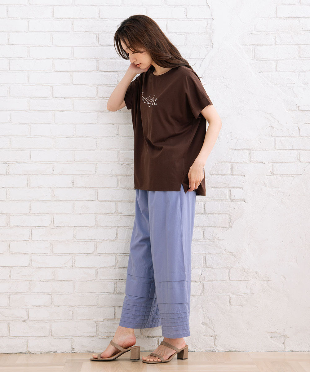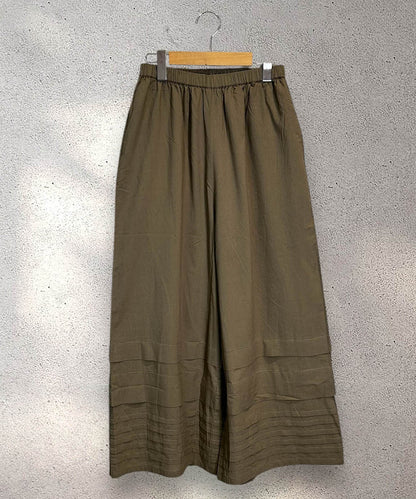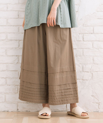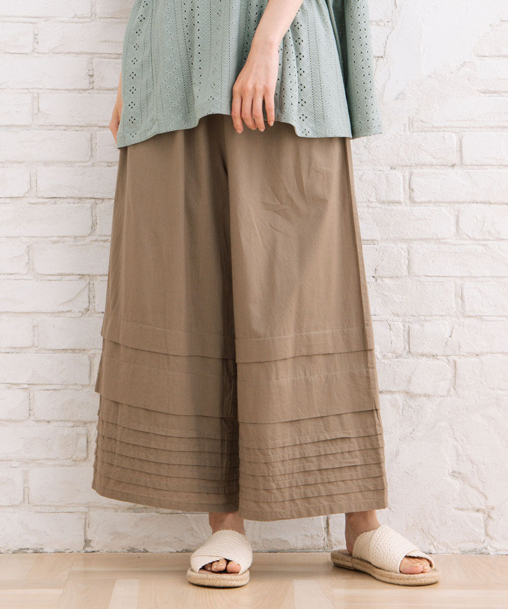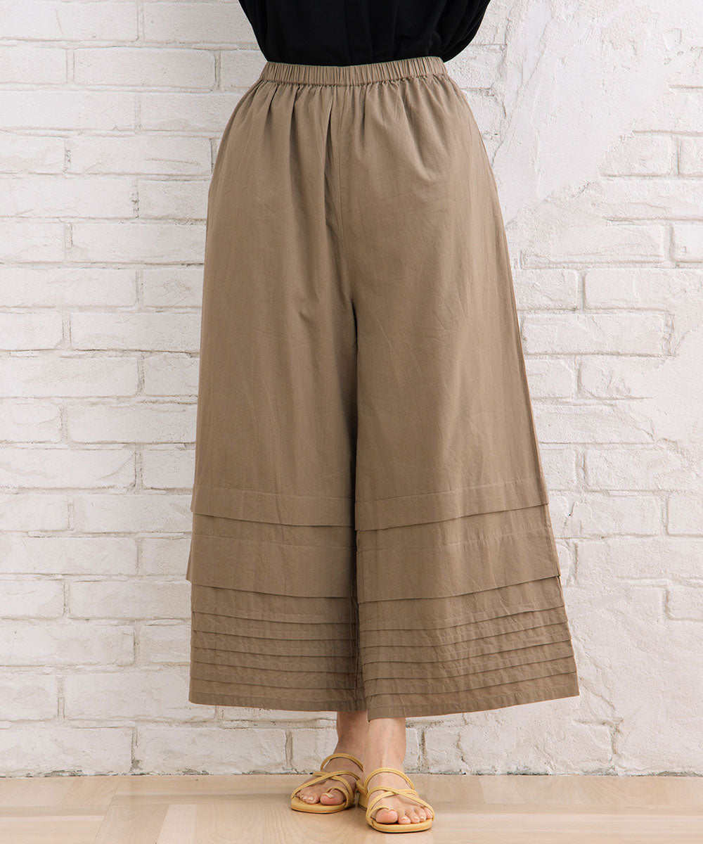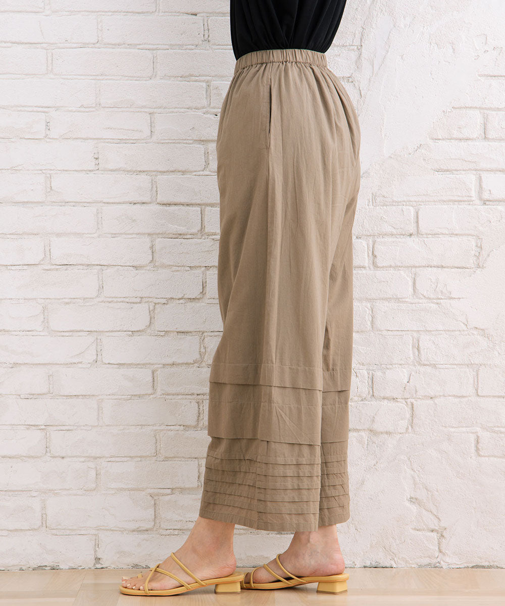 裾のタックデザインが、シンプルなワイドパンツに表情をプラス。