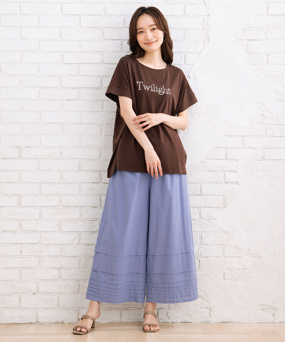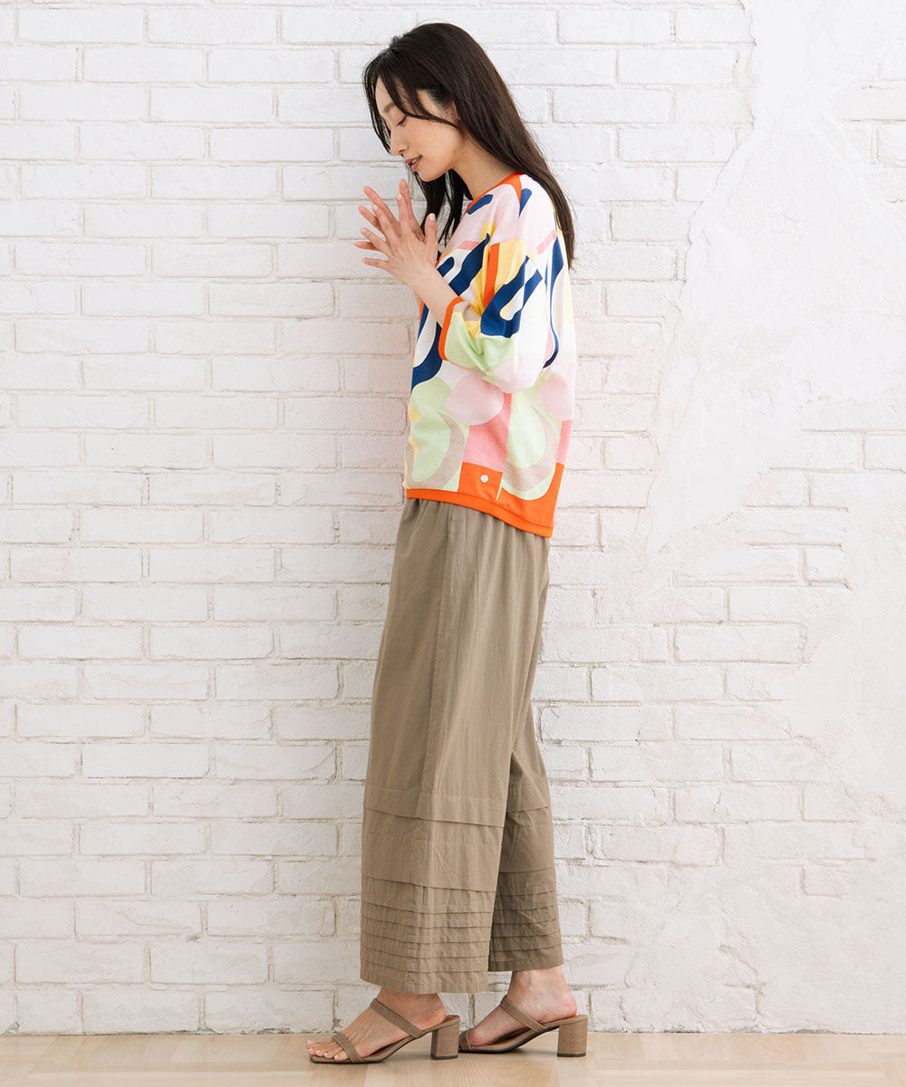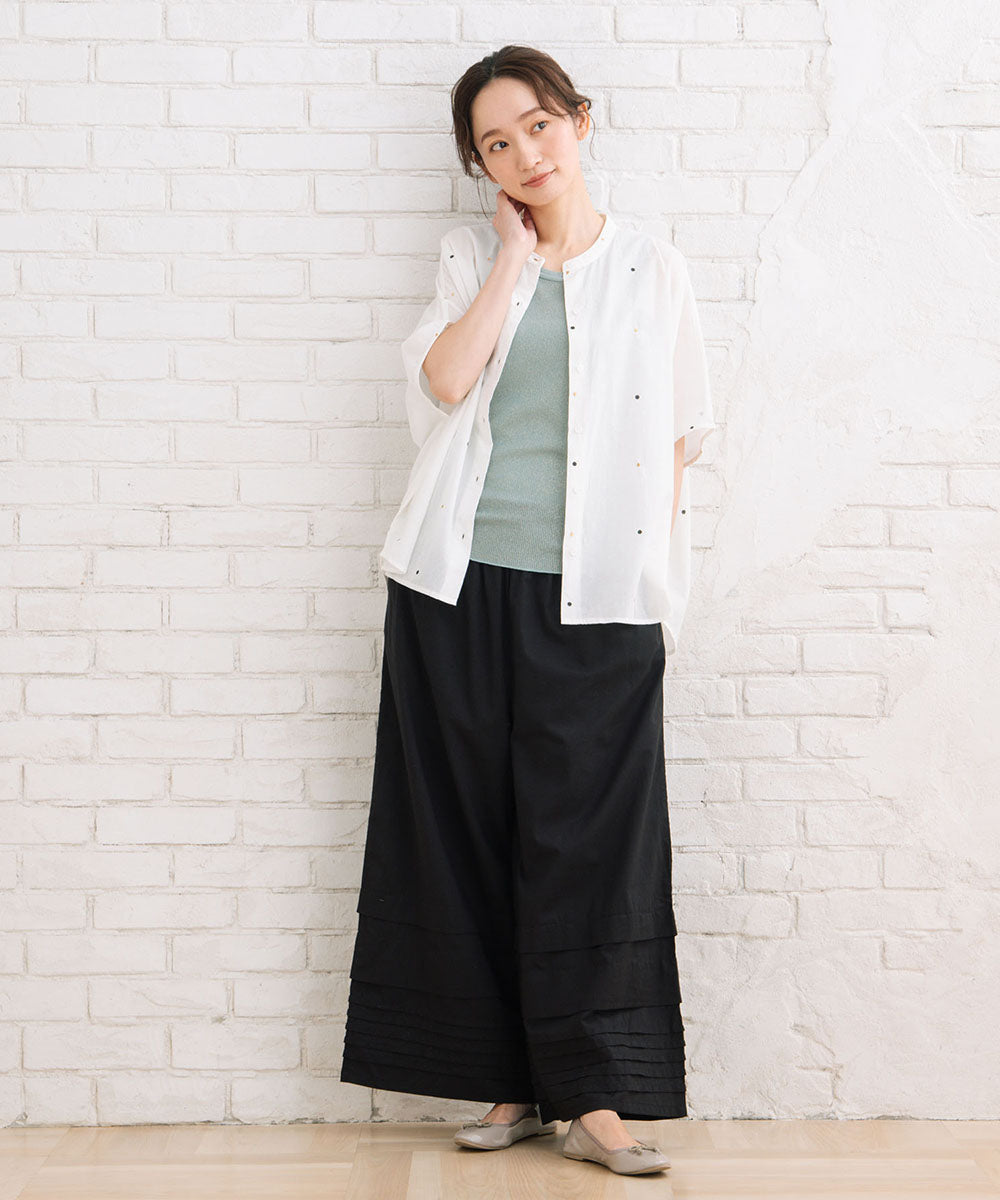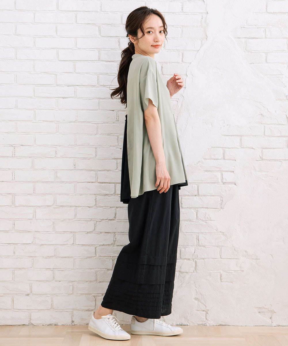 裾のタックデザインが、シンプルなワイドパンツに表情をプラス。