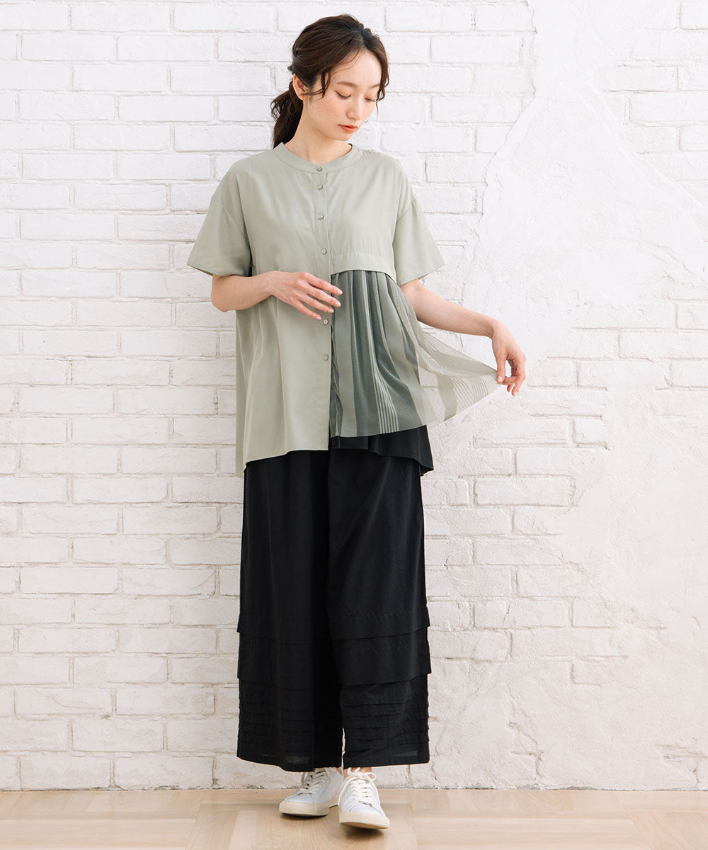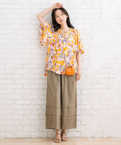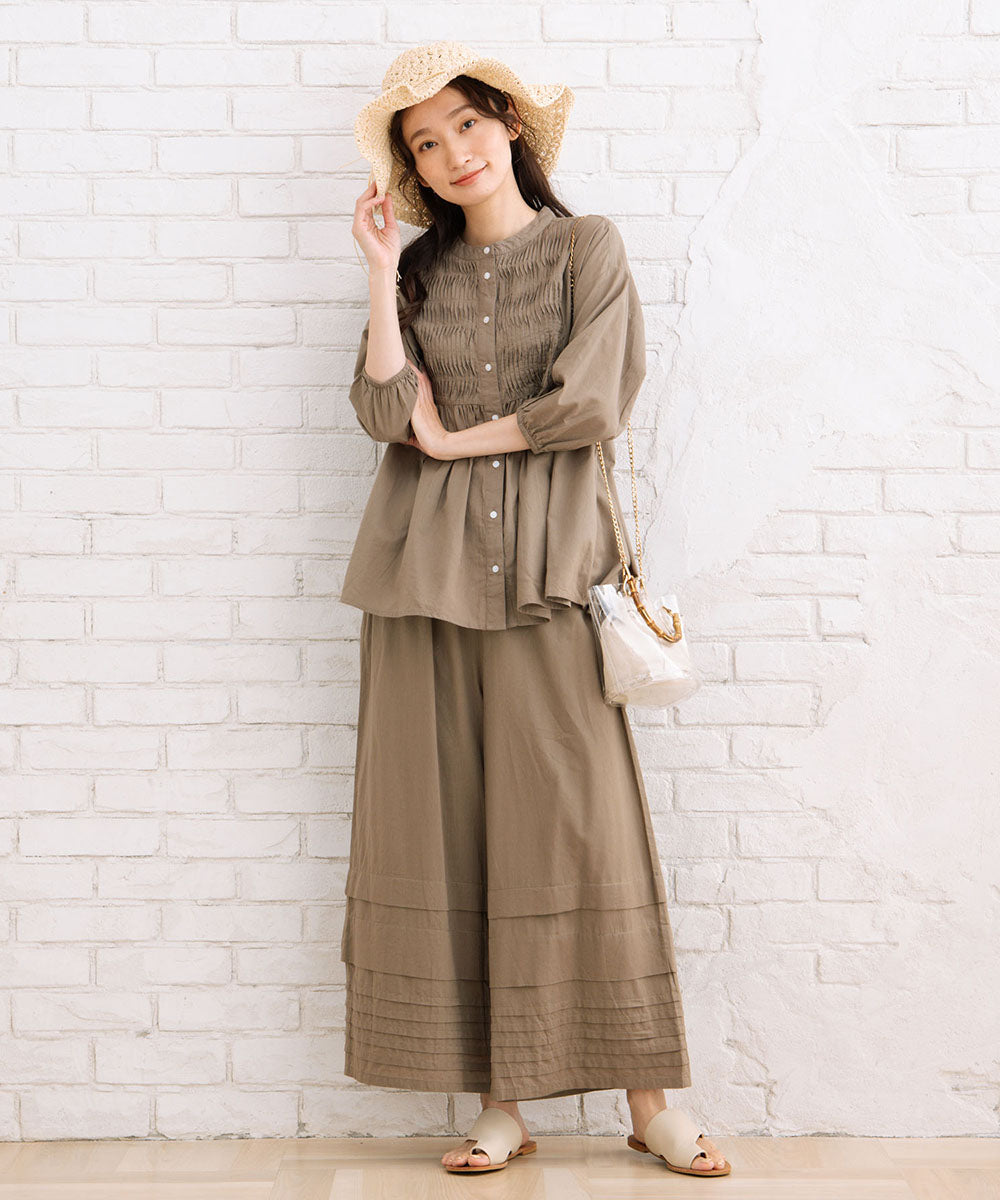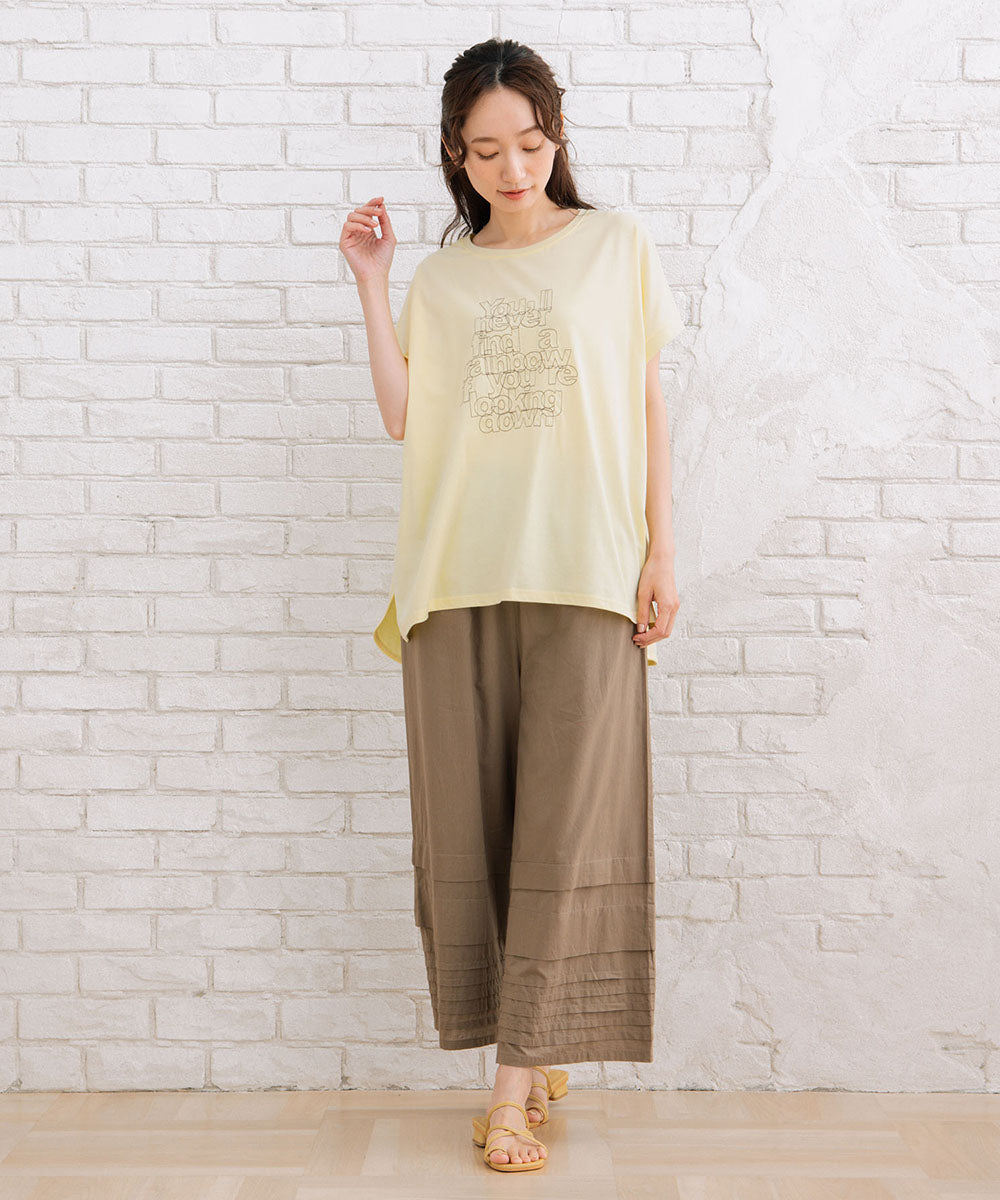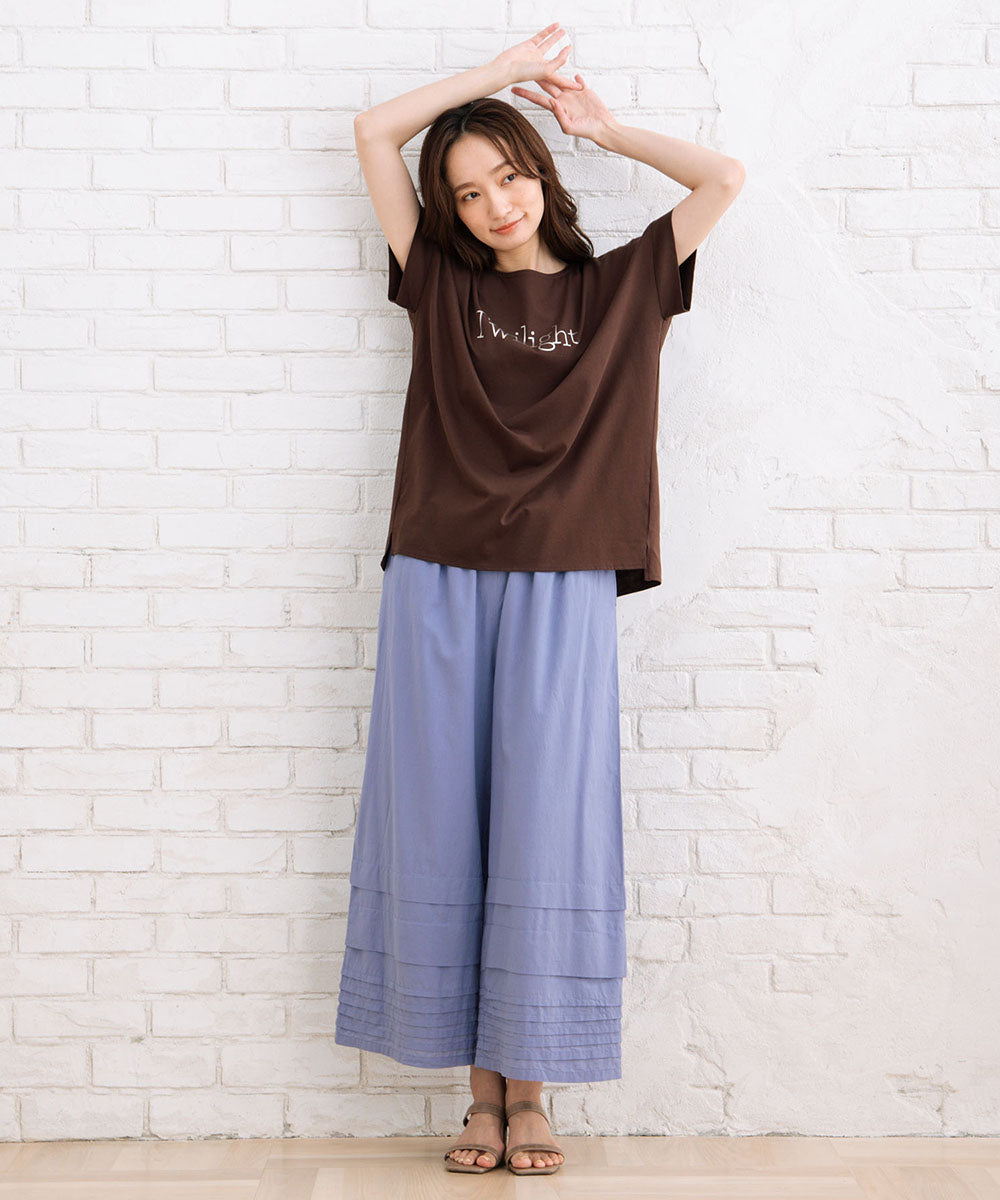 裾のタックデザインが、シンプルなワイドパンツに表情をプラス。