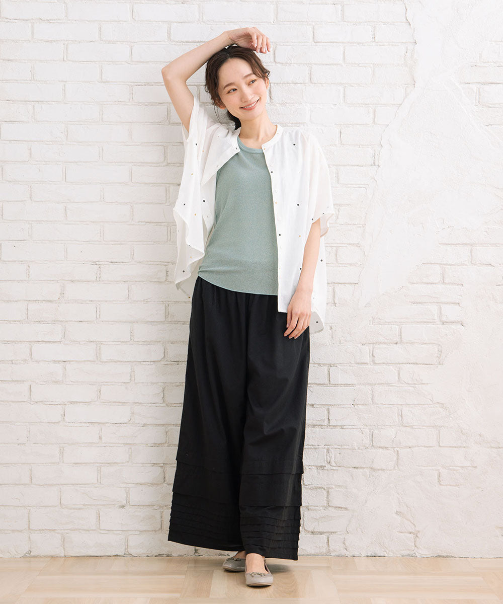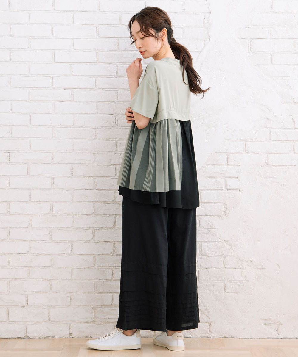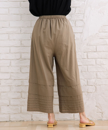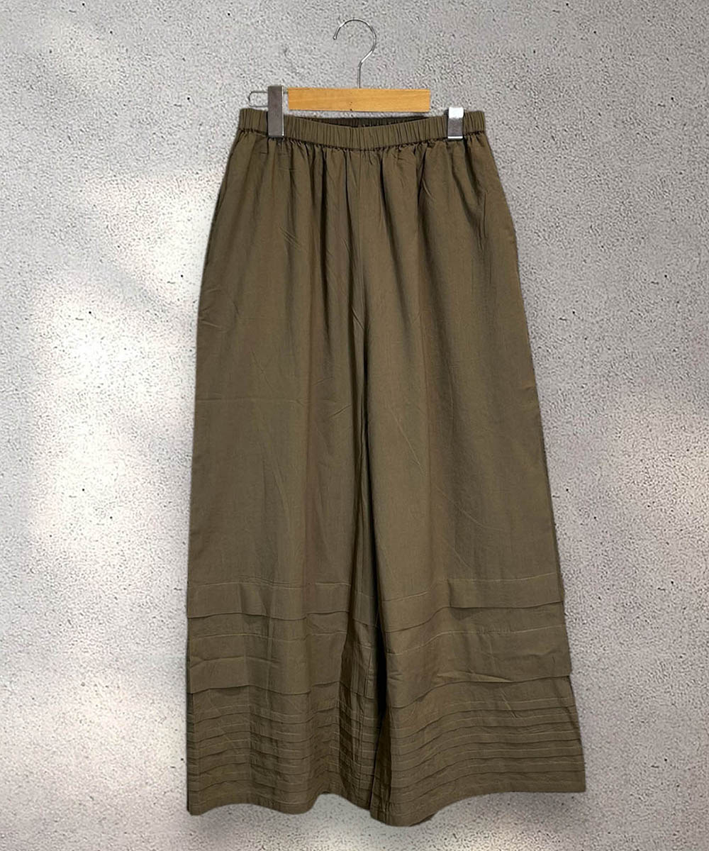 裾のタックデザインが、シンプルなワイドパンツに表情をプラス。