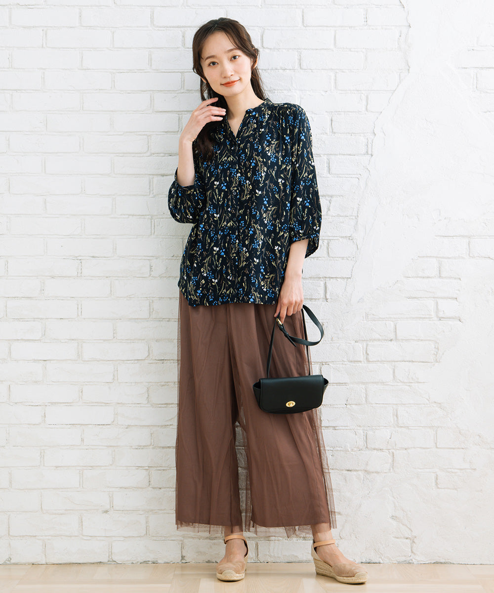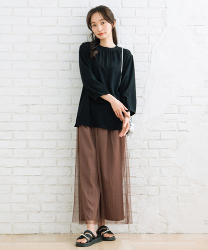 シンプルなワイドパンツにチュールを重ねたパンツは、履くだけでトレンドライクな着こなしに。