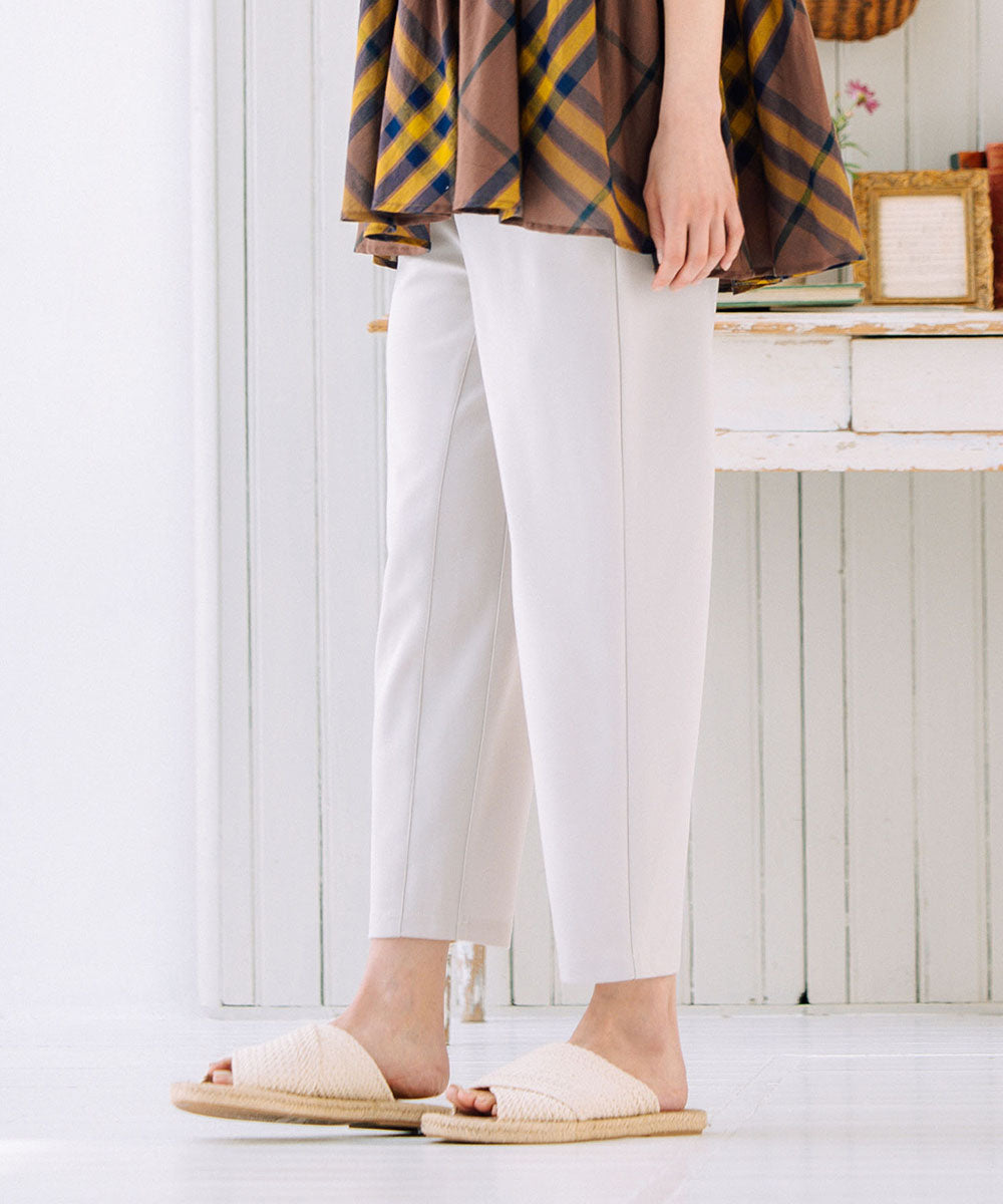 美脚効果抜群のテーパードシルエットは、程よい光沢感で、オフィススタイルに上品さをプラスしてくれます。