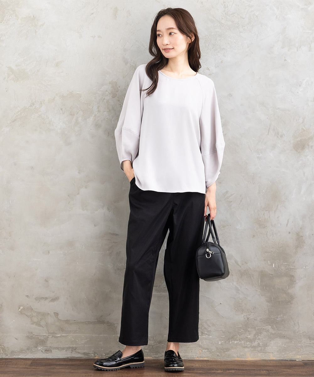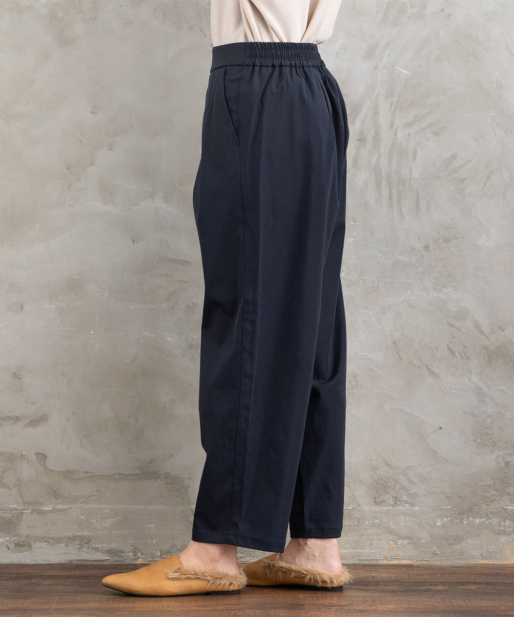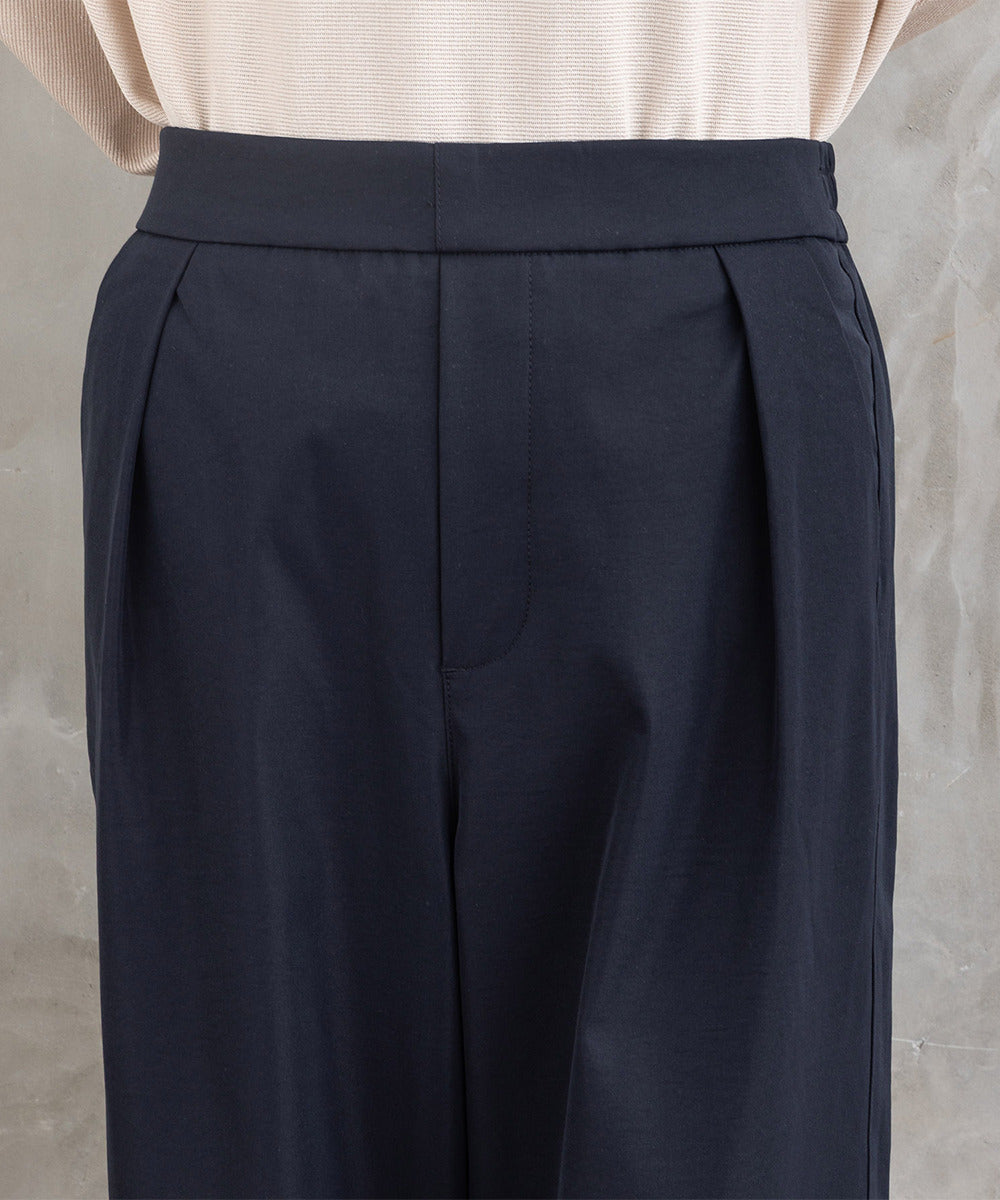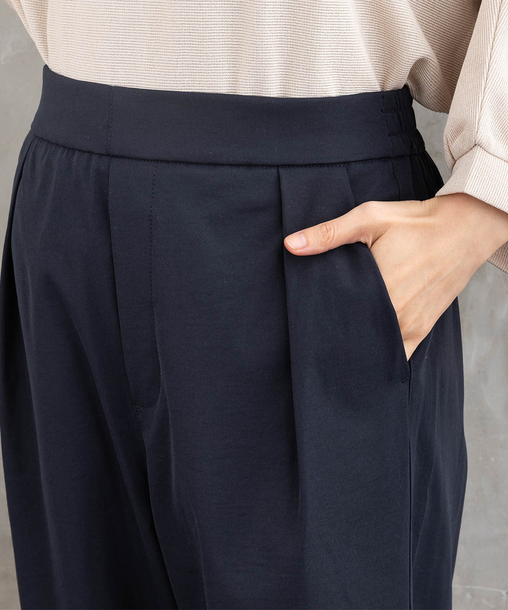 フロントに入ったタックが腰まわりに程よいゆとりを生み、気になるラインをカバーしながらすっきり見せてくれるセミワイドパンツ。
