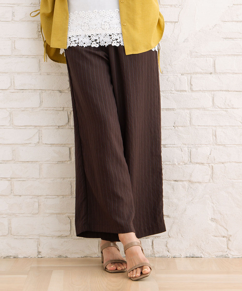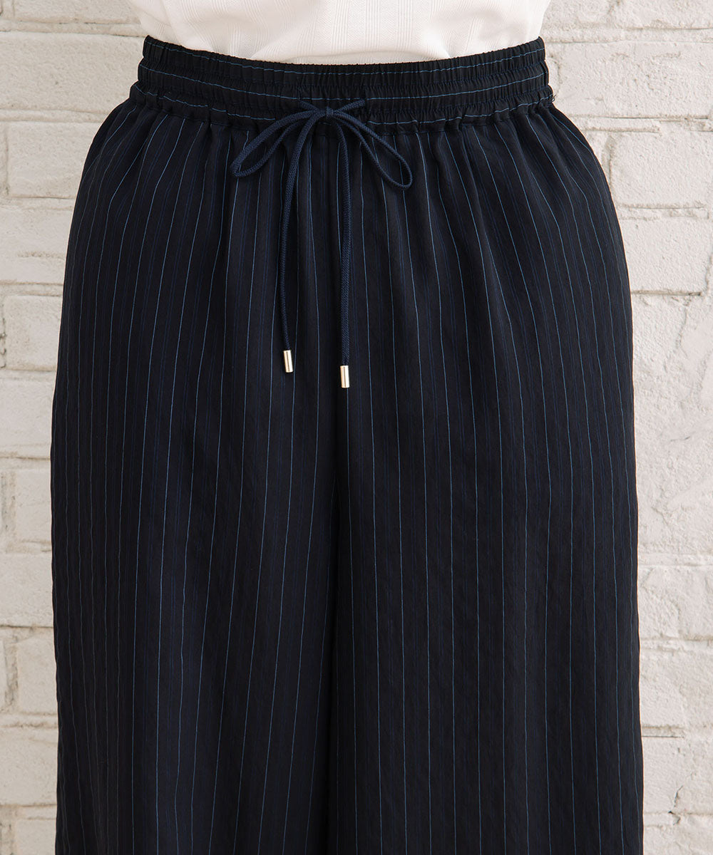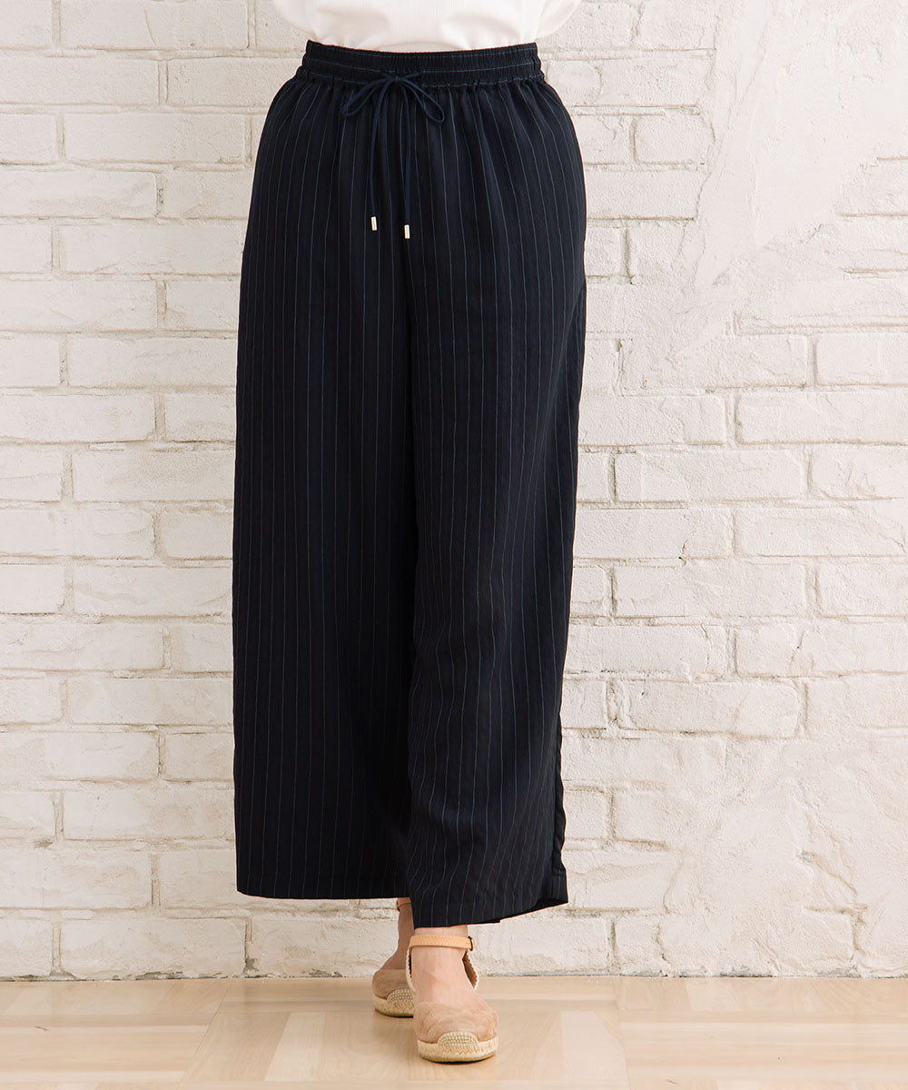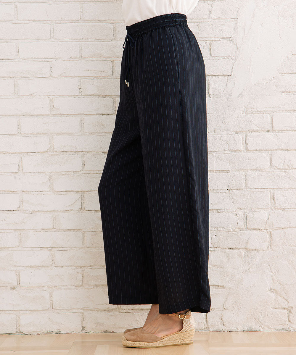縦のラインを強調する繊細なストライプが美しい、上品仕上げのダブルストライプワイドパンツ。
