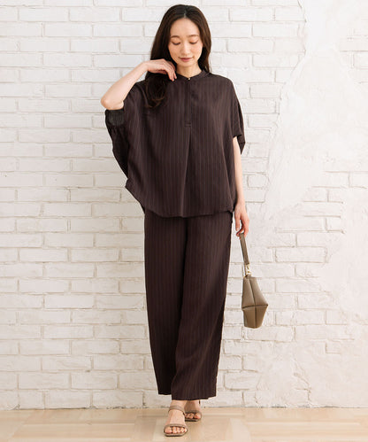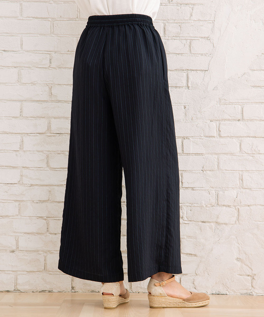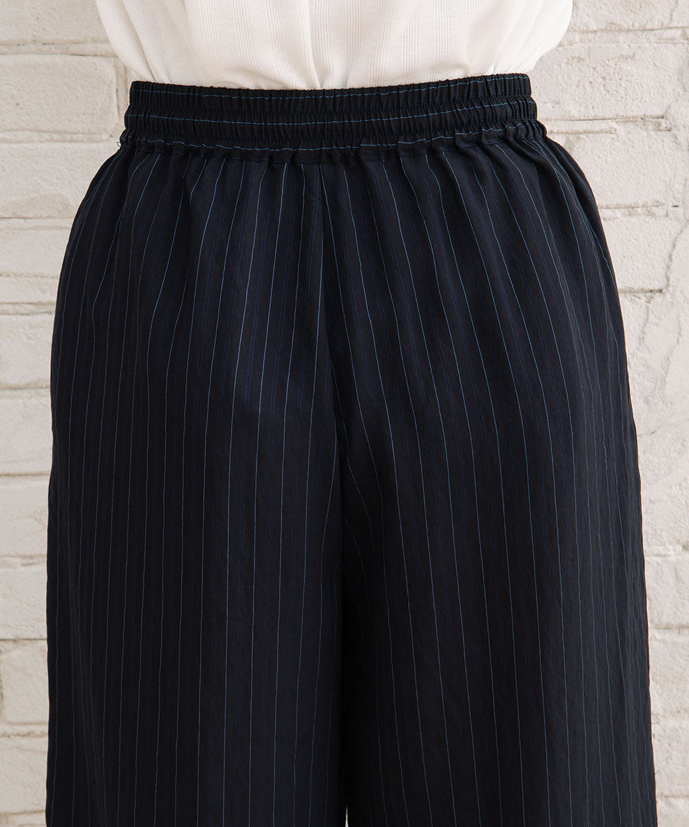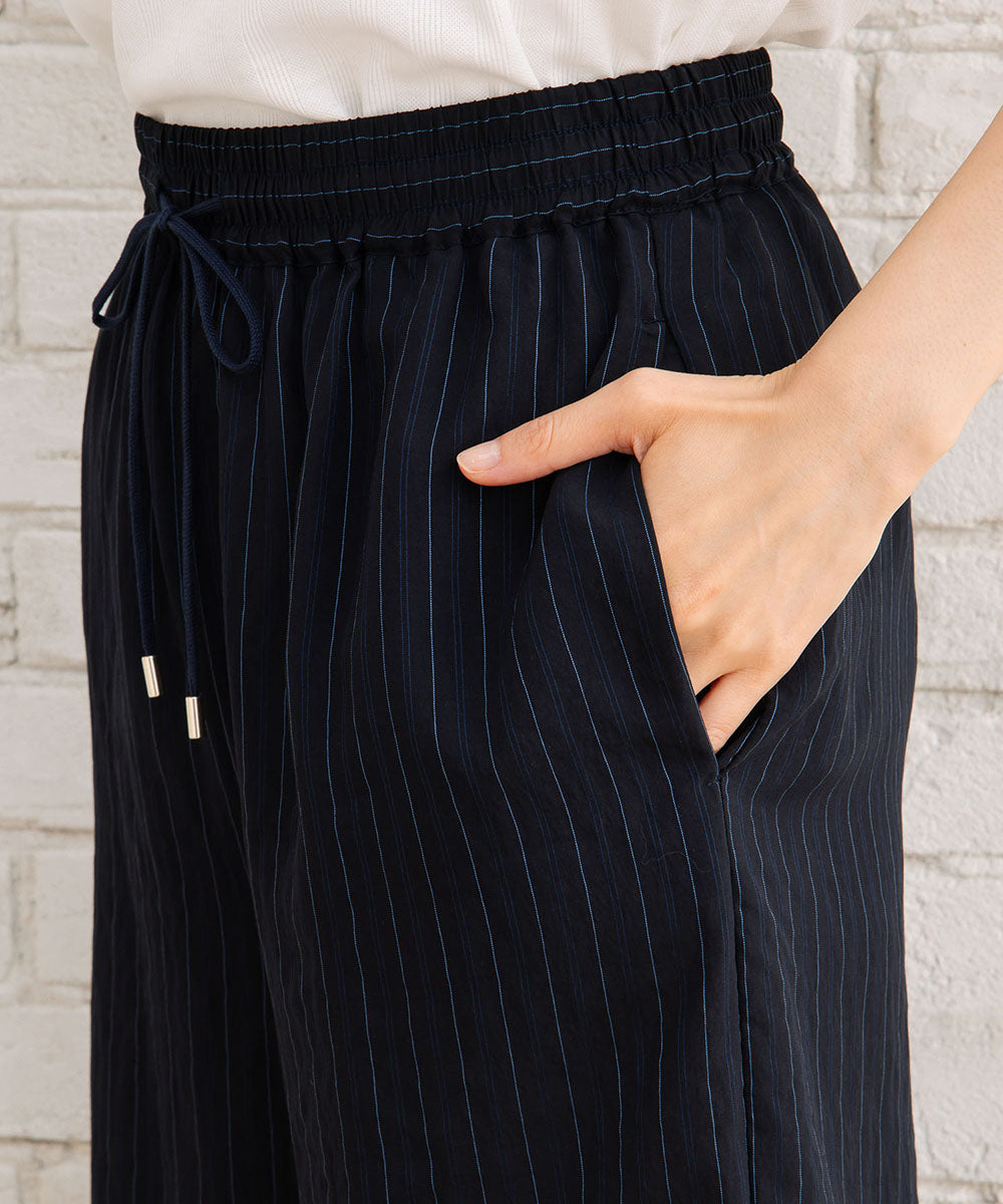 縦のラインを強調する繊細なストライプが美しい、上品仕上げのダブルストライプワイドパンツ。