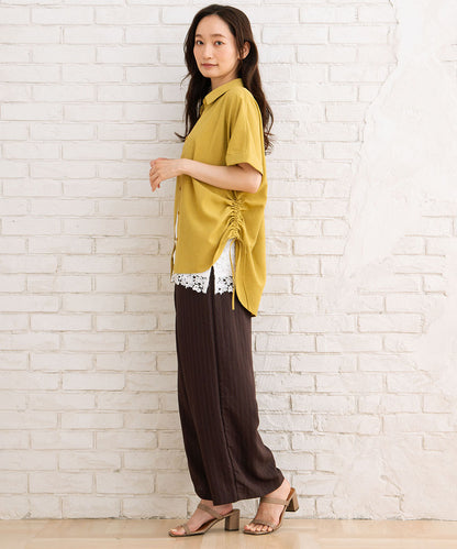 ほんのり光沢のある生地が動きに合わせて揺れ、きれいめな印象を演出します。