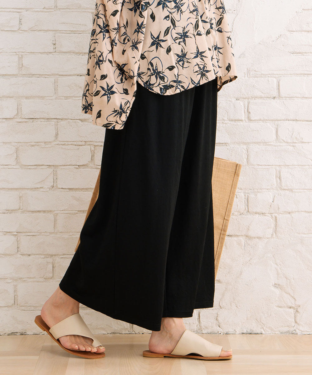 ウエストは総ゴム仕様で締めつけ感がなく、ゆったりとしたシルエットが脚のラインを自然にカバーしてくれます。