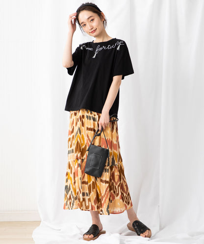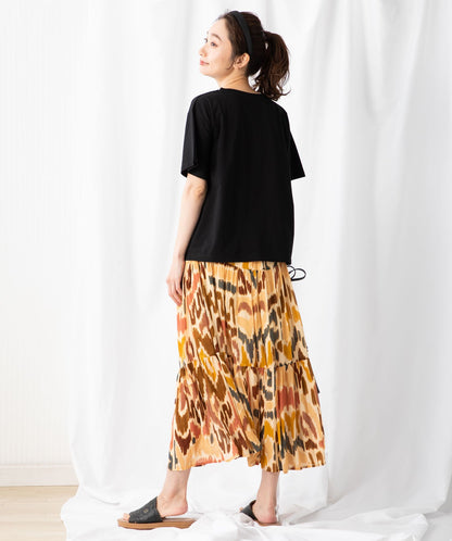 シンプルなTシャツと合わせ、スカートを主役にした着こなしがオススメです。