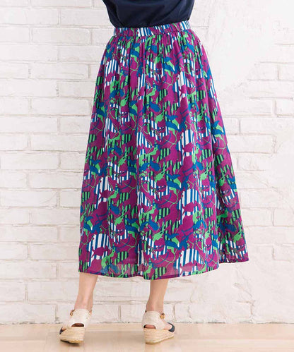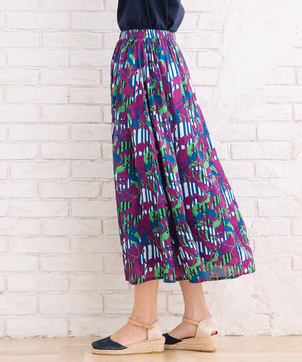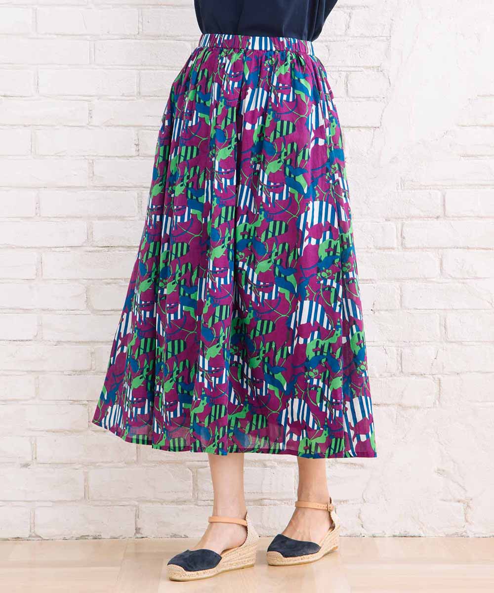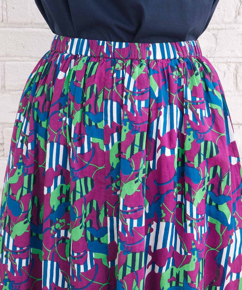 ビビッドなカラーリングが目を惹く、バインプリントがストライプ生地に映えるスカート。