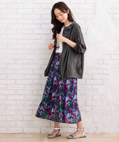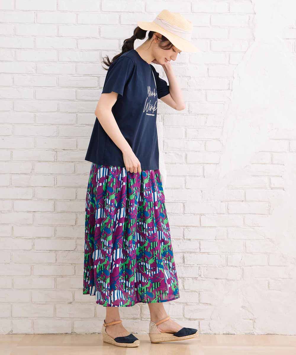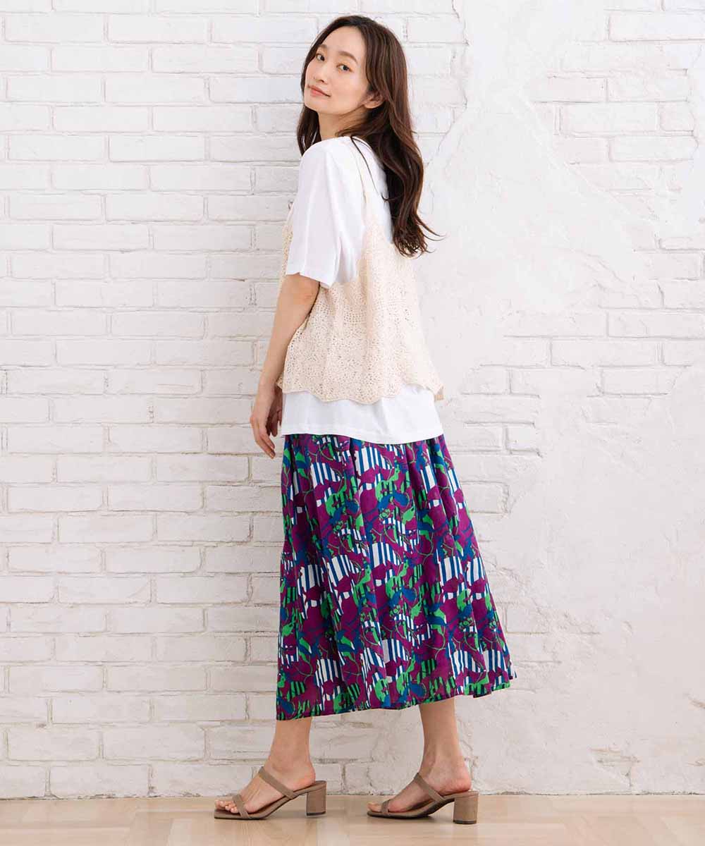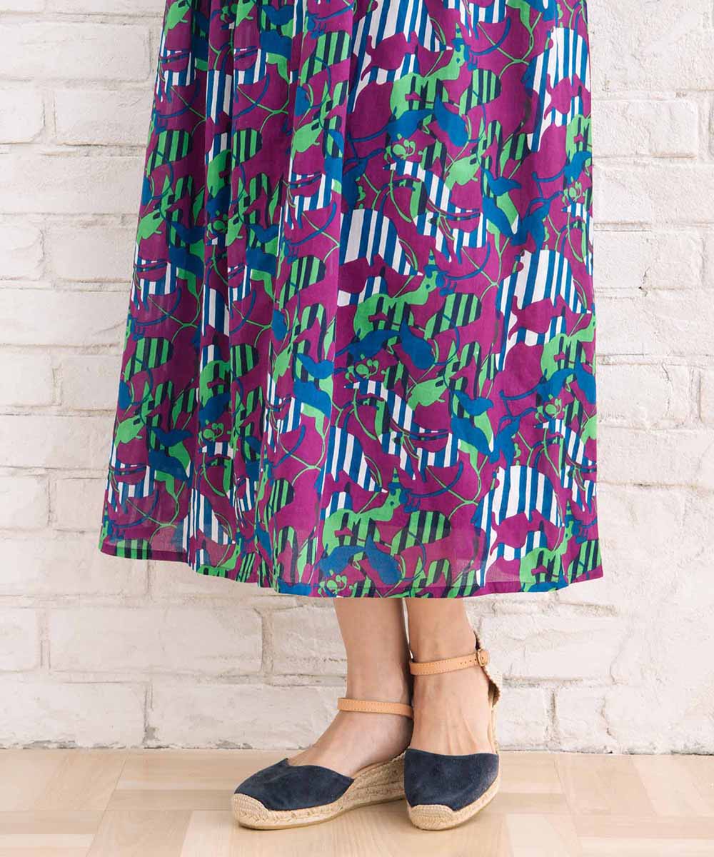 ビビッドなカラーリングが目を惹く、バインプリントがストライプ生地に映えるスカート。