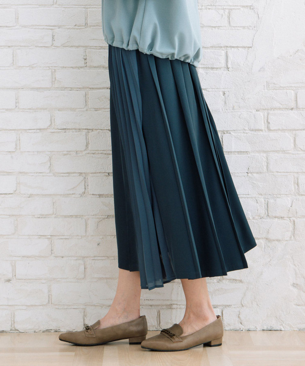 落ち感があり、広がりすぎないプリーツで大人でも着やすい美しいシルエットです。