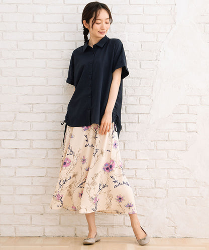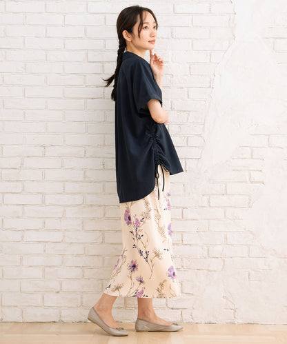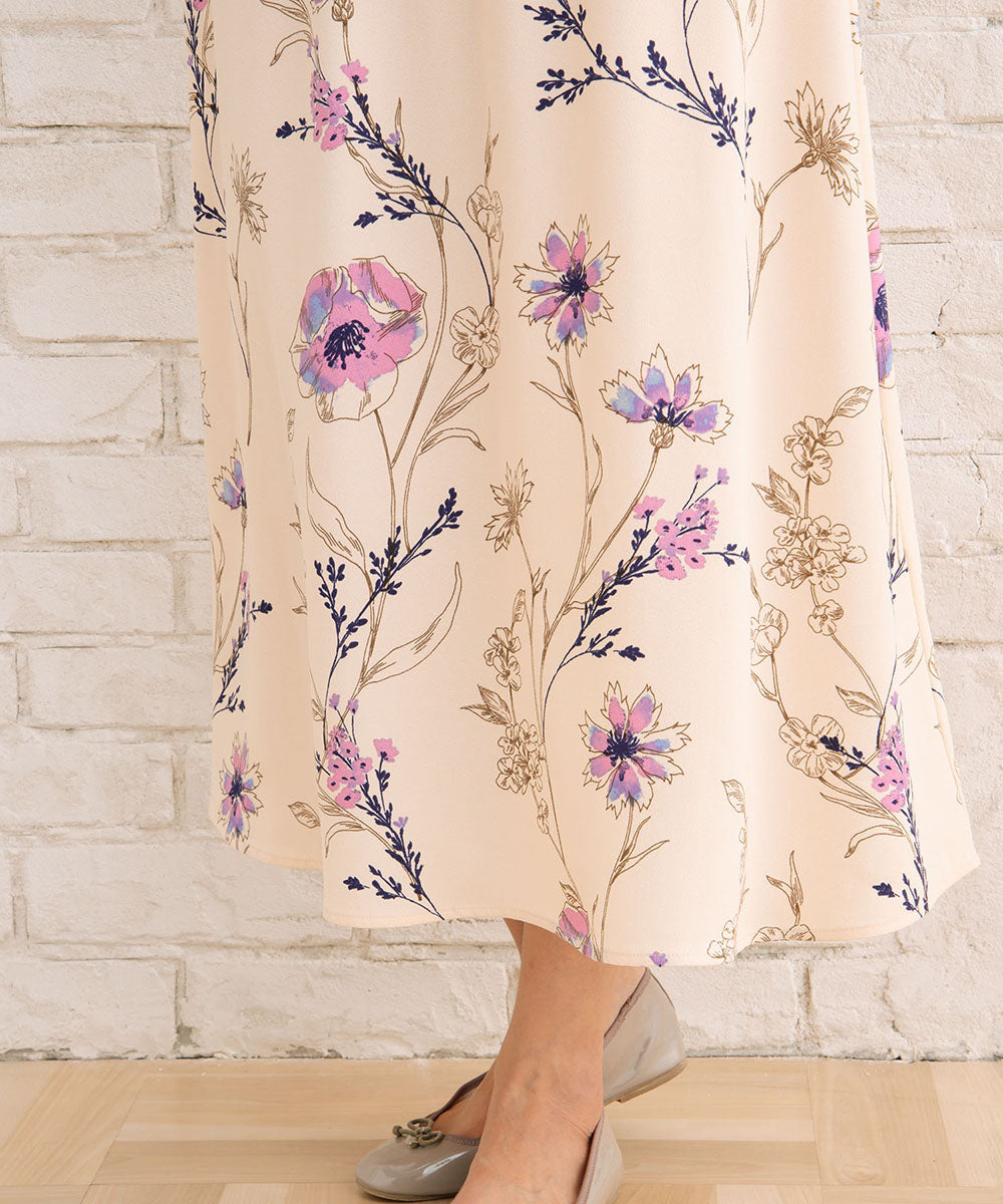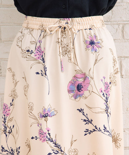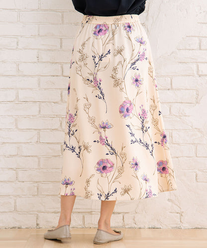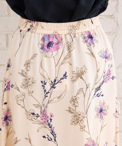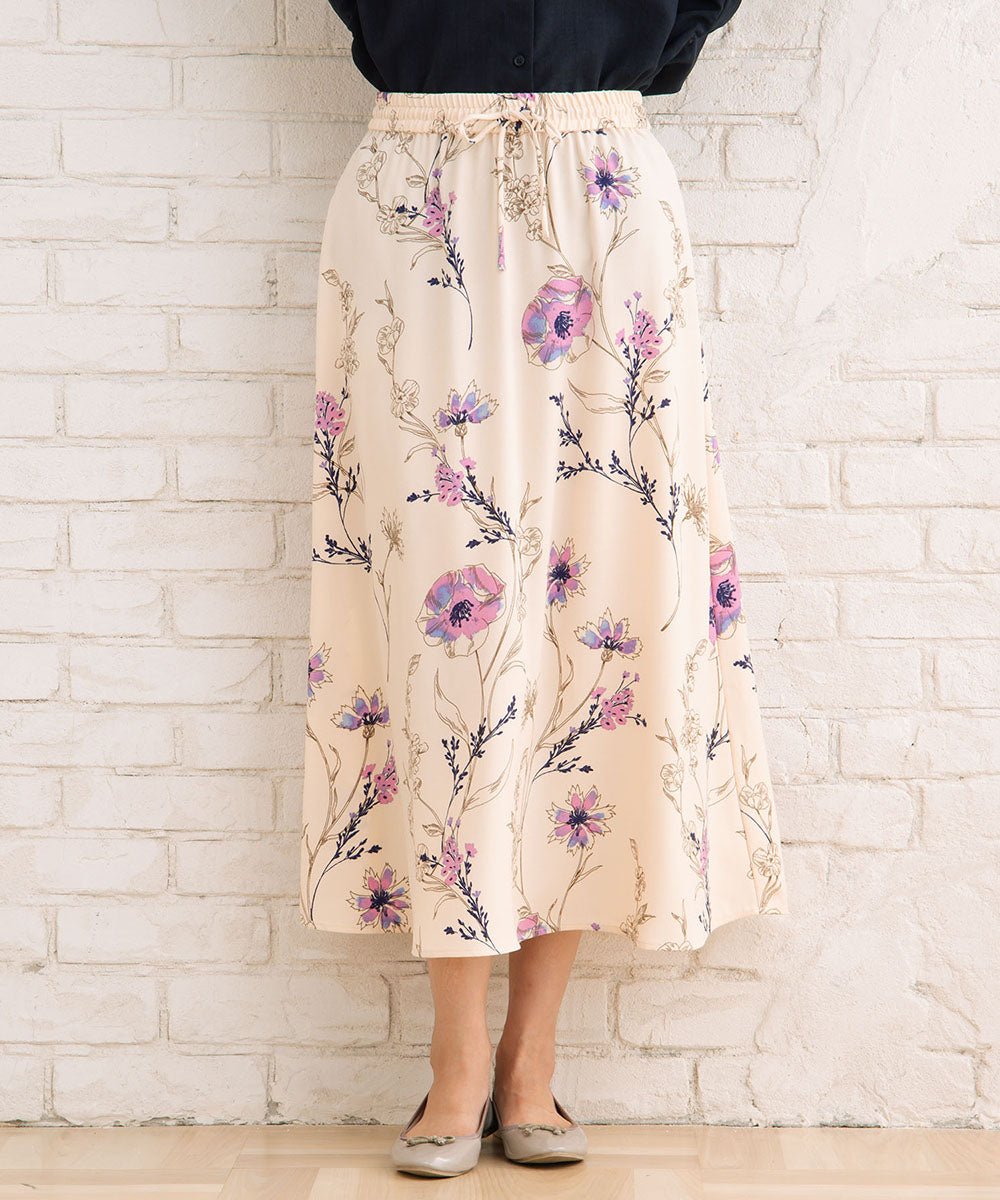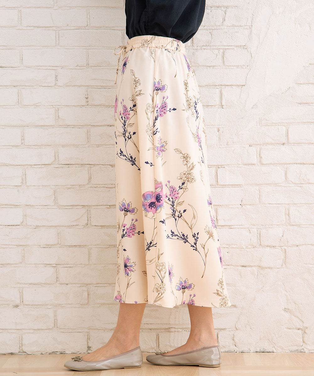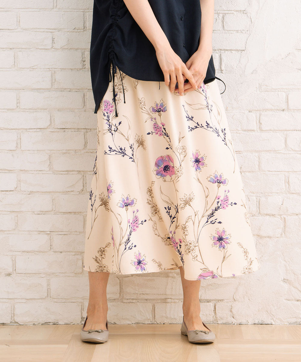 優美なフラワープリントが目を引く、柔らかな色合いが魅力的なフラワープリントスカート。