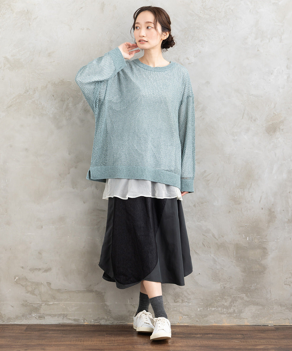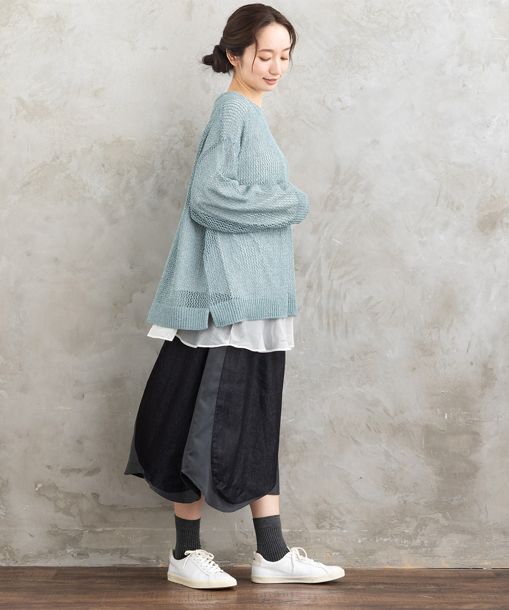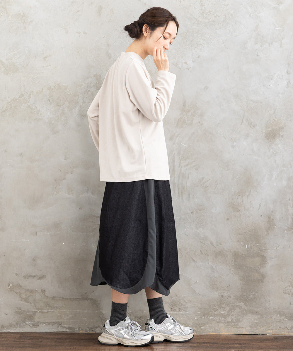 デニムと布帛の切り替えと流れるような曲線ラインが、スタイリングに動きを与えてくれます。
