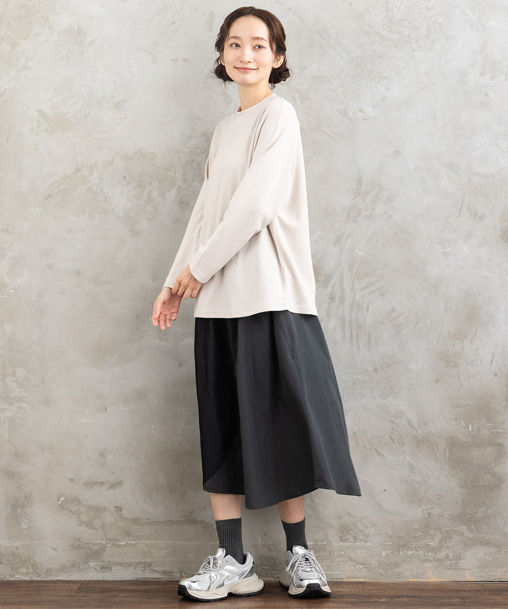 広がりすぎないバルーンシルエットで、甘くなりすぎず大人のカジュアルスタイルにぴったり。