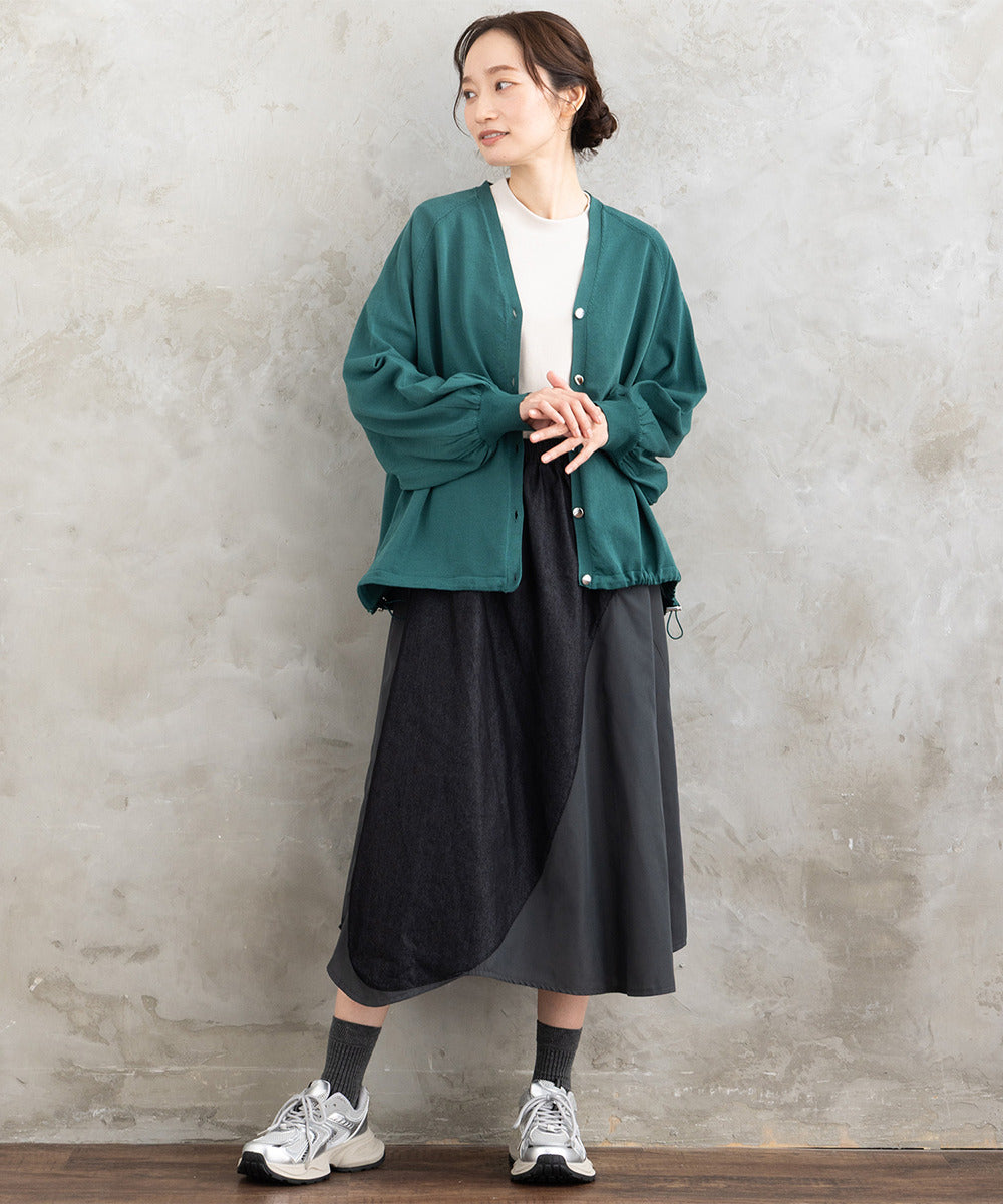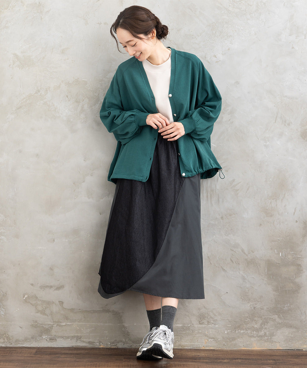 肌寒い季節にはショート丈のカーディガンやデニムジャケットを羽織ってバランスよく。