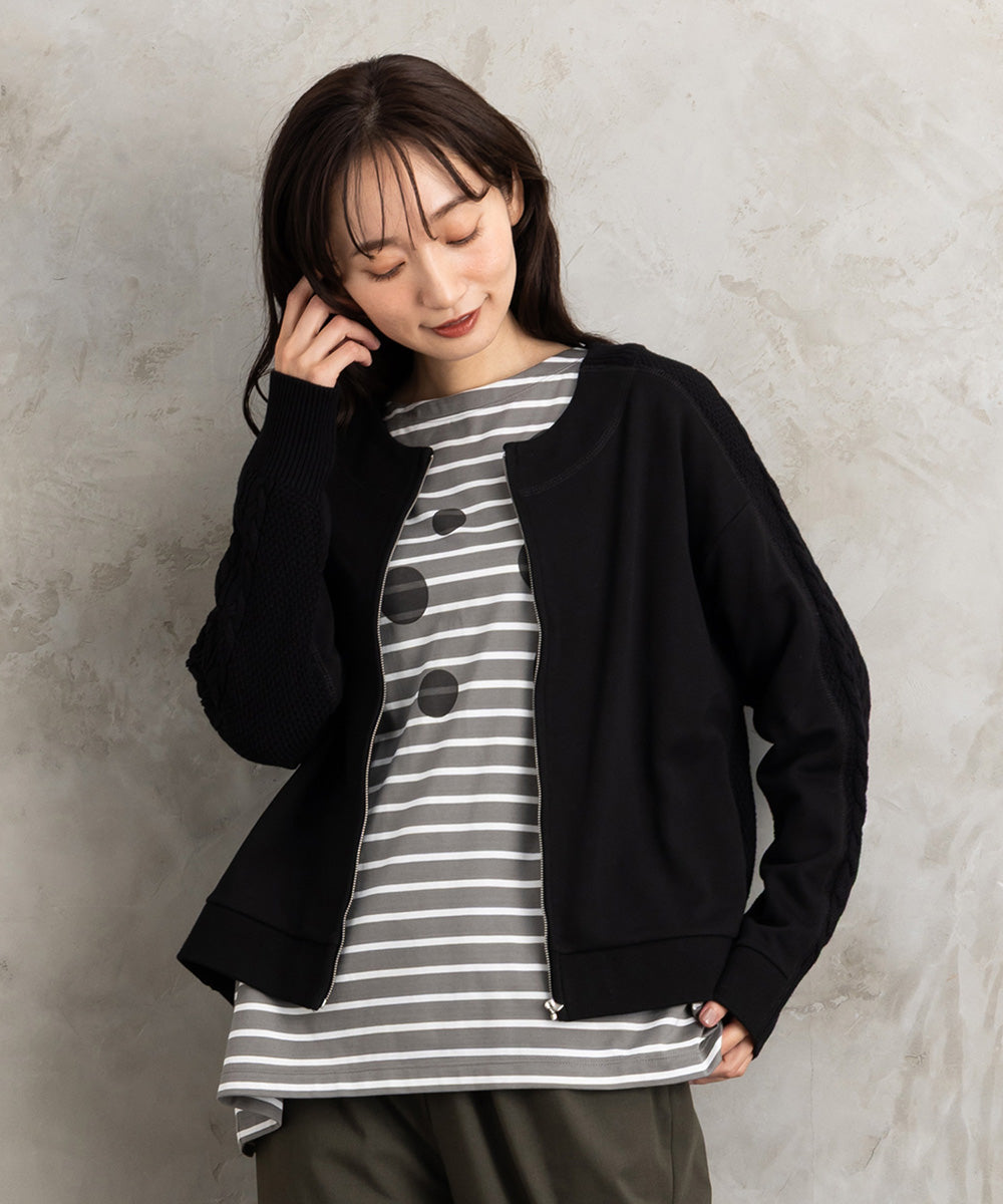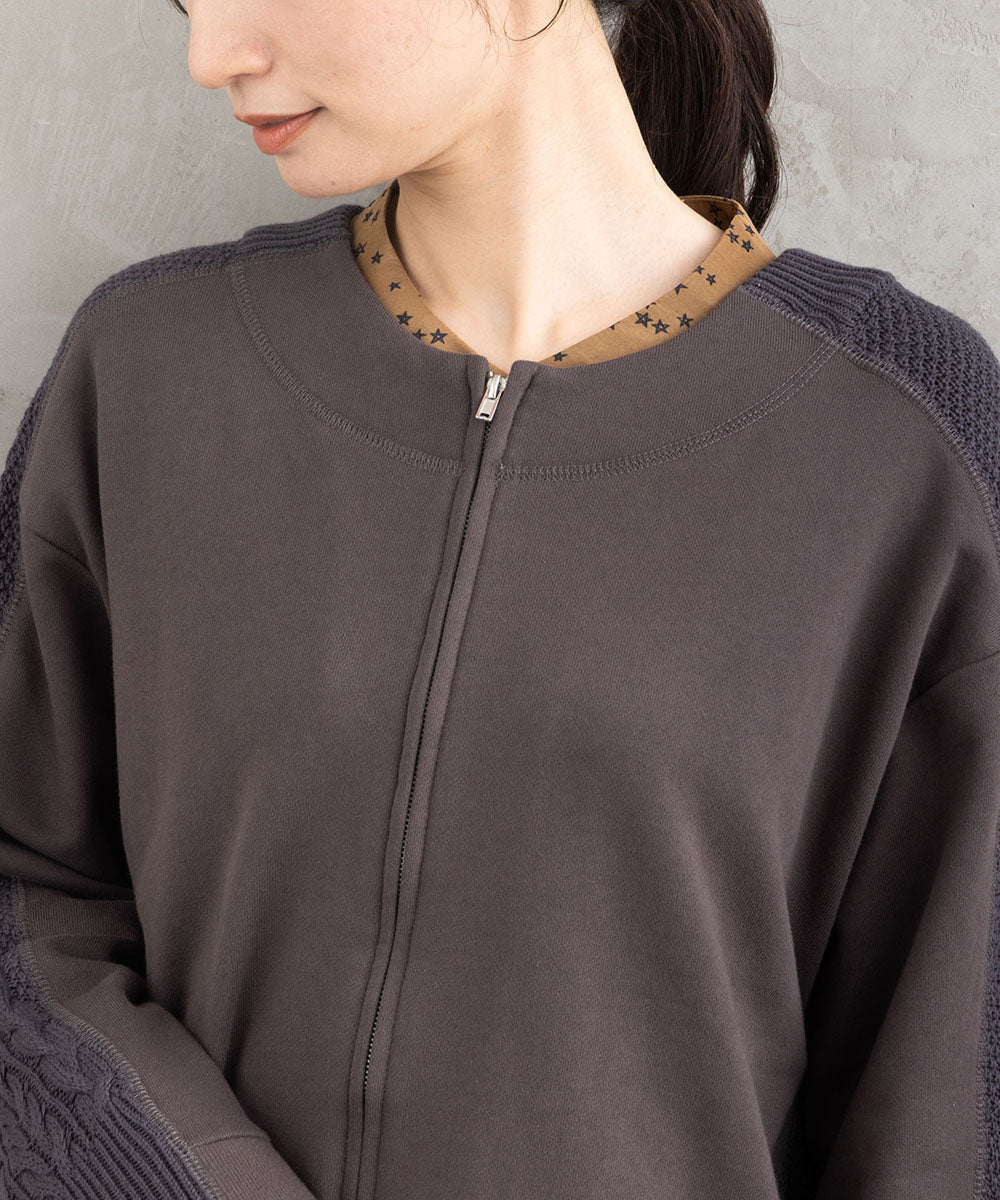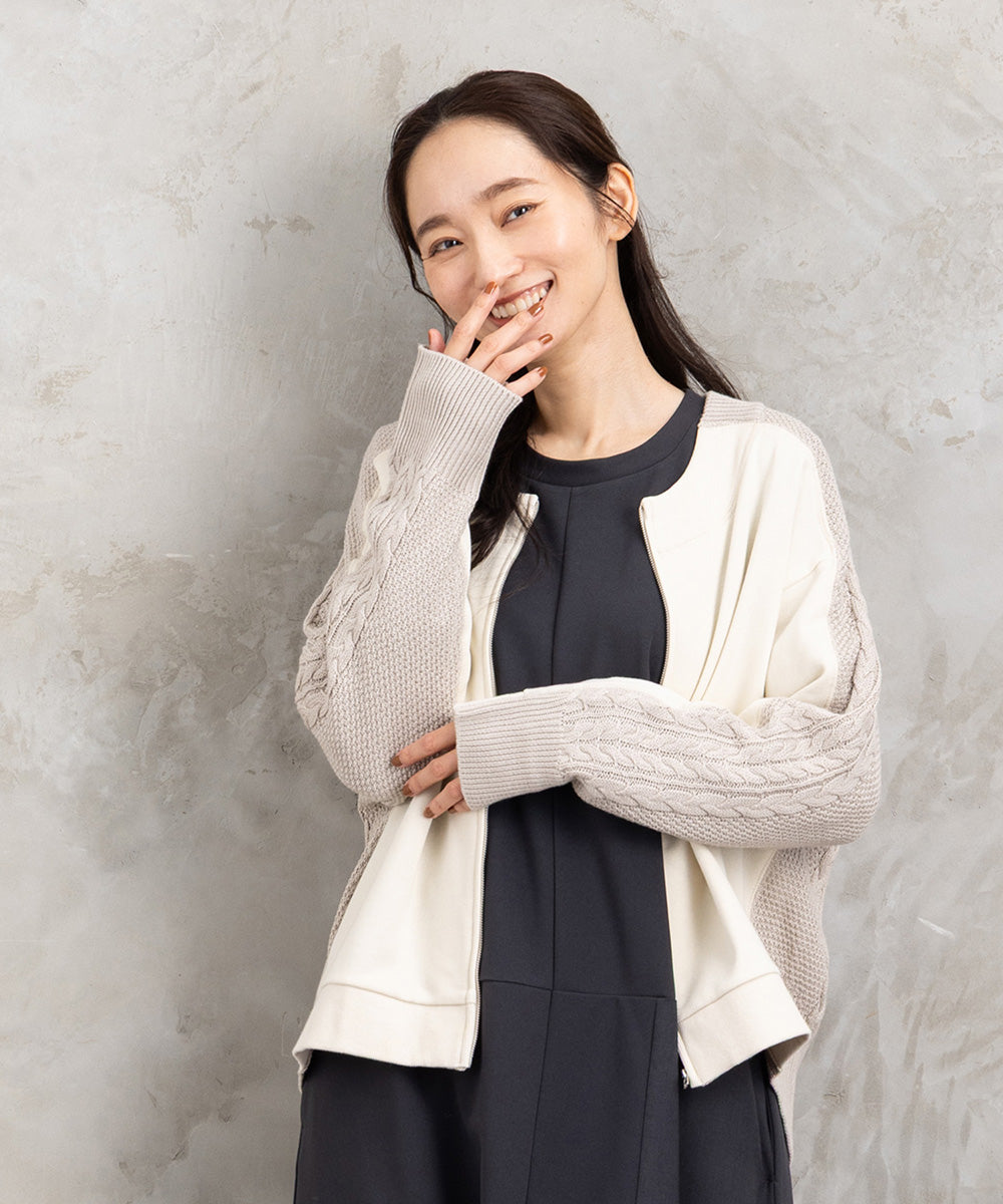 【異素材ミックスで魅せる、裏毛×ケーブルコンビブルゾン】
