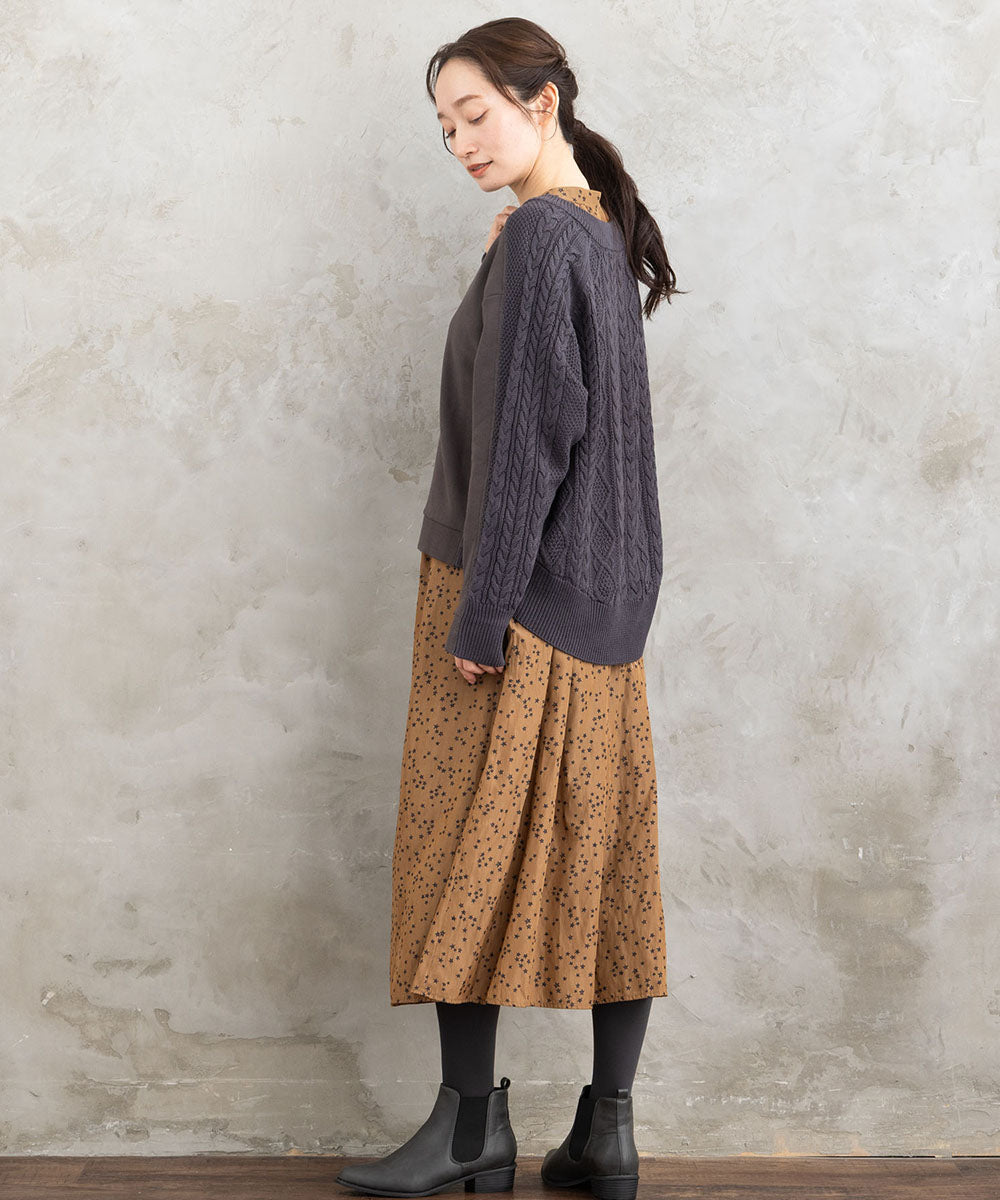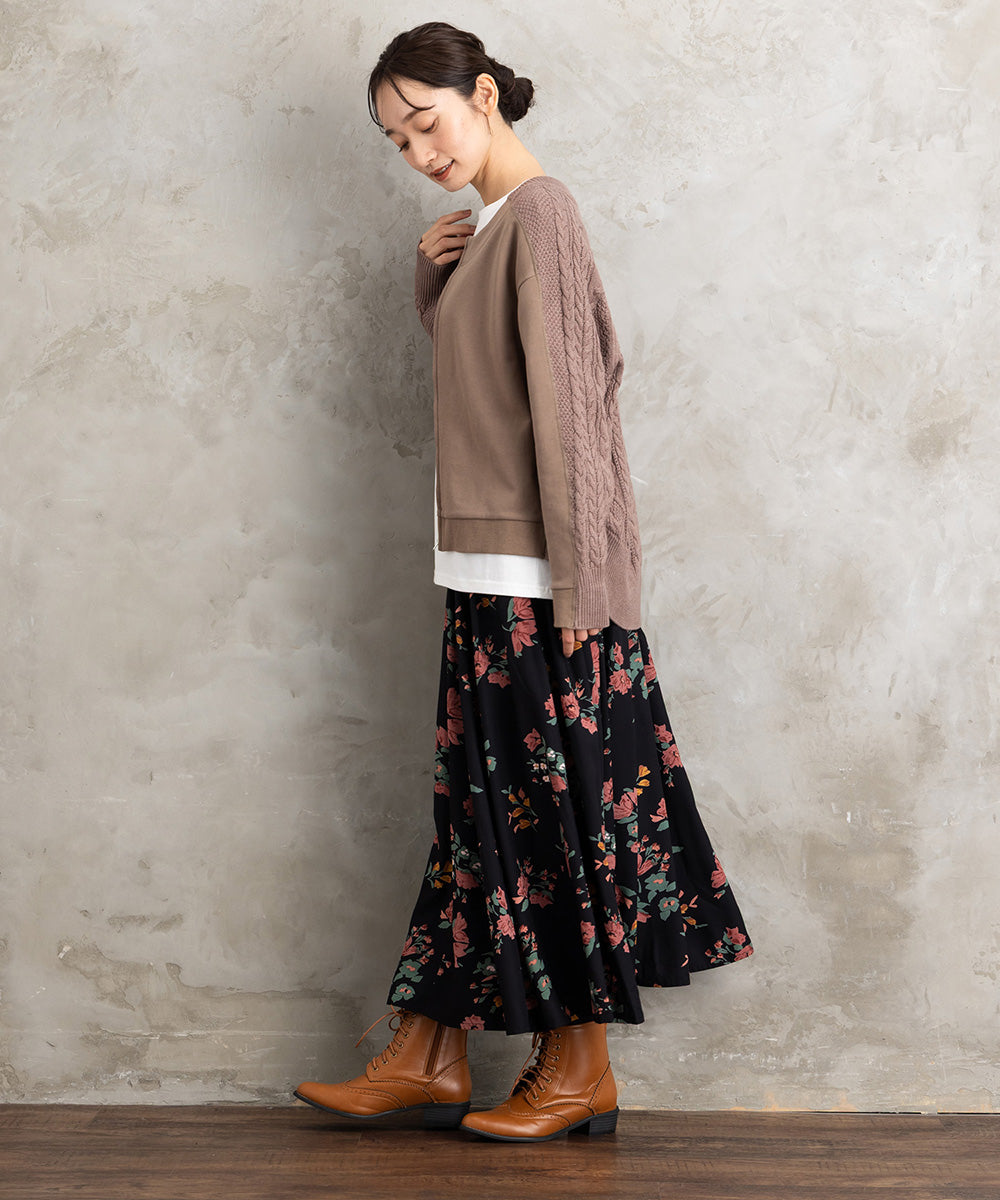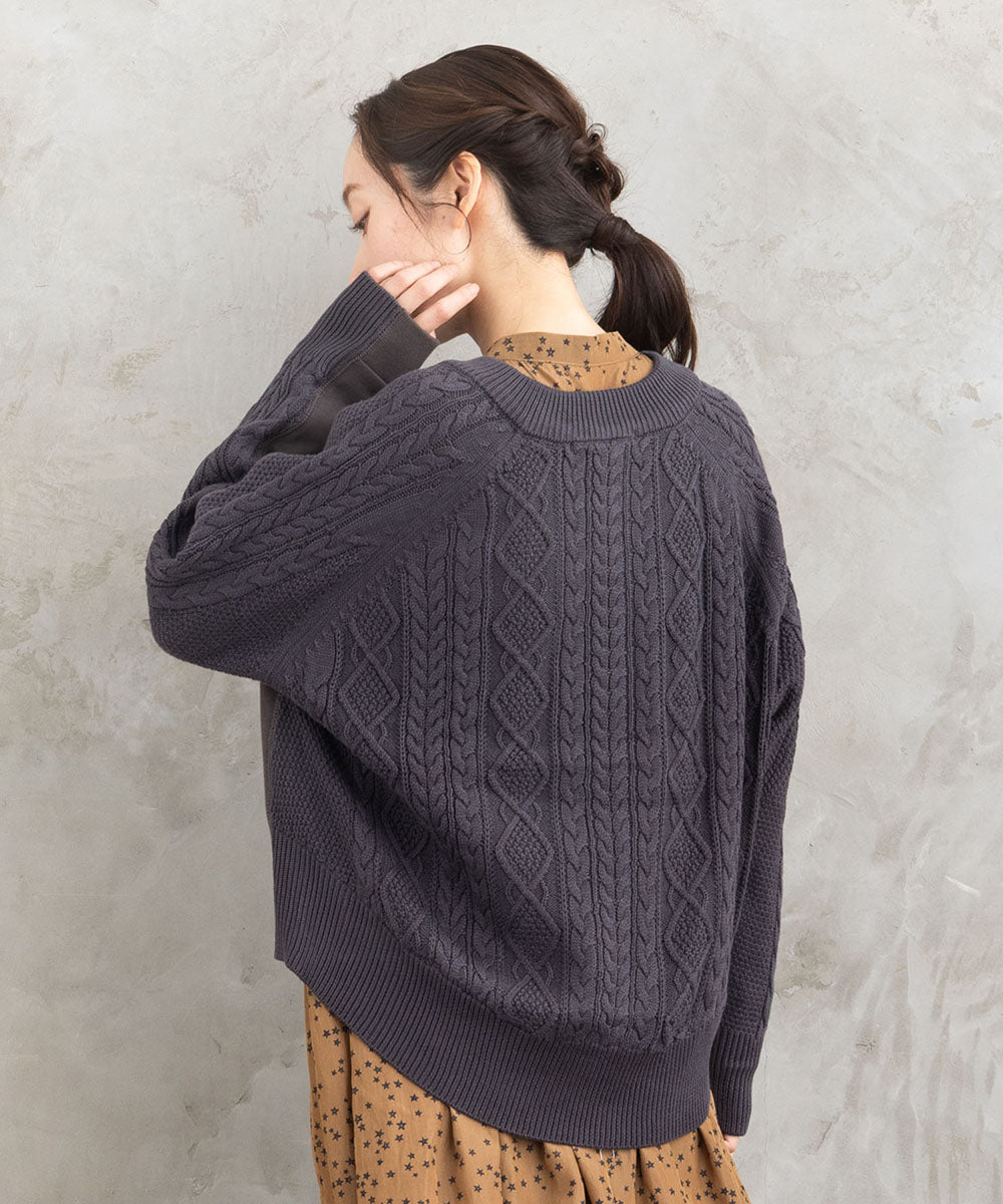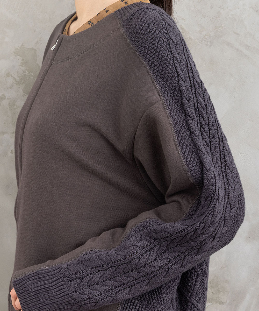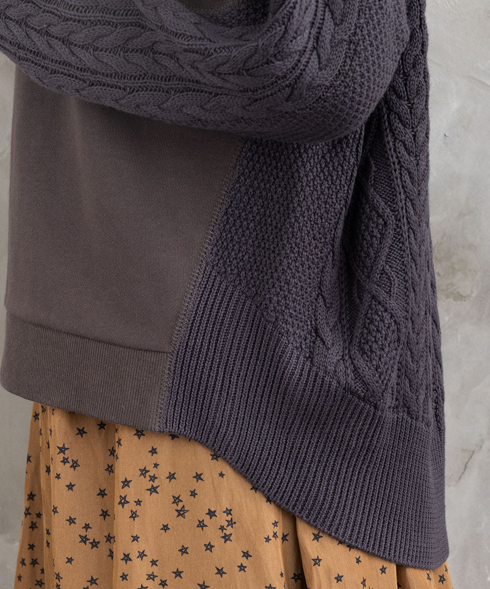 カジュアルな裏毛素材に、肩から袖にかけてケーブル編みをドッキング。