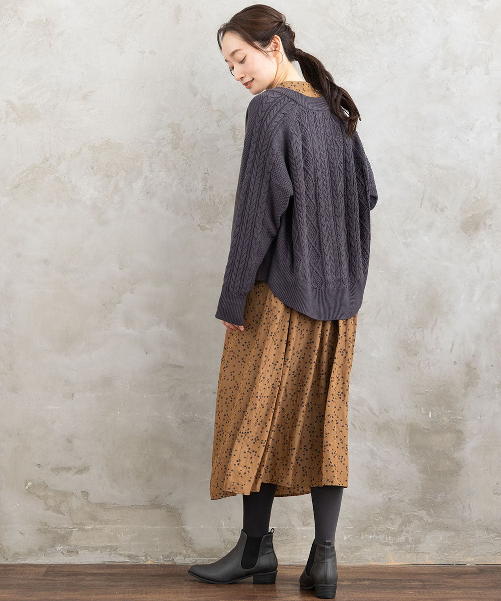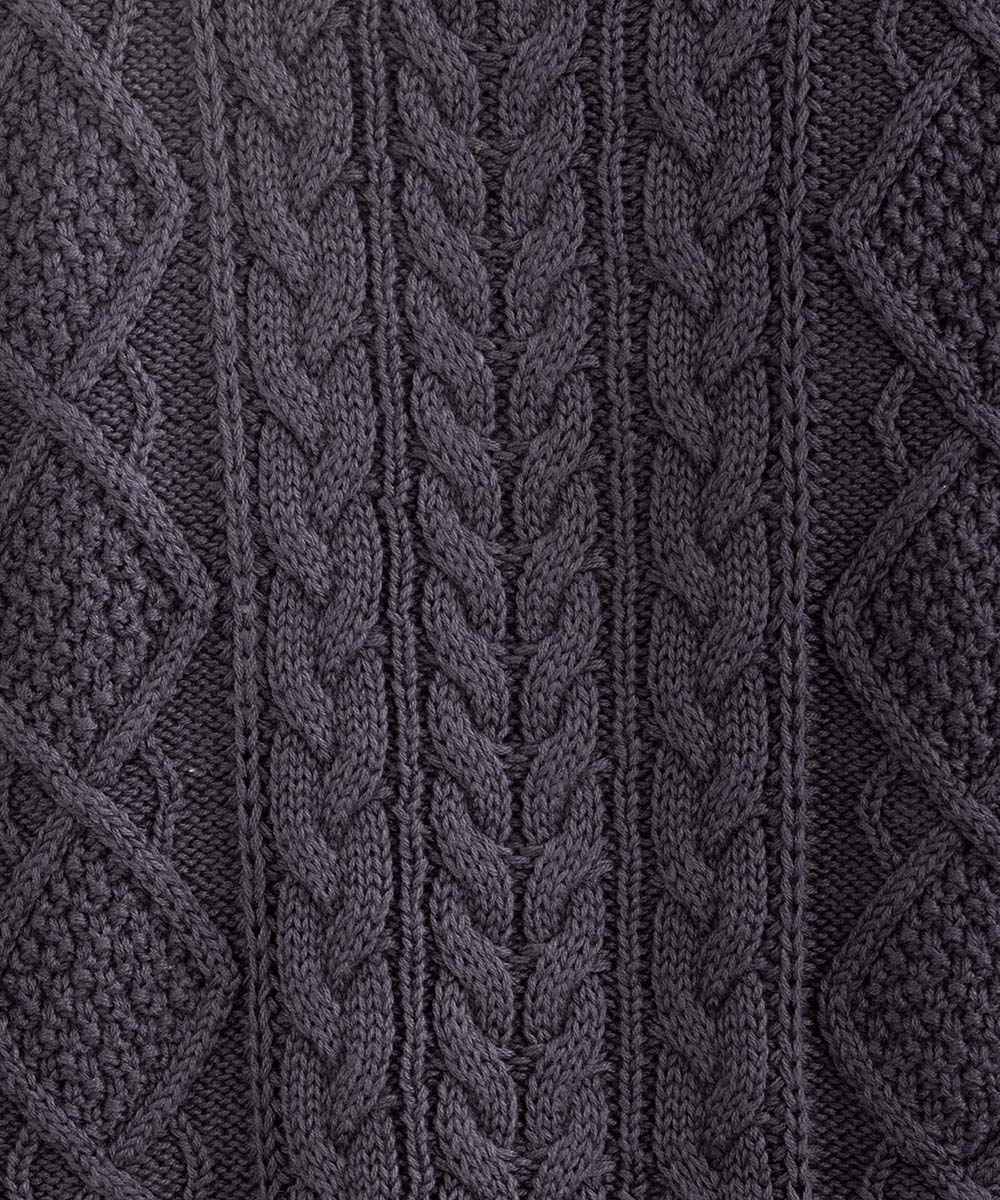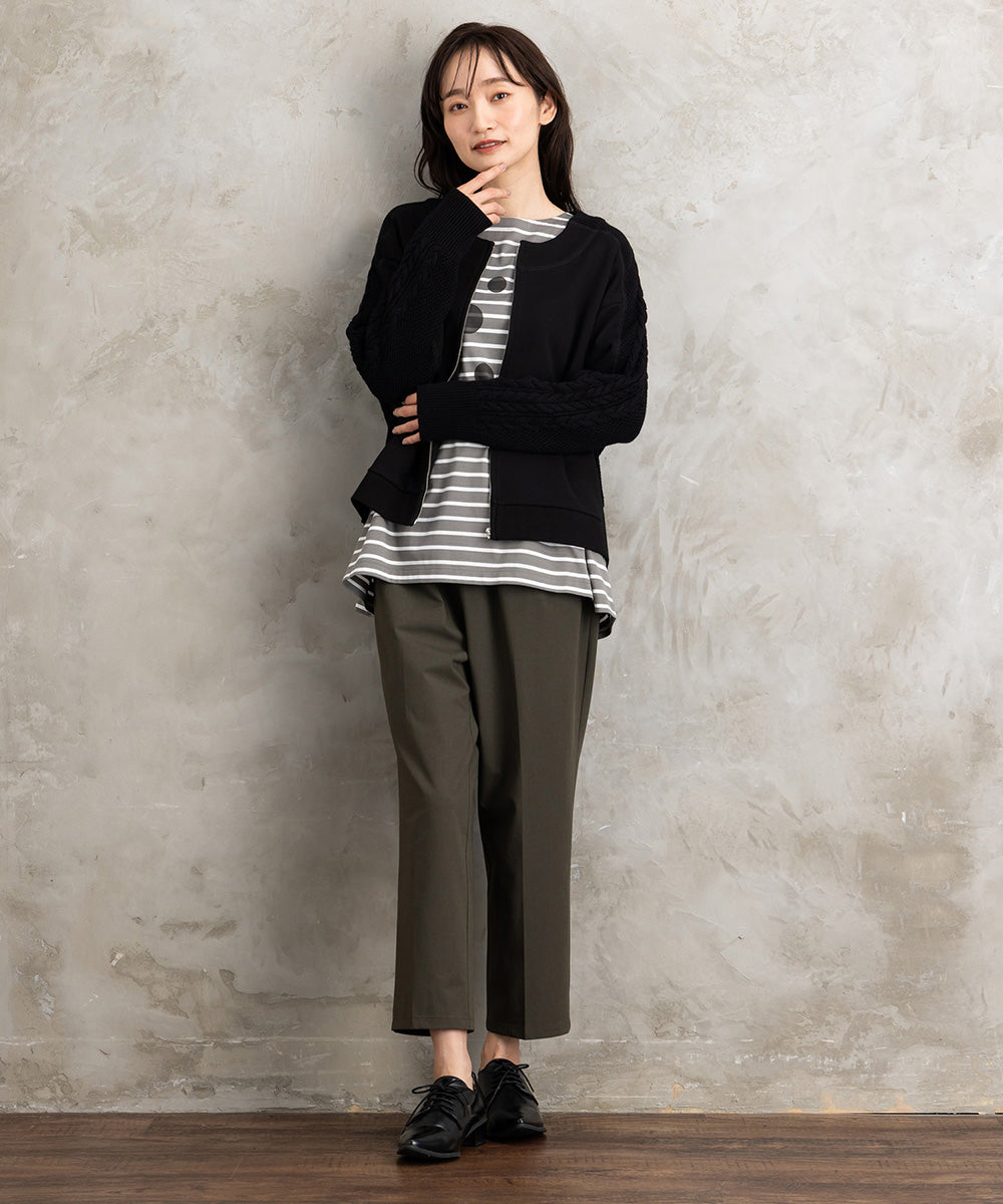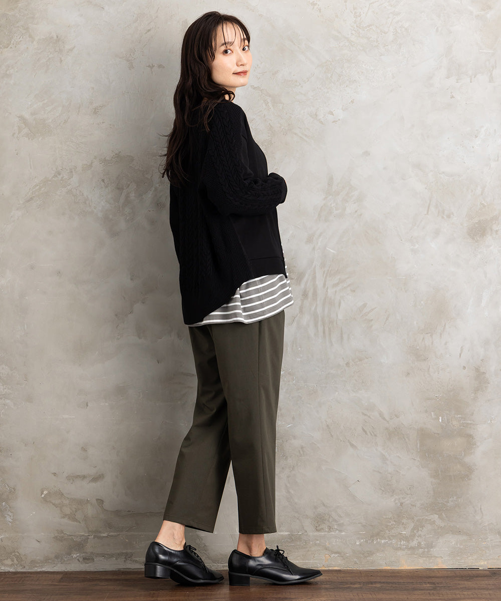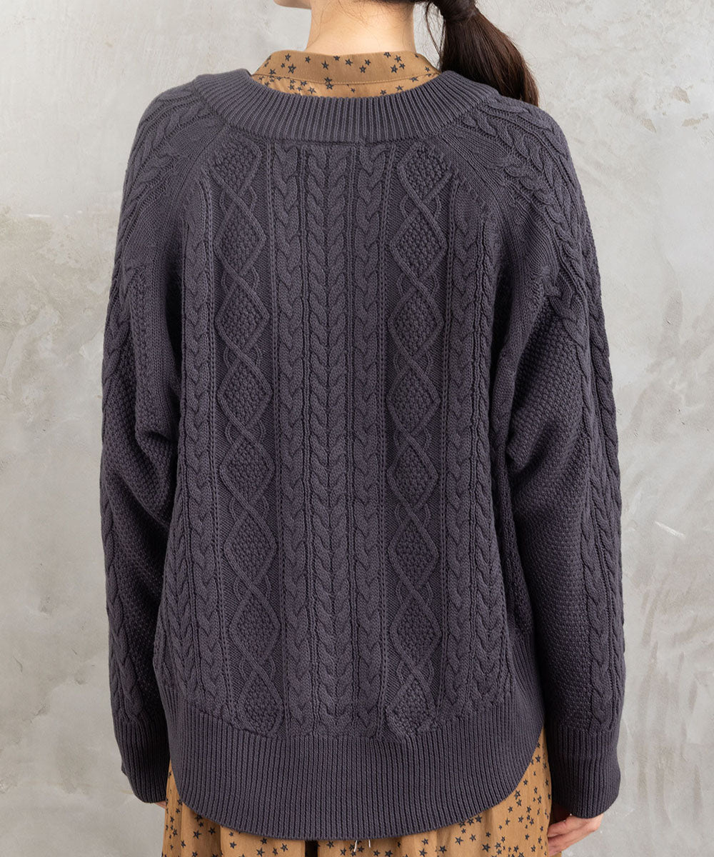 カジュアルな裏毛素材に、肩から袖にかけてケーブル編みをドッキング。