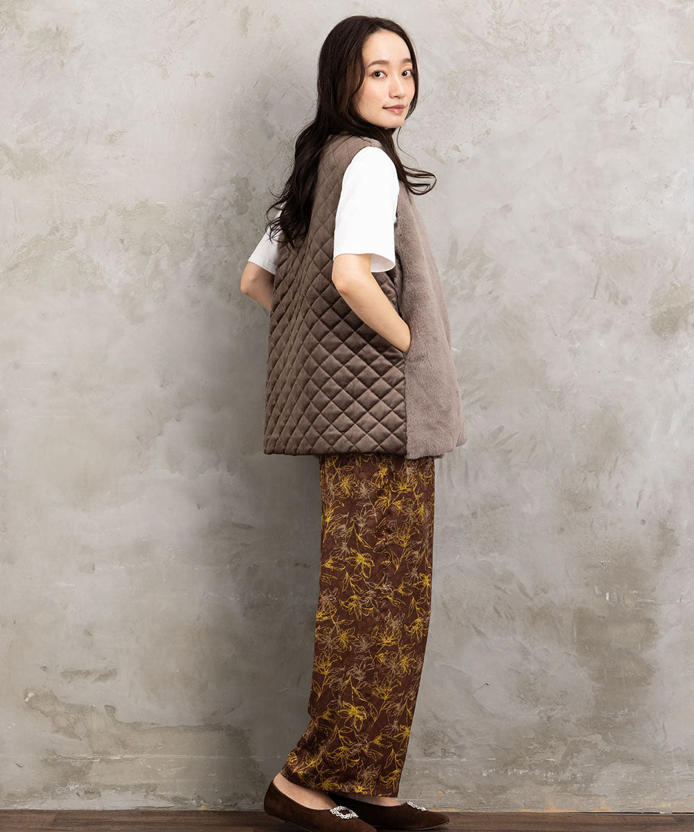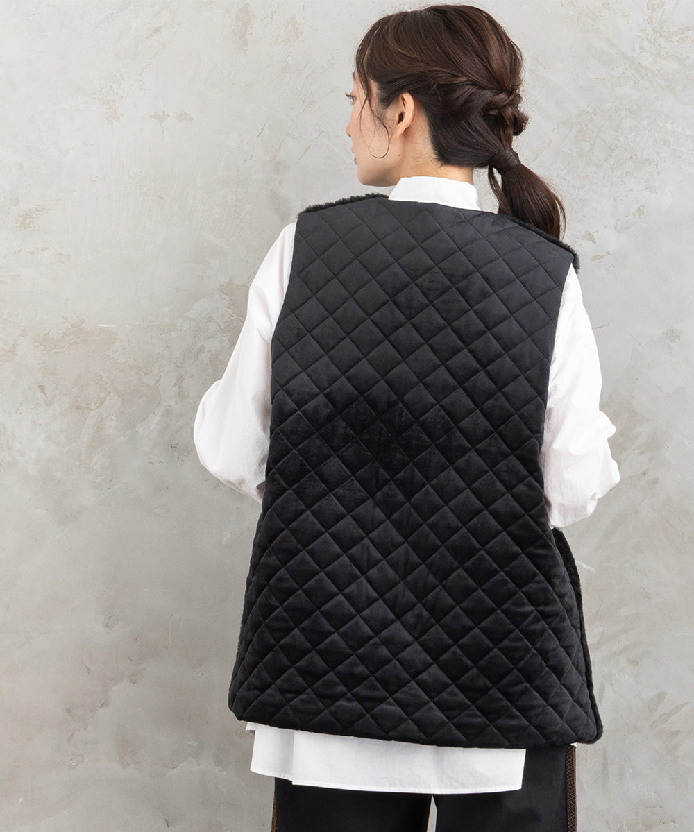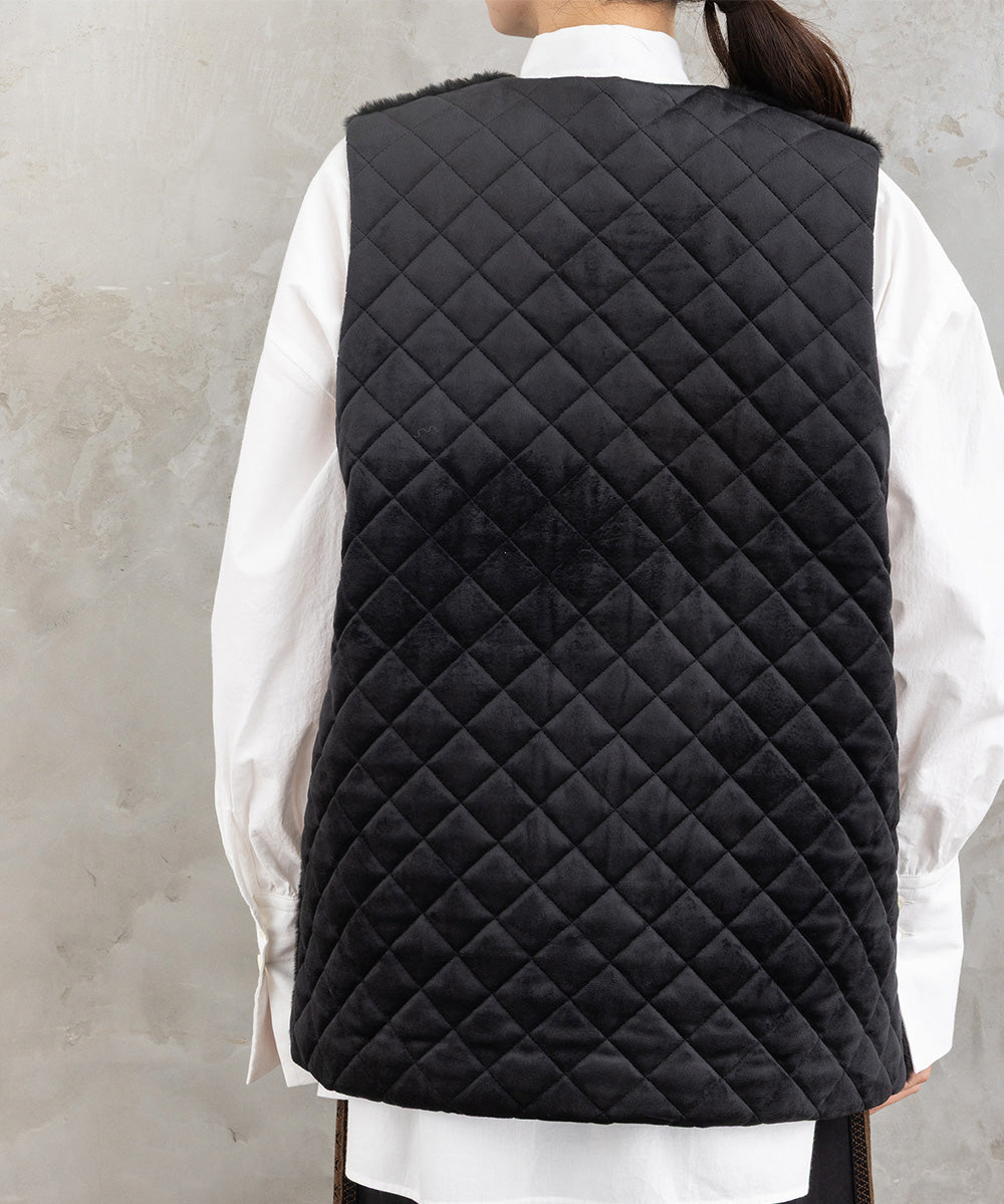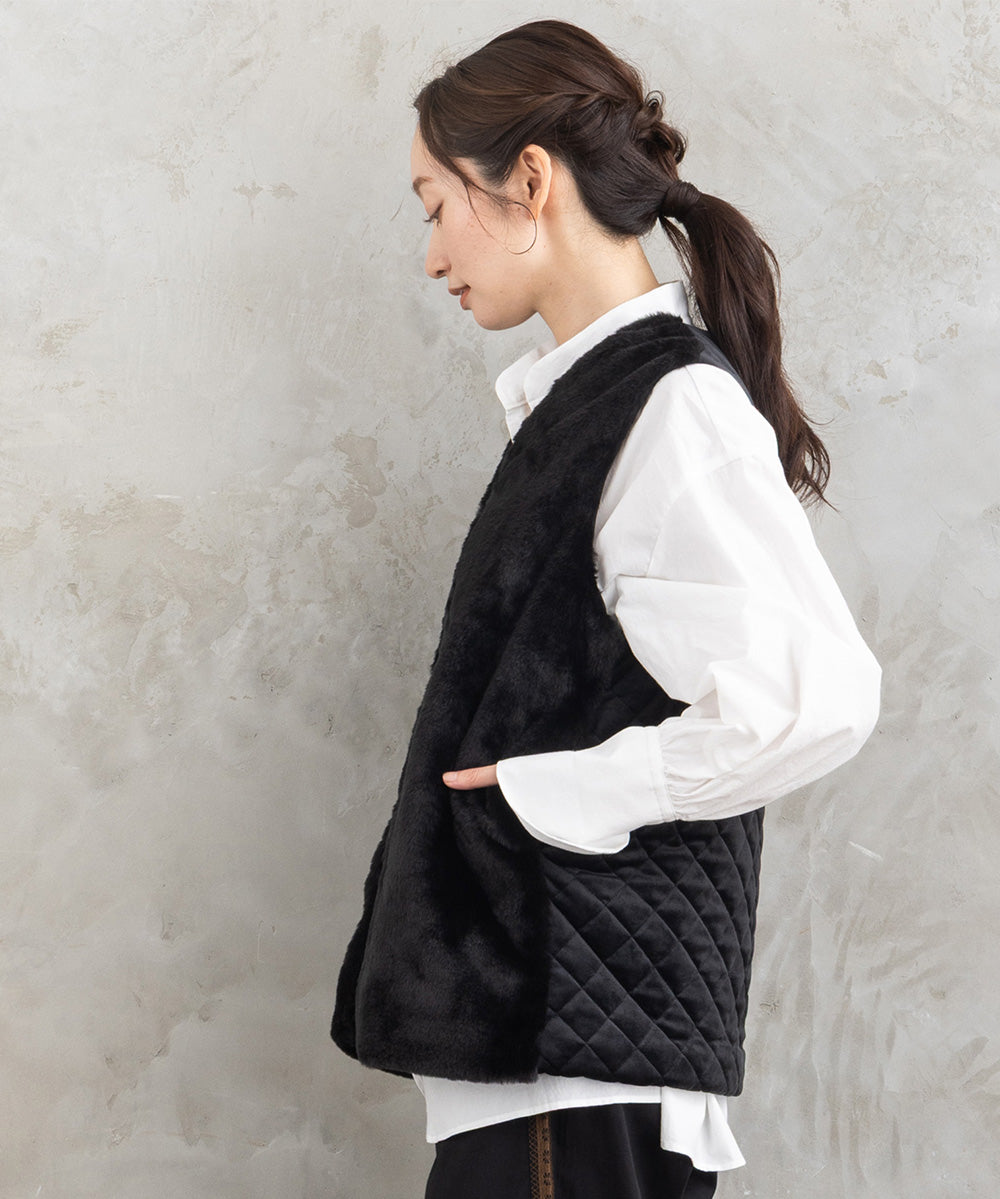 ふわふわのフェイクファーとカットベロアのキルティング素材を組み合わせた秋冬ムードたっぷりのベスト。