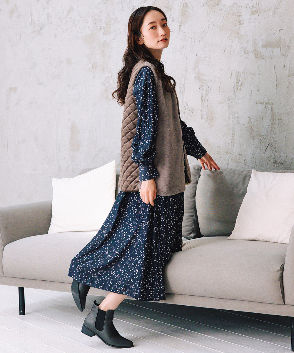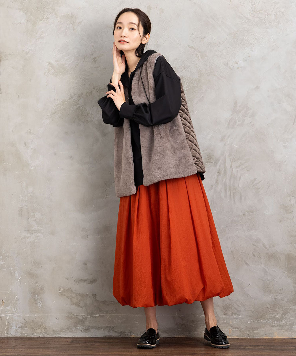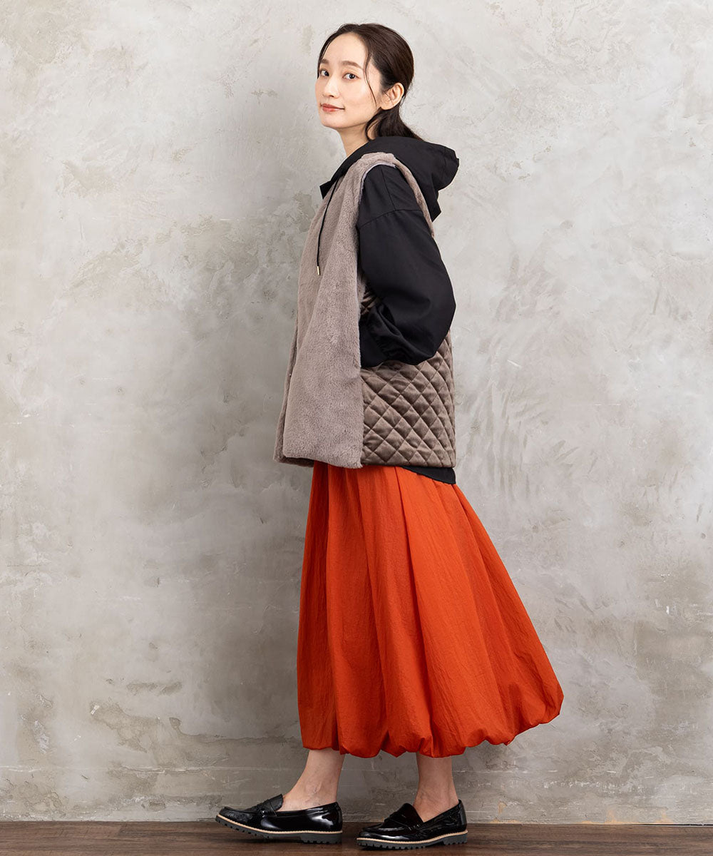 ふわふわのフェイクファーとカットベロアのキルティング素材を組み合わせた秋冬ムードたっぷりのベスト。