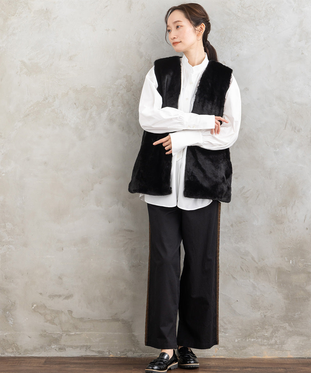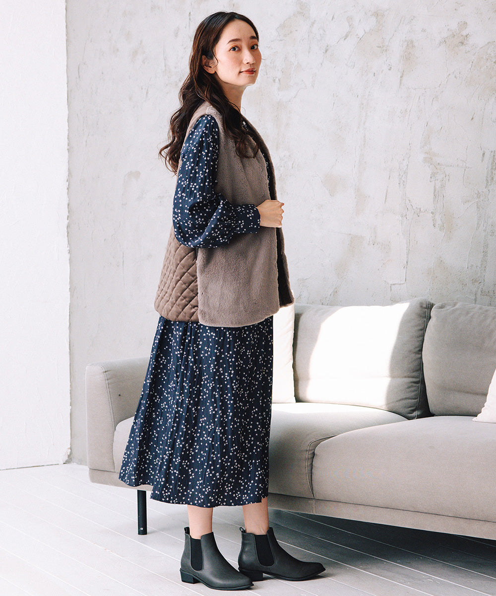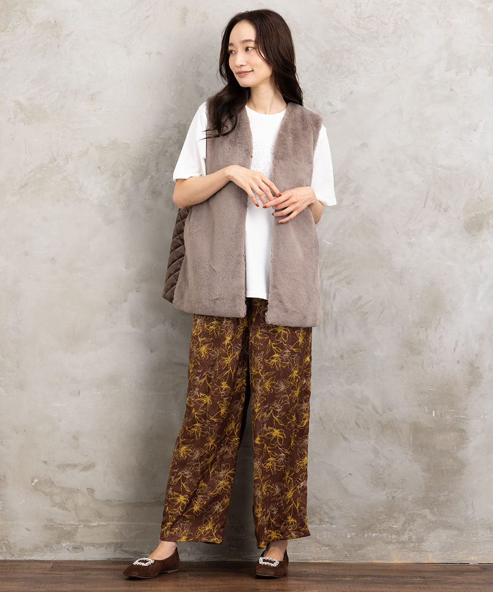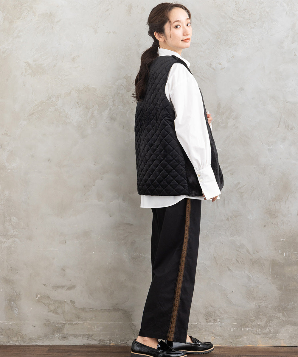ふわふわのフェイクファーとカットベロアのキルティング素材を組み合わせた秋冬ムードたっぷりのベスト。