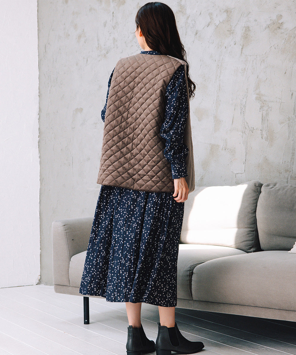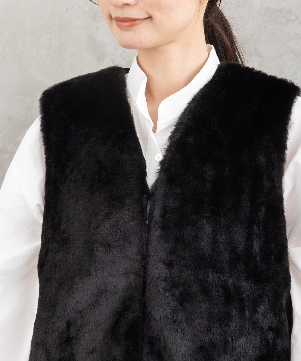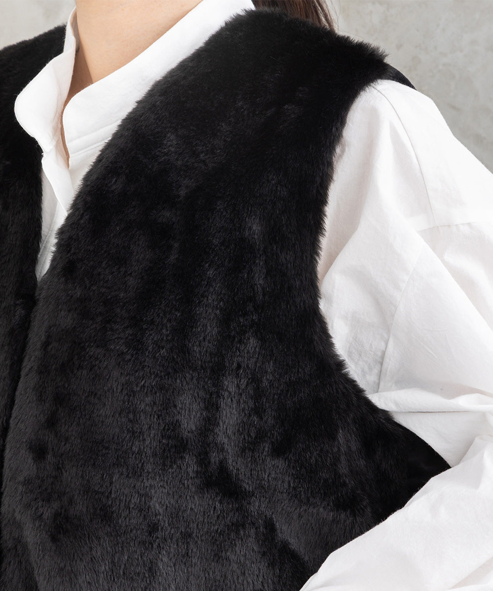 ふわふわのフェイクファーとカットベロアのキルティング素材を組み合わせた秋冬ムードたっぷりのベスト。