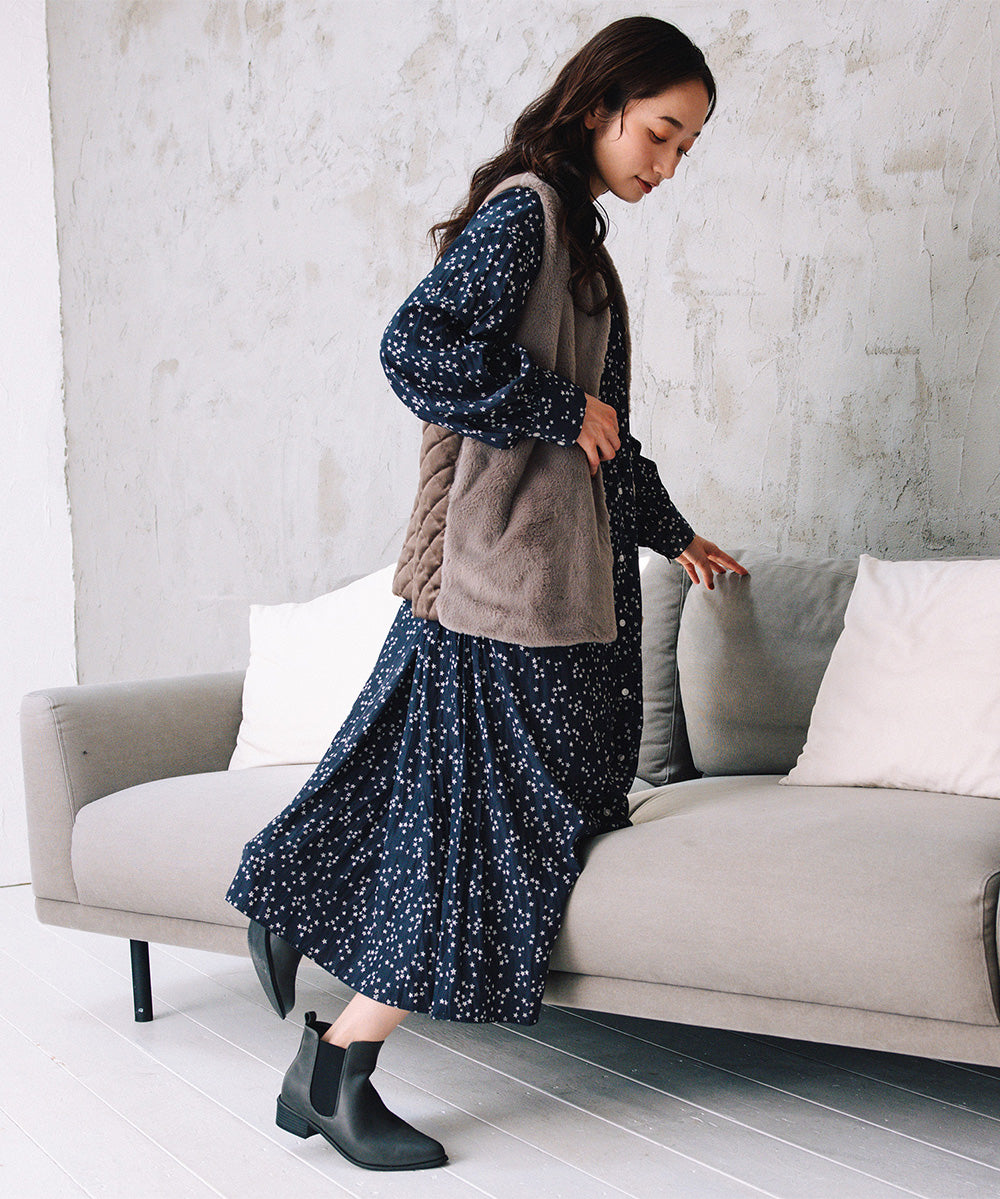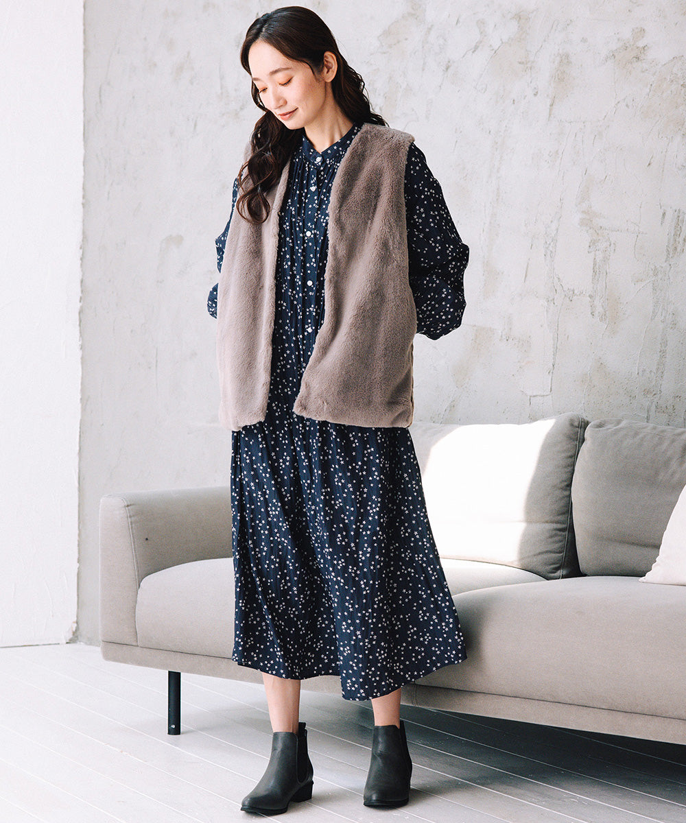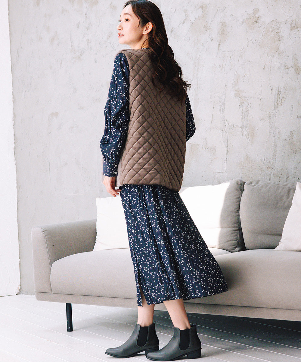 ふわふわのフェイクファーとカットベロアのキルティング素材を組み合わせた秋冬ムードたっぷりのベスト。