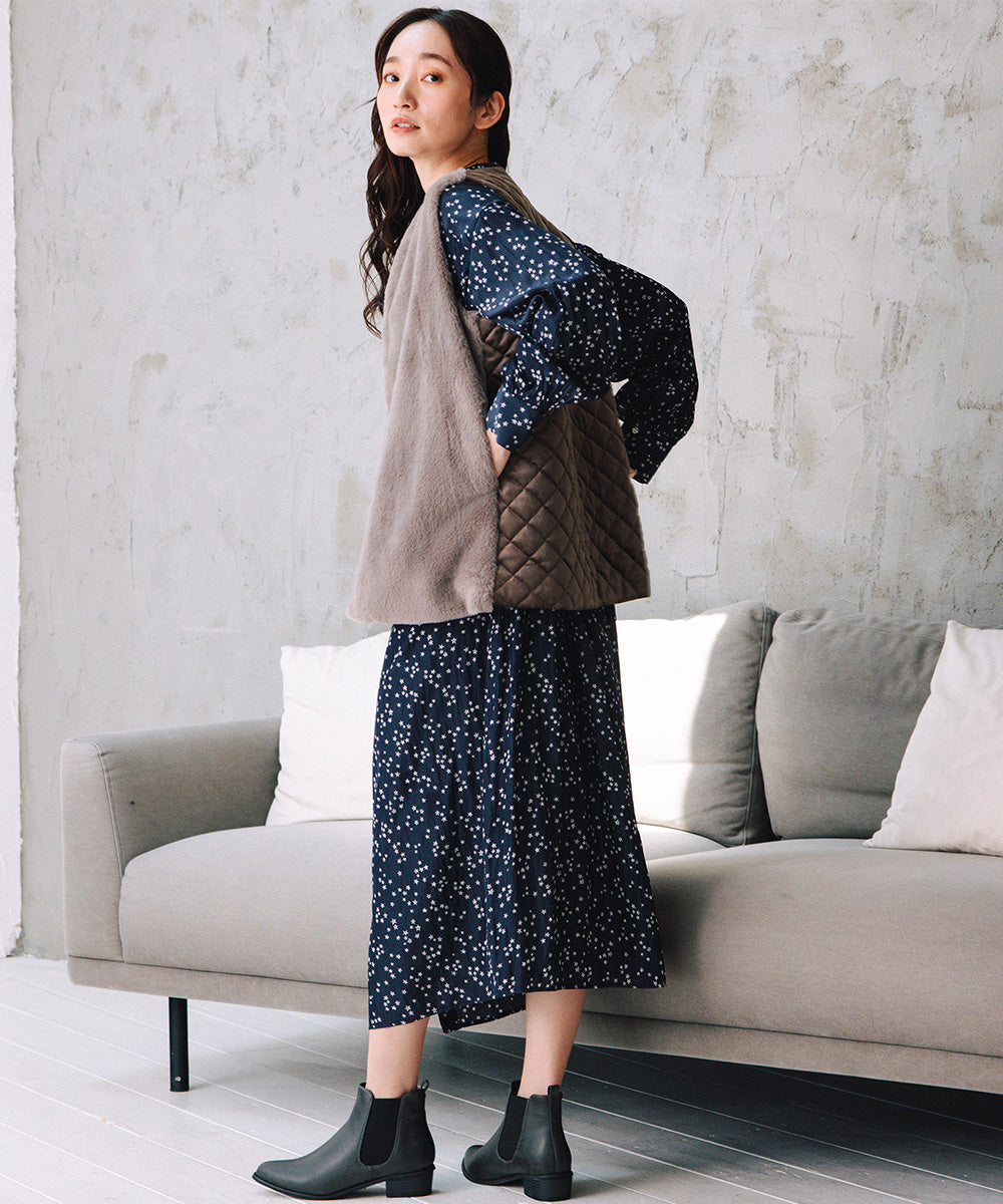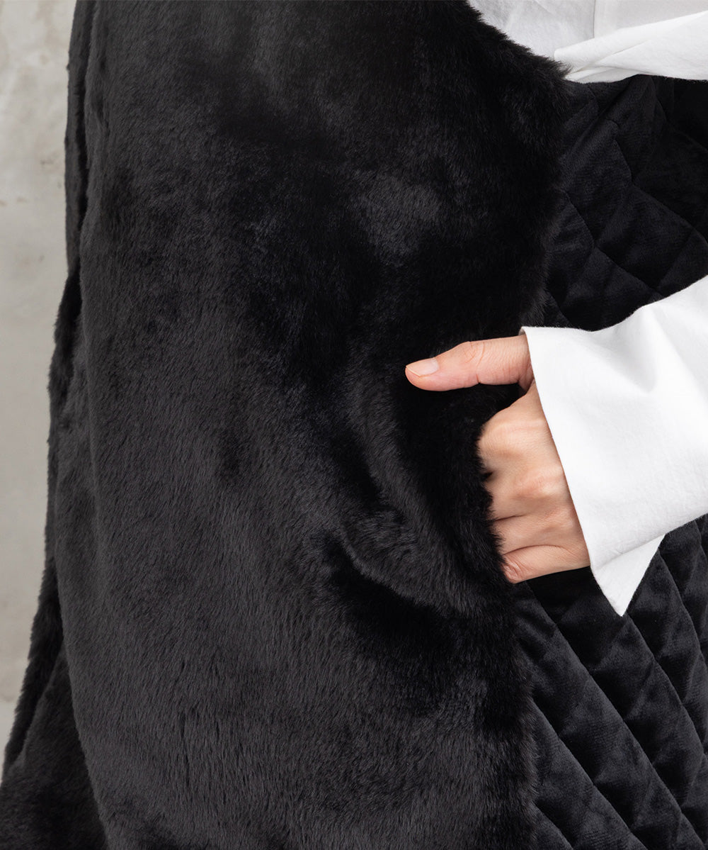 前面はなめらかな肌触りのフェイクファー、背面はステッチの効いたキルティングで、後ろ姿まで抜かりないデザインに。