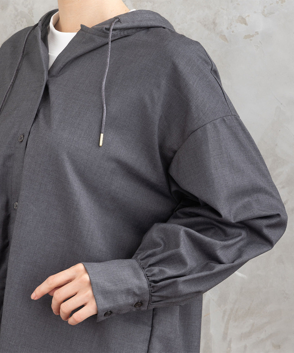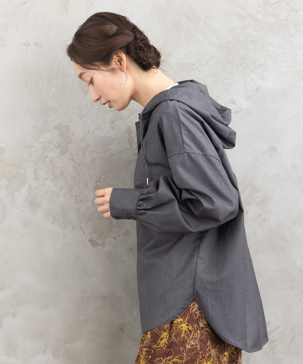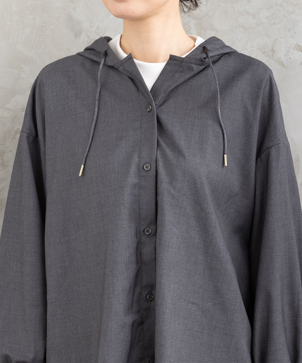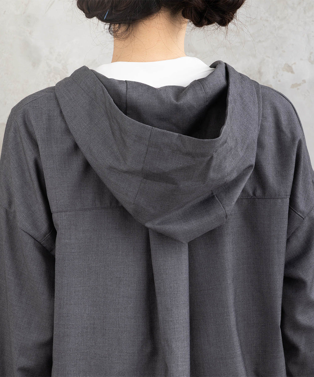 ウールのような上品な表面感を持つ軽やかな素材で仕立てた、フード付きブラウスブルゾン。