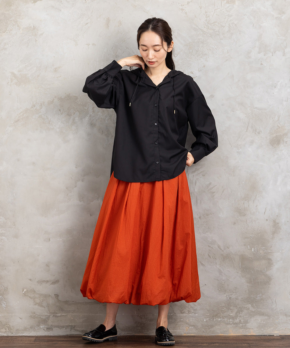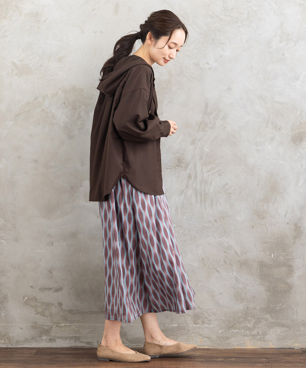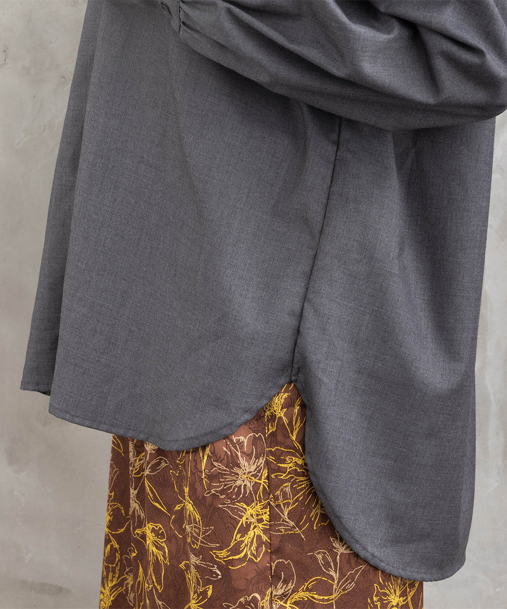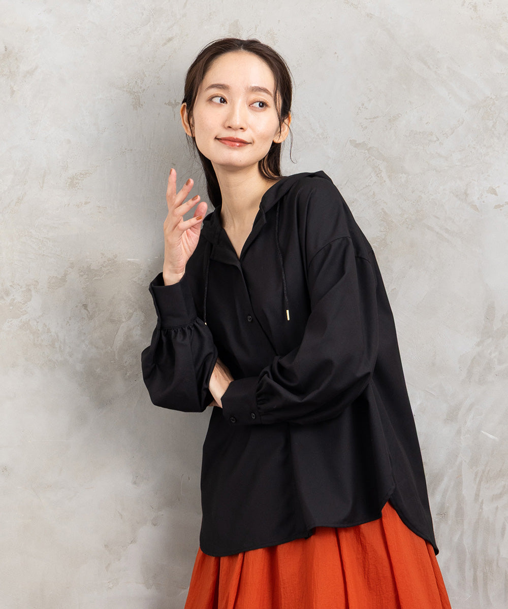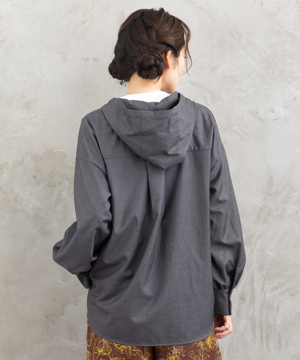 ウールのような上品な表面感を持つ軽やかな素材で仕立てた、フード付きブラウスブルゾン。