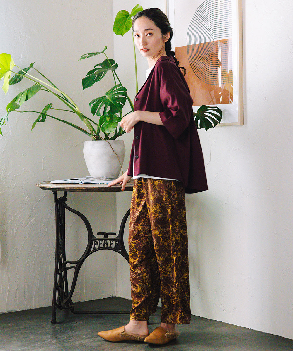 同じ素材のカーブパンツを合わせてトレンドライクな着こなしもおすすめです。