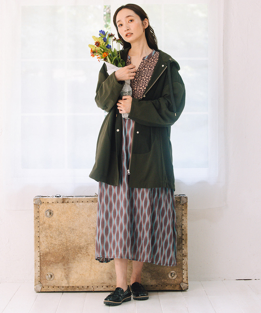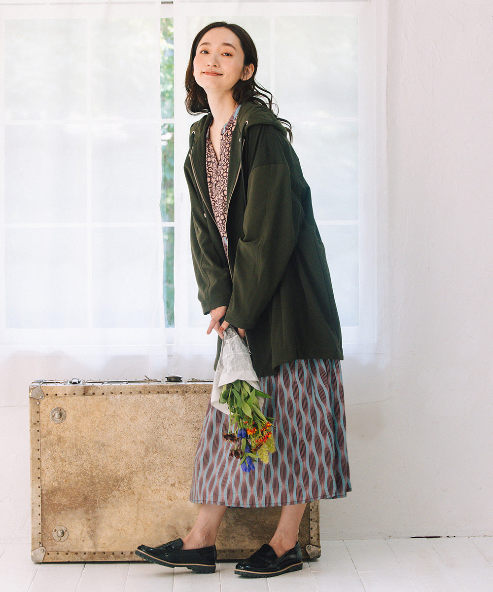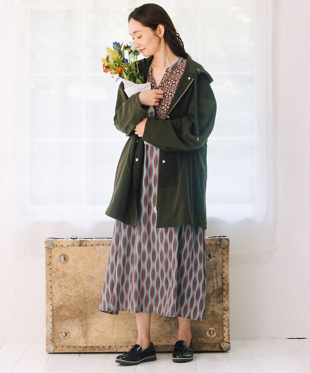 ロングスカートやワンピースに羽織れば、女性らしさを引き立てたミックススタイルに。