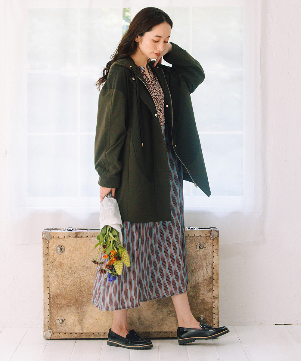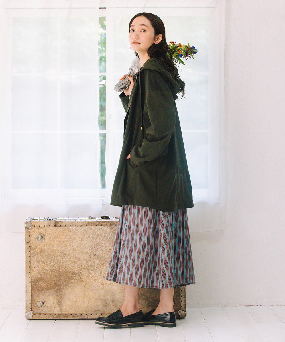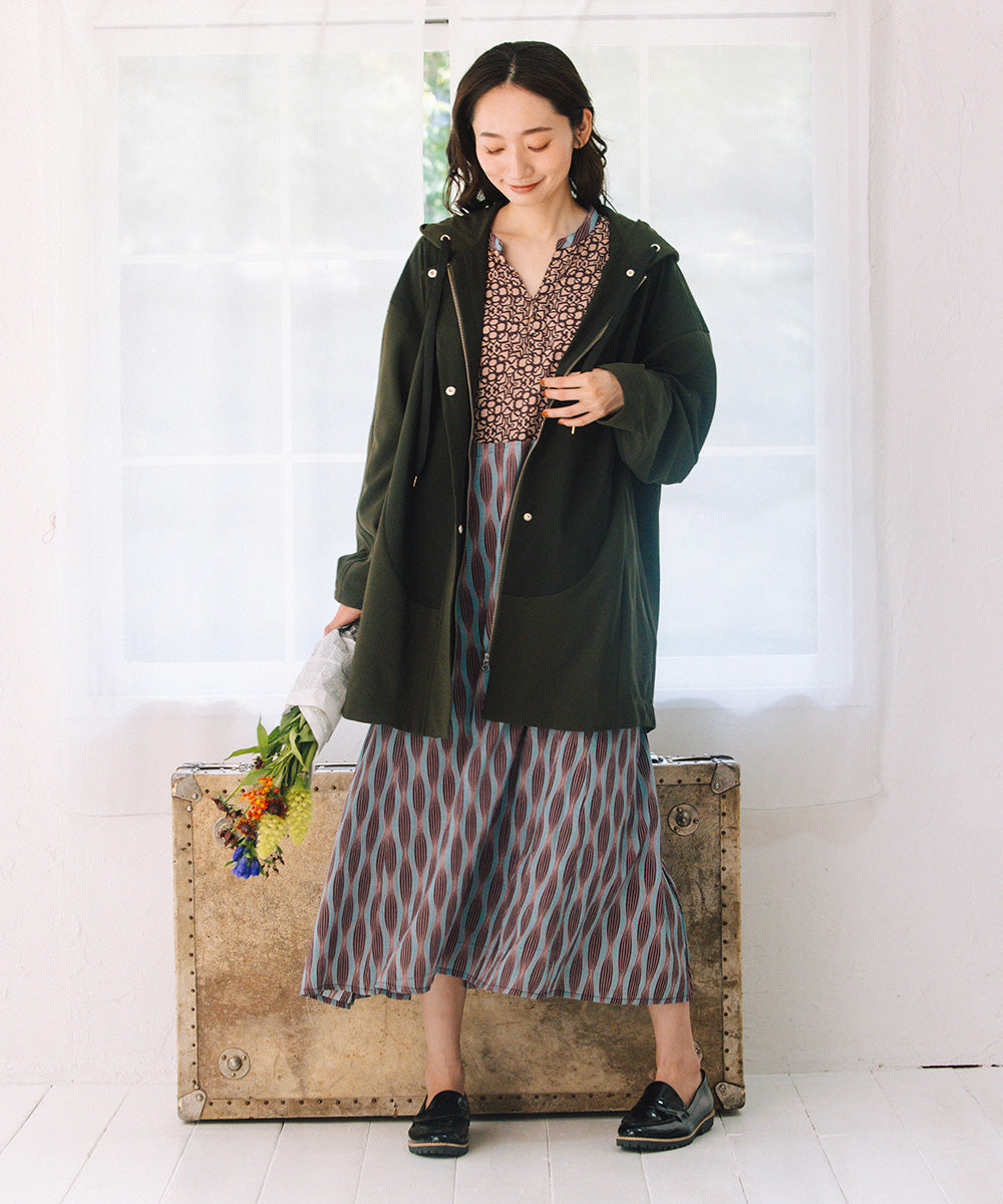 ロングスカートやワンピースに羽織れば、女性らしさを引き立てたミックススタイルに。