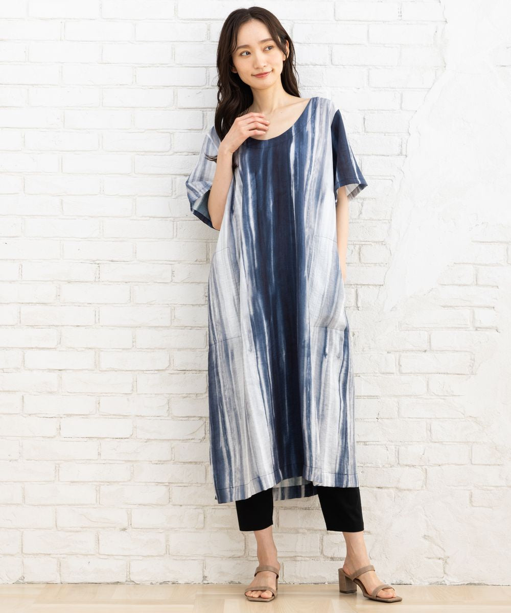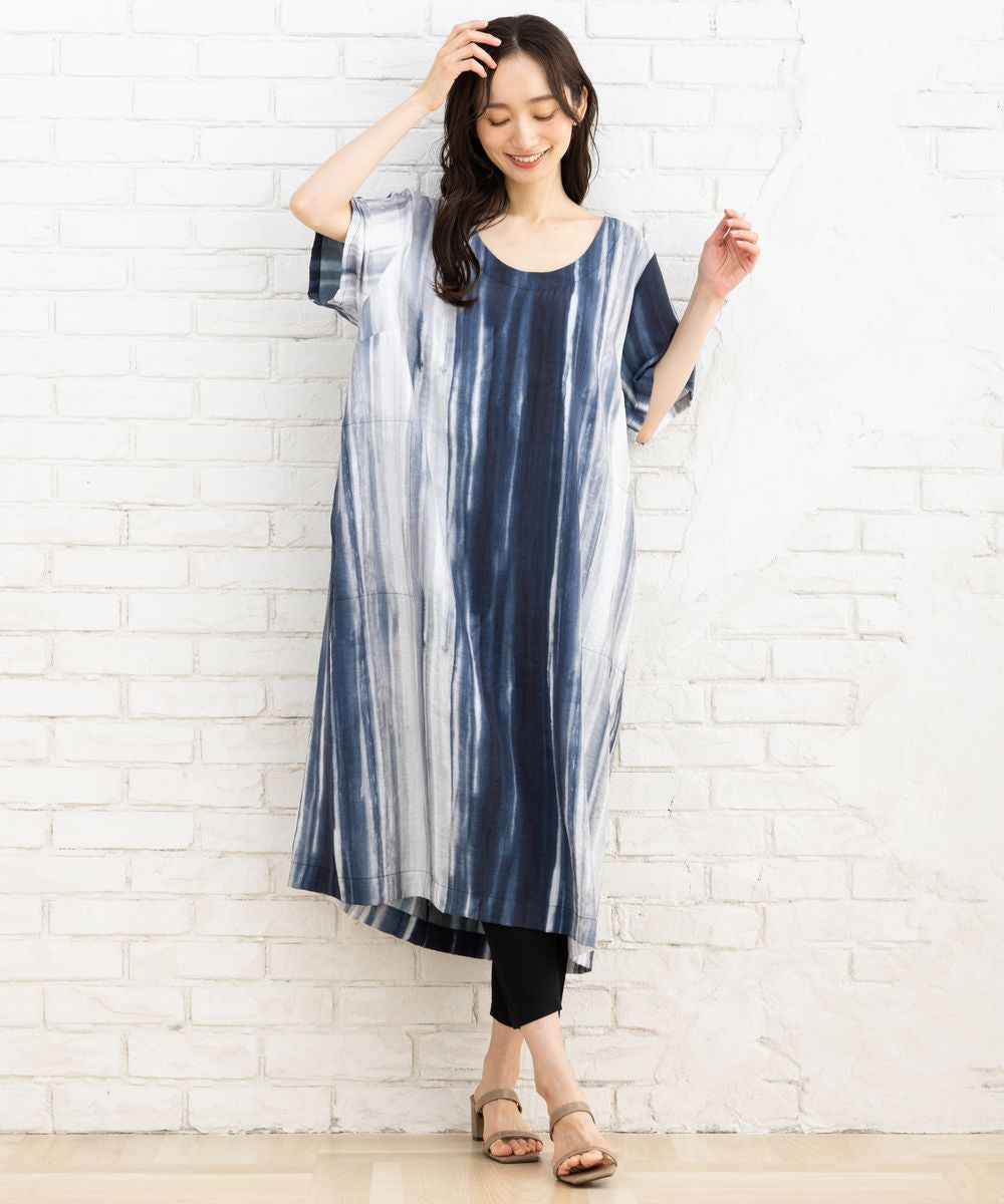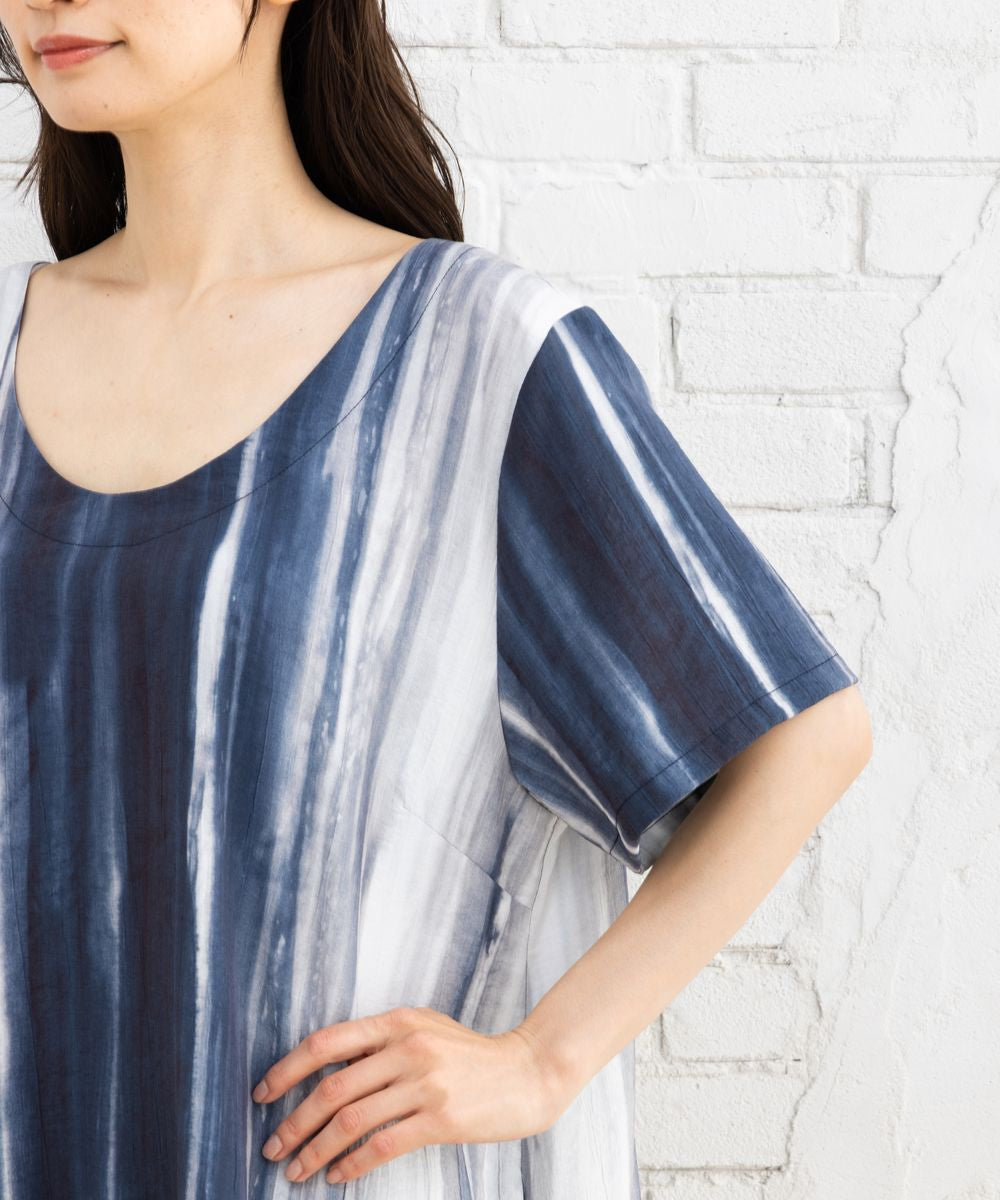 藍染のようなグラデーションのプリントが目を惹くワンピース。
