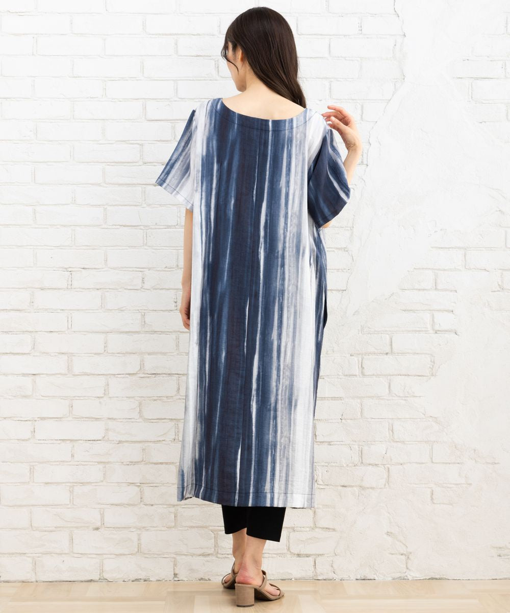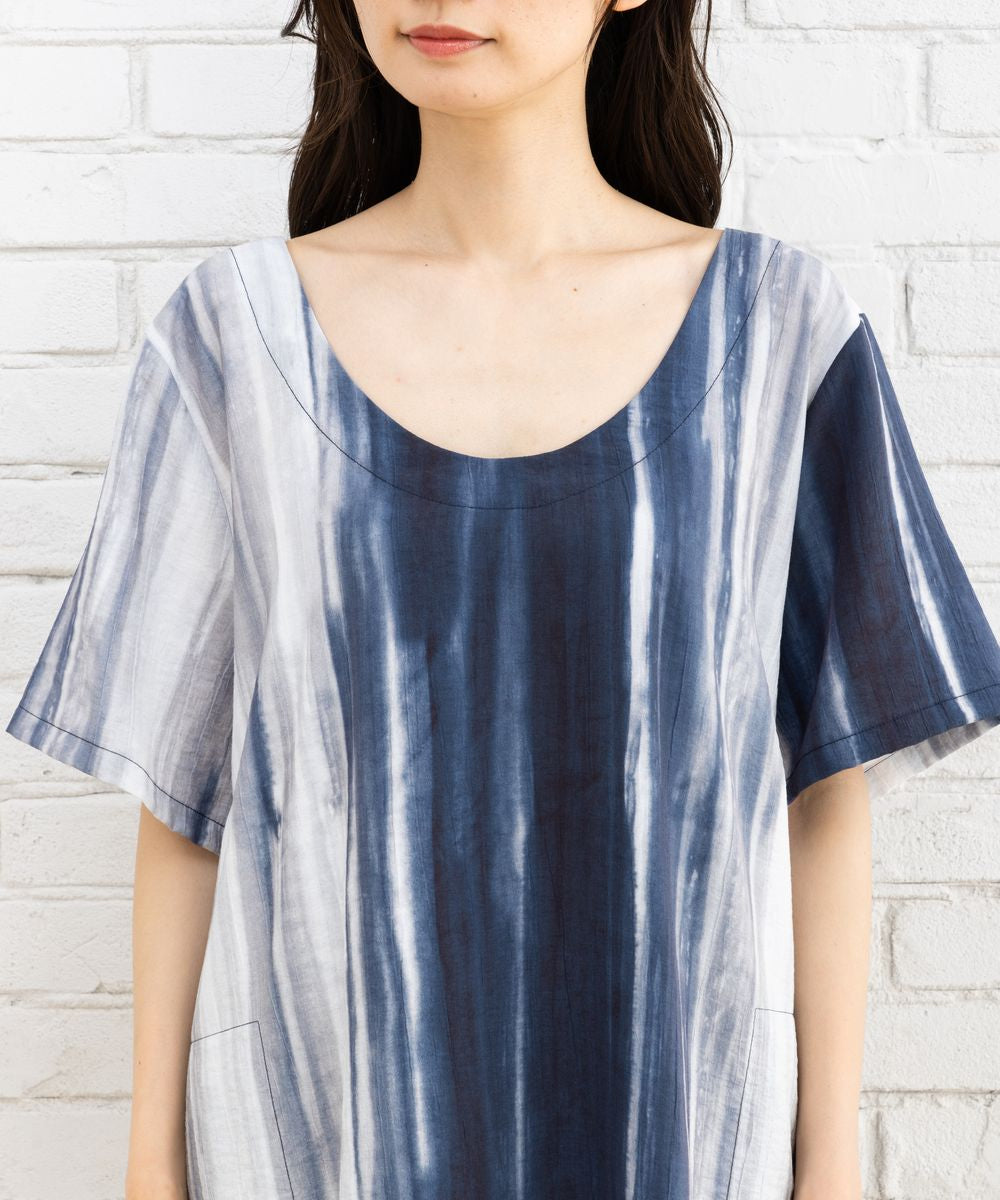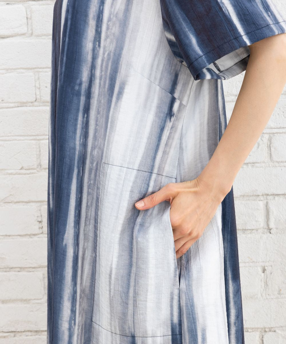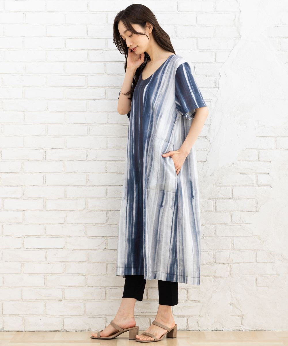 藍染のようなグラデーションのプリントが目を惹くワンピース。