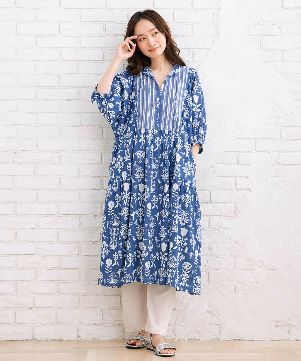 ヨークのストライプ柄が、ボタニカルプリントにメリハリをプラスし、リゾート感溢れる大人のスタイルを演出します。