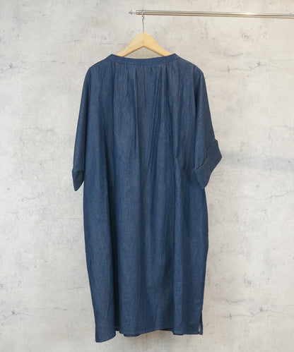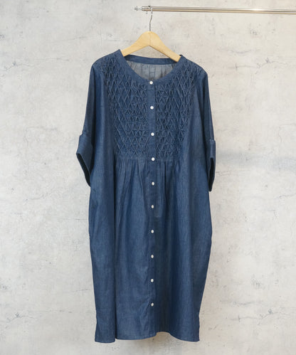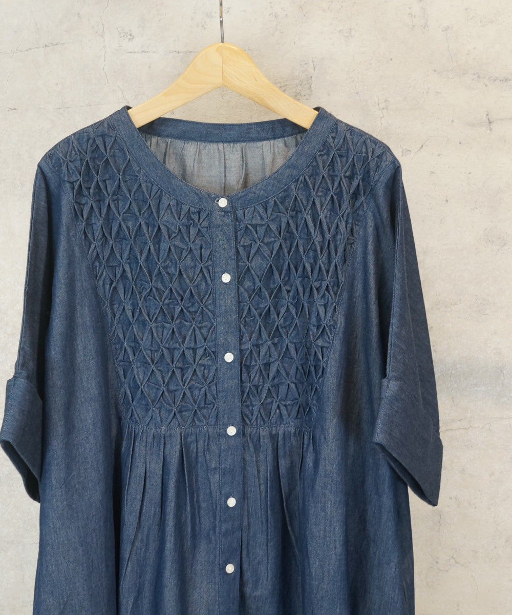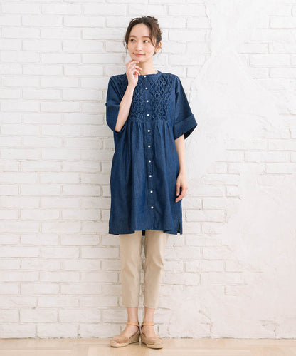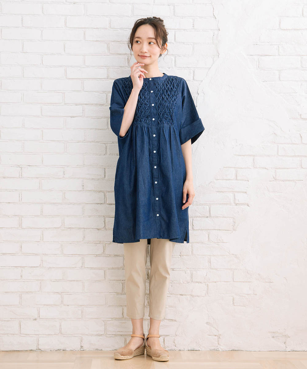胸元のハンドスモッキングが目を惹くライトデニムハンドスモッキングチュニック。