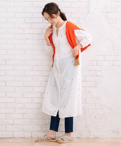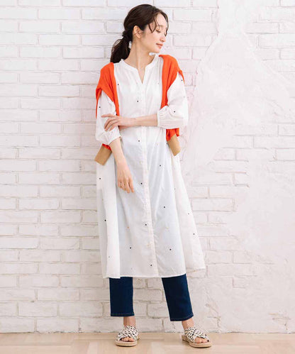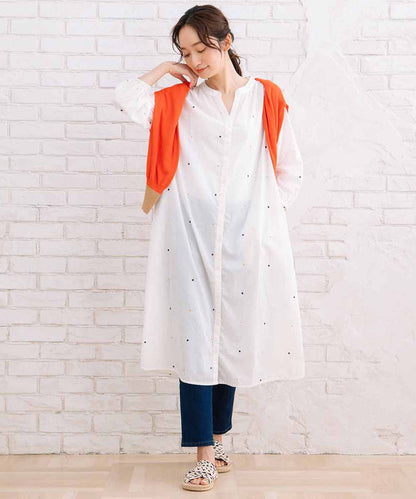 プリントと刺繍で表現されたドット柄が、シンプルな中に個性をプラスします。