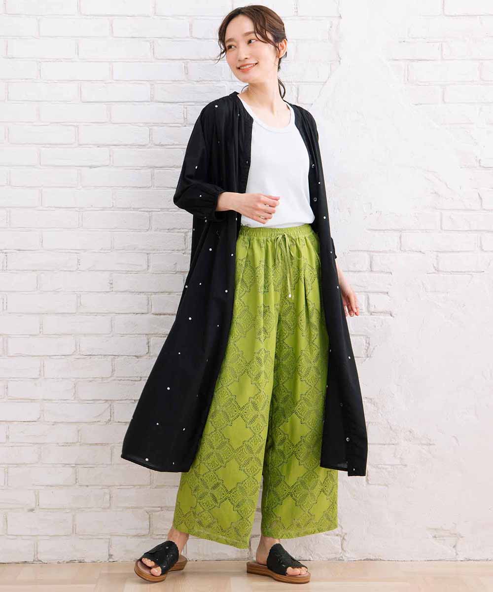 プリントと刺繍で表現されたドット柄が、シンプルな中に個性をプラスします。