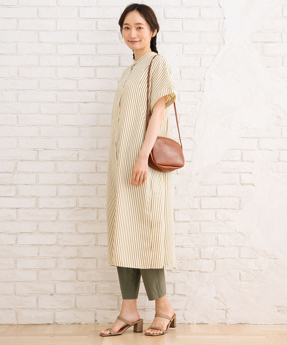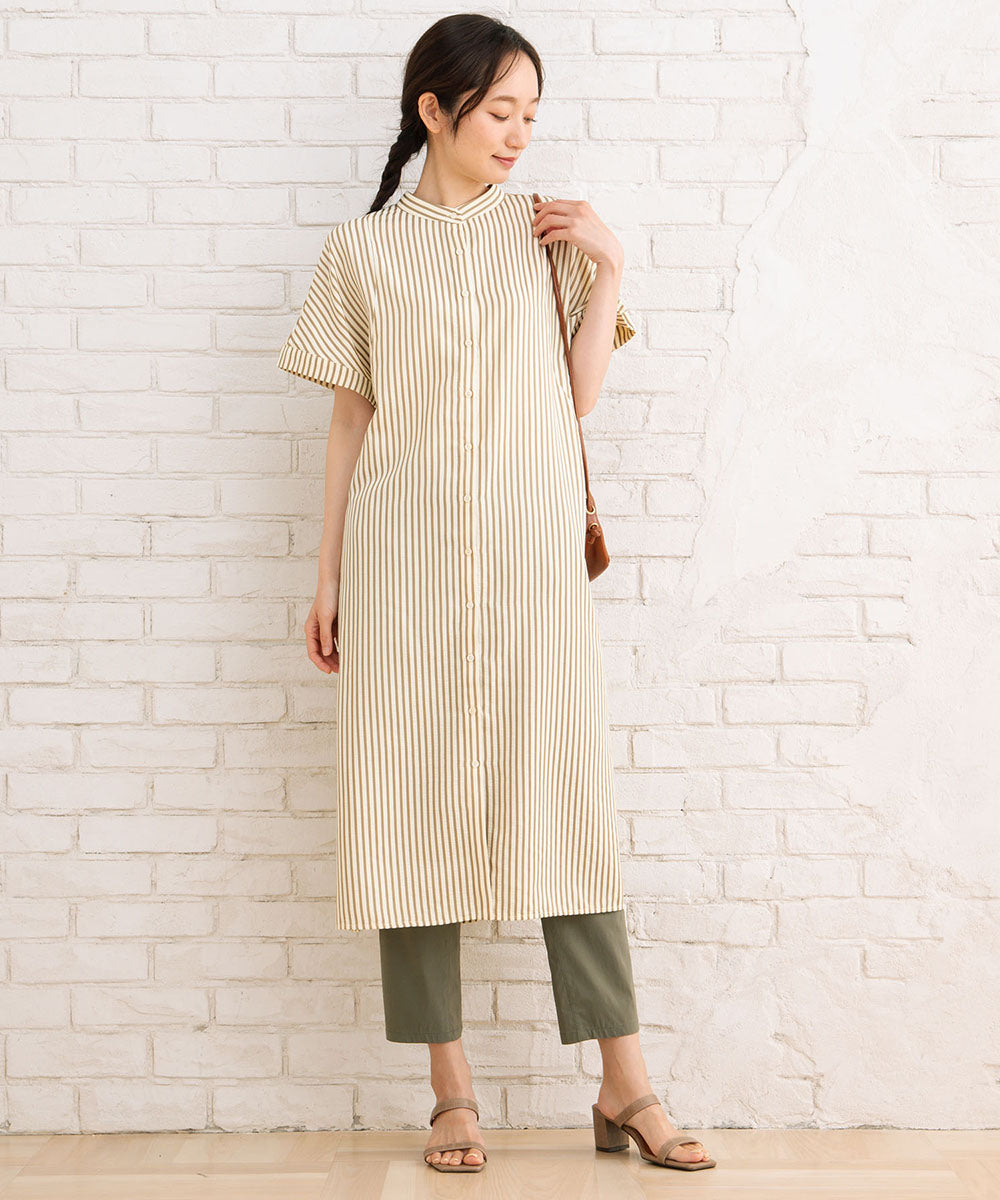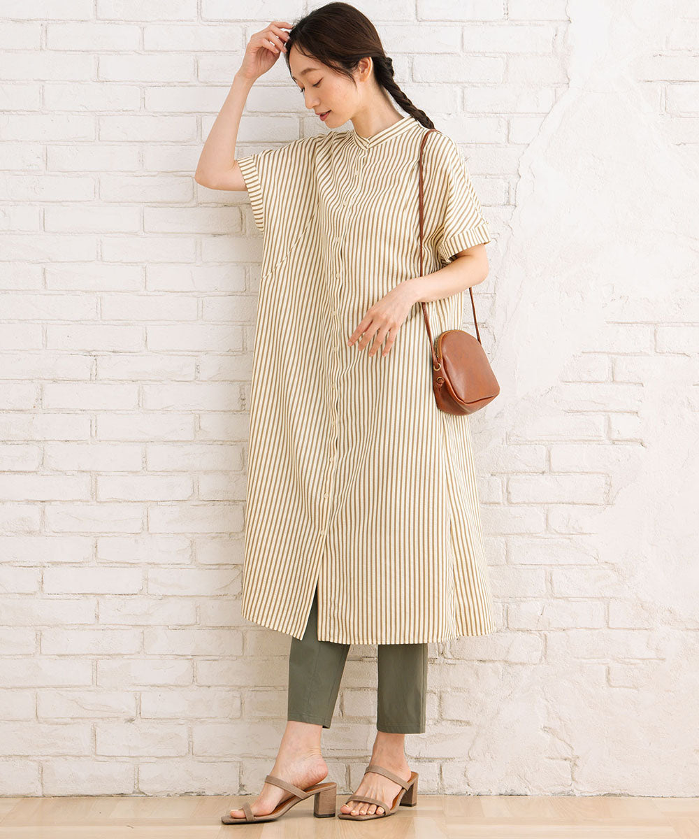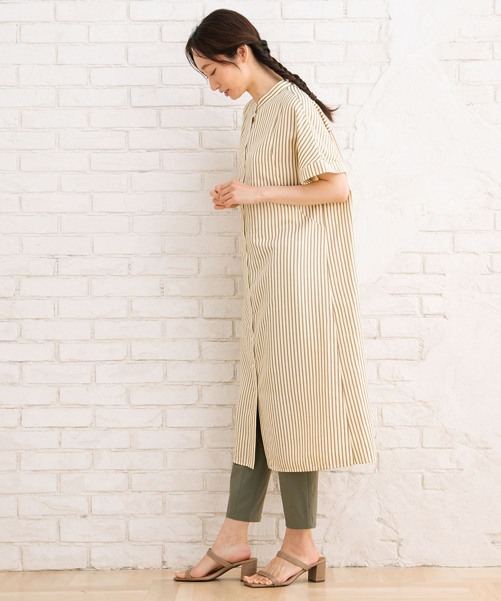首元はバンドカラーですっきりと、前開きボタン仕様で羽織としても使える万能デザイン。